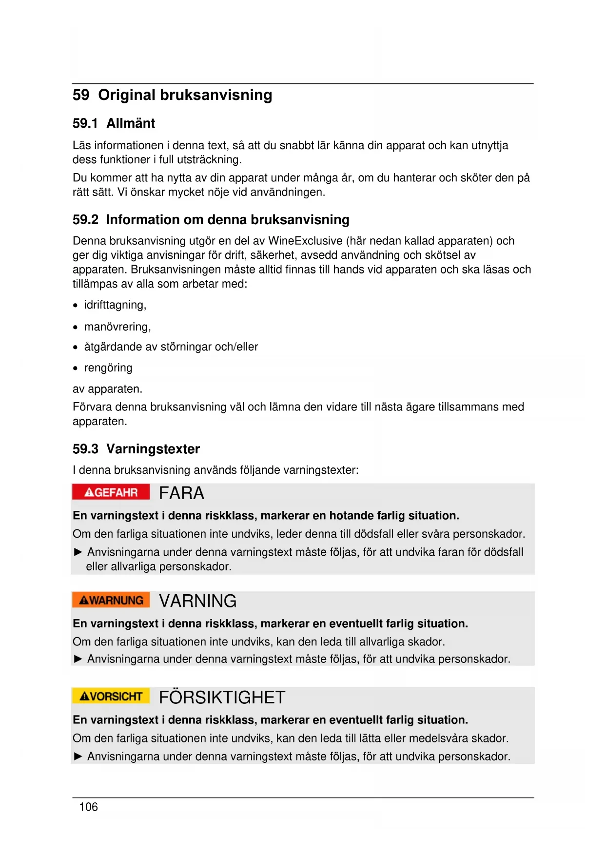 Denna bruksanvisning utgör en del av WineExclusive (här nedan kallad apparaten) och ger dig viktiga anvisningar för drift, säkerhet, avsedd användning och skötsel av apparaten. Bruksanvisningen måste alltid finnas till hands vid apparaten och ska läsas och tillämpas av alla som arbetar med:
