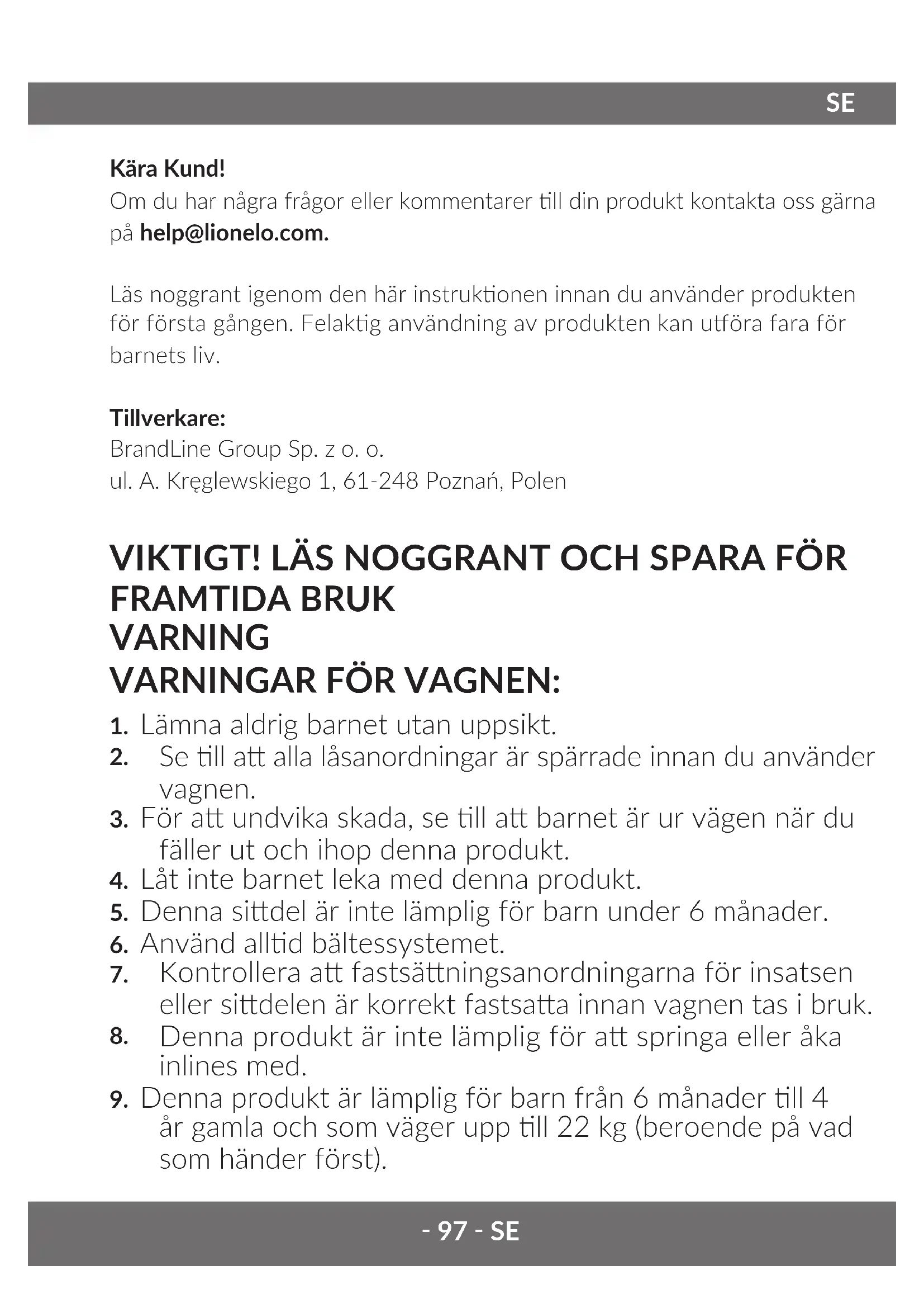 Kära Kund! Om du har några frågor eller kommentarer ll din produkt kontakta oss gärna på help@lionelo.com. Läs noggrant igenom den här instrukonen innan du använder produkten för första gången. Felakg användning av produkten kan uöra fara för barnets liv. Tillverkare: BrandLine Group Sp. z o. o. ul. A. Kręglewskiego 1, 61-248 Poznań, Polen VIKTIGT! LÄS NOGGRANT OCH SPARA FÖR FRAMTIDA BRUK VARNING VARNINGAR FÖR VAGNEN: