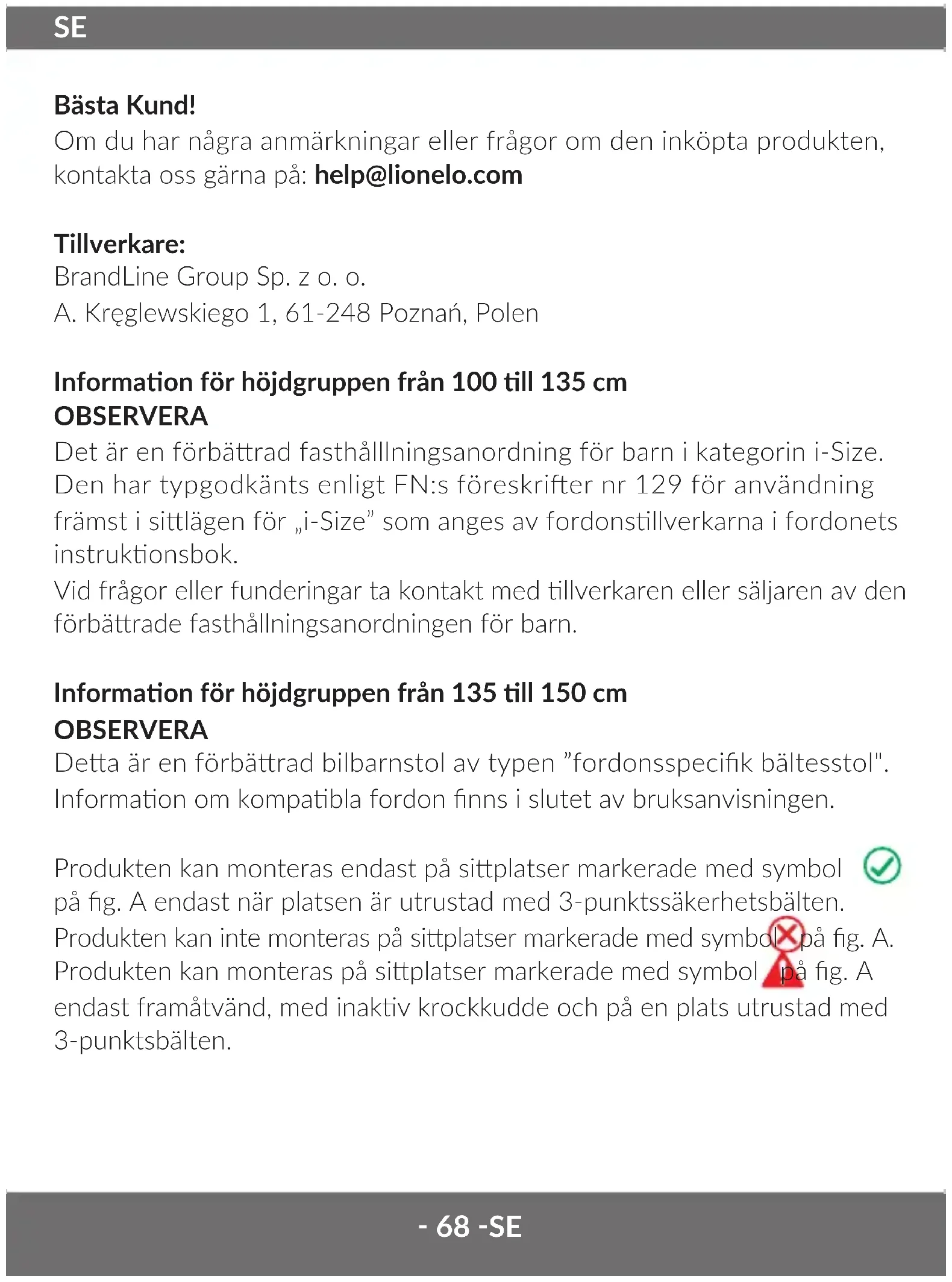 Bästa Kund! Om du har några anmärkningar eller frågor om den inköpta produkten, kontakta oss gärna på: help@lionelo.com Tillverkare: BrandLine Group Sp. z o. o. A. Kręglewskiego 1, 61-248 Poznań, Polen Informaon för höjdgruppen från 100 ll 135 cm OBSERVERA Det är en förbärad fasthålllningsanordning för barn i kategorin i-Size. Den har typgodkänts enligt FN:s föreskrier nr 129 för användning främst i silägen för „i-Size” som anges av fordonsllverkarna i fordonets instrukonsbok. Vid frågor eller funderingar ta kontakt med llverkaren eller säljaren av den förbärade fasthållningsanordningen för barn. Informaon för höjdgruppen från 135 ll 150 cm OBSERVERA Dea är en förbärad bilbarnstol av typen ”fordonsspecik bältesstol". Informaon om kompabla fordon nns i slutet av bruksanvisningen. Produkten kan monteras endast på siplatser markerade med symbol på g. A endast när platsen är utrustad med 3-punktssäkerhetsbälten. Produkten kan inte monteras på siplatser markerade med symbol på g. A. Produkten kan monteras på siplatser markerade med symbol på g. A endast framåtvänd, med inakv krockkudde och på en plats utrustad med 3-punktsbälten.‑ 69 ‑ SE VARNINGAR