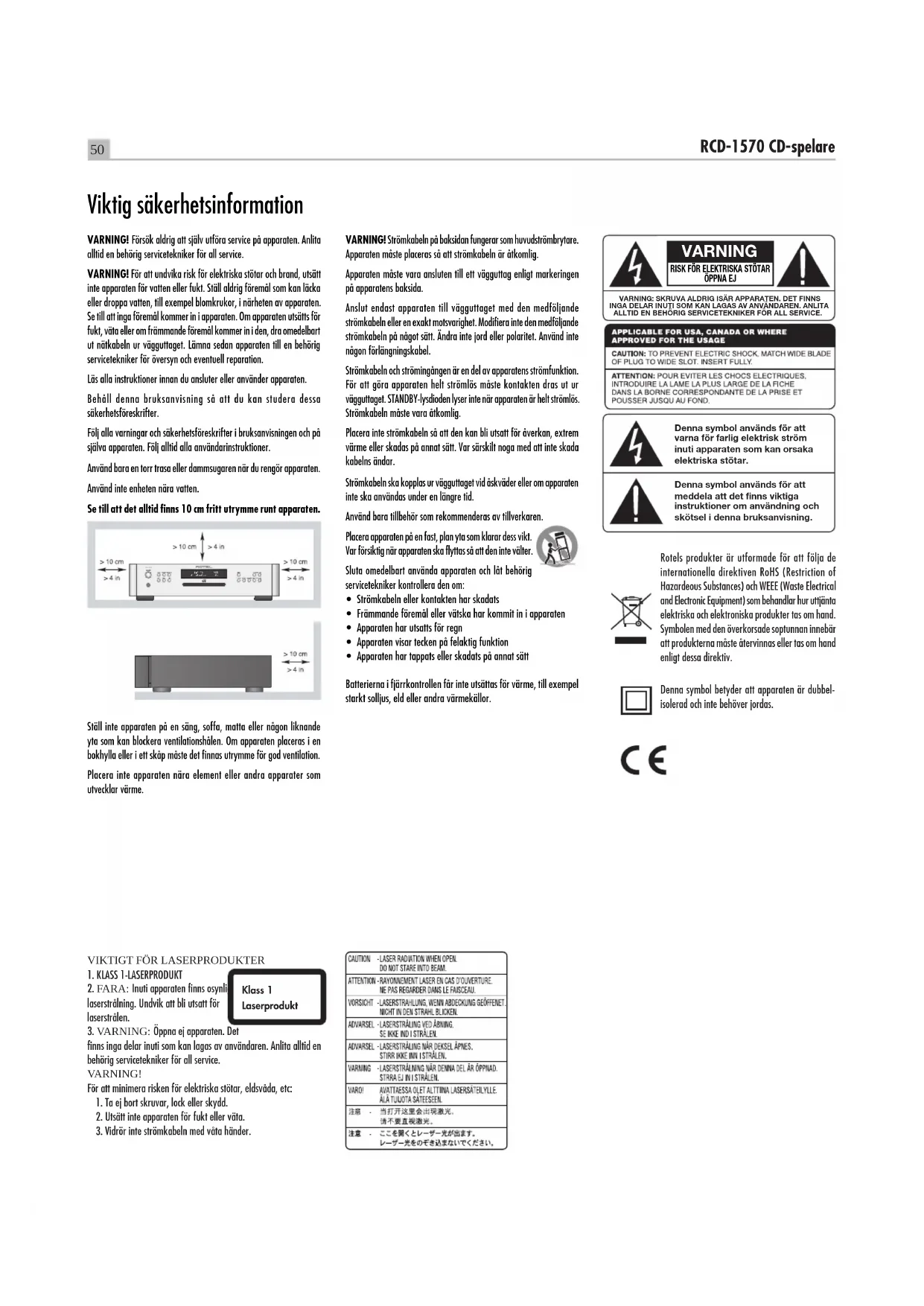 del telecomando. Risoluzione dei problemi La maggior parte dei problemi nei sistemi audio è dovuta a collegamenti non corretti o regolazioni errate. Se si riscontrano problemi, isolare l’area interessata, verificare le impostazioni, quindi determinarne la causa ed apportare le necessarie correzioni. Qualora non si riuscisse a risolvere il problema, provare con i suggerimenti qui riportati. L’indicatore di accensione non si illumina L’indicatore che segnala l’accensione dovrebbe illuminarsi ogni volta che l’apparecchio viene collegato alla rete elettrica ed acceso. Se non si illumina controllare la presa di alimentazione con un altro apparecchio elettrico, come ad esempio una lampada. Assicurarsi che la presa di alimentazione in uso non sia controllata da un interruttore disattivato. Sostituzione del fusibile Se un altro dispositivo elettrico collegato alla stessa presa di alimentazione funziona regolarmente mentre l’indicatore frontale ed il display dell’RCD-1570 non si illuminano dopo aver accesso il lettore, con ogni probabilità si è interrotto il fusibile di protezione interno. In tale eventualità contattare il rivenditore Rotel per la sostituzione del fusibile. Nessun suono Controllare i cavi di collegamento tra le uscite dell’RCD-1570 e gli ingressi dell’amplificatore ed assicurarsi che siano connessi correttamente. Verificare che sull’amplificatore sia stato selezionato l’ingresso cui fa capo il lettore cd e che il selettore registratore sia su ‘Source’. Controllare i cavi di collegamento tra amplificatore e diffusori. Caratteristiche tecniche Distorsione armonica totale + rumore 0.0045% a 1 kHzRisposta in frequenza ((±0,5 db) 20-20,000 HzBilanciamento tra i canali ± 0,5 dBSeparazione tra i canali > 98 dB a 1 kHzRapporto Segnale/Rumore > 100 dBGamma dinamica > 96 dBConvertitori D/A WolfsonLivello segnale uscite analogiche/impedenza (0 dBfs) Uscite non bilanciate (RCA) 2 V / 100 ohm Uscite bilanciate (XLR) 4 V / 200 ohmLivello uscita digitale (elettrica coassiale) 0,5 Volt, picco-piccoImpedenza di carico 75 OhmAlimentazione Versione mercato USA AC 120V, 60 Hz Versione mercati europei AC 230V, 50 HzAssorbimento 15 WDimensioni (L x A x P) 431 x 99 x 320 mmAltezza panello frontale 88,1 mm / 2 unità rackPeso (netto) 6,7 KgTutte le caratteristiche dichiarate sono esatte al momento della stampa.Rotel si riserva il diritto di apportare miglioramenti senza alcun preavviso.Rotel e il logo Rotel HiFi sono marchi registrati della The Rotel Co. Ltd.Tokyo Japan.50 RCD-1570 CD-spelare VARNING! Försök aldrig att själv utföra service på apparaten. Anlita alltid en behörig servicetekniker för all service. VARNING! För att undvika risk för elektriska stötar och brand, utsätt inte apparaten för vatten eller fukt. Ställ aldrig föremål som kan läcka eller droppa vatten, till exempel blomkrukor, i närheten av apparaten. Se till att inga föremål kommer in i apparaten. Om apparaten utsätts för fukt, väta eller om främmande föremål kommer in i den, dra omedelbart ut nätkabeln ur vägguttaget. Lämna sedan apparaten till en behörig servicetekniker för översyn och eventuell reparation. Läs alla instruktioner innan du ansluter eller använder apparaten. Behåll denna bruksanvisning så att du kan studera dessa säkerhetsföreskrifter. Följ alla varningar och säkerhetsföreskrifter i bruksanvisningen och på själva apparaten. Följ alltid alla användarinstruktioner. Använd bara en torr trasa eller dammsugaren när du rengör apparaten. Använd inte enheten nära vatten. Se till att det alltid finns 10 cm fritt utrymme runt apparaten. Ställ inte apparaten på en säng, soffa, matta eller någon liknande yta som kan blockera ventilationshålen. Om apparaten placeras i en bokhylla eller i ett skåp måste det finnas utrymme för god ventilation. Placera inte apparaten nära element eller andra apparater som utvecklar värme. Rotels produkter är utformade för att följa de internationella direktiven RoHS (Restriction of Hazardeous Substances) och WEEE (Waste Electrical and Electronic Equipment) som behandlar hur uttjänta elektriska och elektroniska produkter tas om hand. Symbolen med den överkorsade soptunnan innebär att produkterna måste återvinnas eller tas om hand enligt dessa direktiv. Denna symbol betyder att apparaten är dubbel- isolerad och inte behöver jordas. Viktig säkerhetsinformation VARNING! Strömkabeln på baksidan fungerar som huvudströmbrytare. Apparaten måste placeras så att strömkabeln är åtkomlig. Apparaten måste vara ansluten till ett vägguttag enligt markeringen på apparatens baksida. Anslut endast apparaten till vägguttaget med den medföljande strömkabeln eller en exakt motsvarighet. Modifiera inte den medföljande strömkabeln på något sätt. Ändra inte jord eller polaritet. Använd inte någon förlängningskabel. Strömkabeln och strömingången är en del av apparatens strömfunktion. För att göra apparaten helt strömlös måste kontakten dras ut ur vägguttaget. STANDBY-lysdioden lyser inte när apparaten är helt strömlös. Strömkabeln måste vara åtkomlig. Placera inte strömkabeln så att den kan bli utsatt för åverkan, extrem värme eller skadas på annat sätt. Var särskilt noga med att inte skada kabelns ändar. Strömkabeln ska kopplas ur vägguttaget vid åskväder eller om apparaten inte ska användas under en längre tid. Använd bara tillbehör som rekommenderas av tillverkaren. Placera apparaten på en fast, plan yta som klarar dess vikt. Var försiktig när apparaten ska flyttas så att den inte välter. Sluta omedelbart använda apparaten och låt behörig servicetekniker kontrollera den om:
