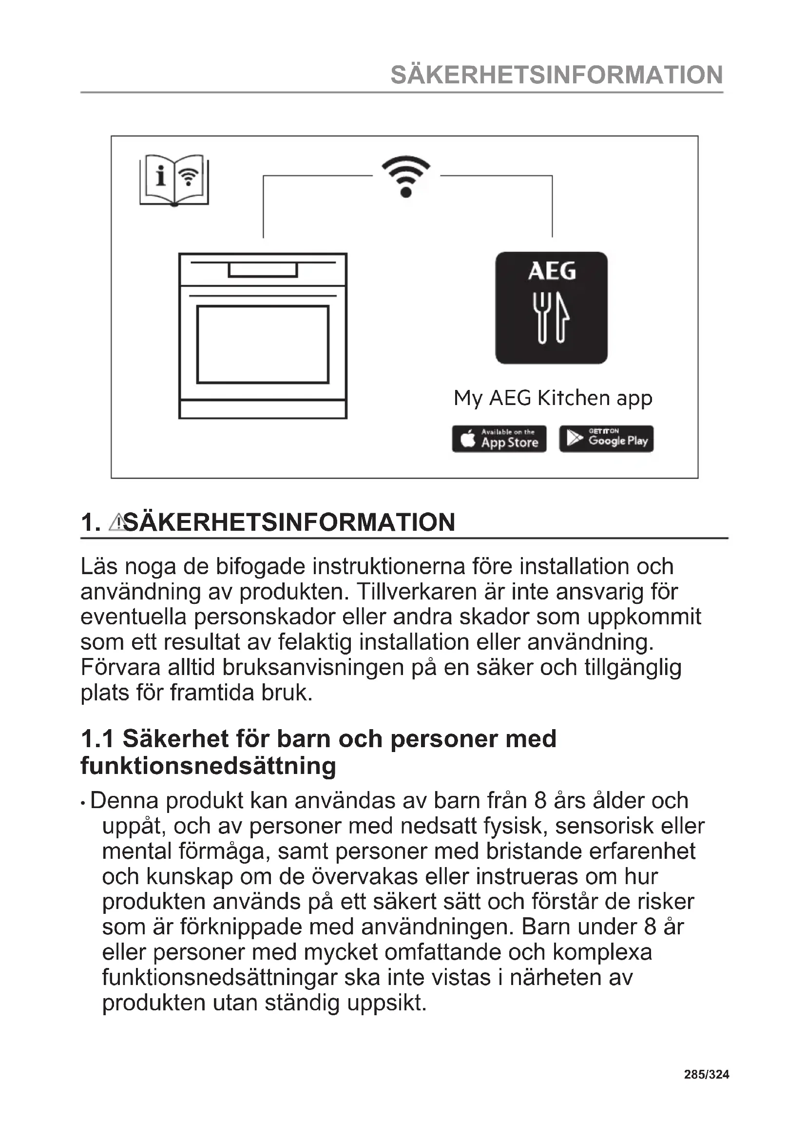 - Denna produkt kan användas av barn från 8 års ålder och uppåt, och av personer med nedsatt fysisk, sensorisk eller mental förmåga, samt personer med bristande erfarenhet och kunskap om de övervakas eller instrueras om hur produkten används på ett säkert sätt och förstår de risker som är förknippade med användningen. Barn under 8 år eller personer med mycket omfattande och komplexa funktionsnedsättningar ska inte vistas i närheten av produkten utan ständig uppsikt. 285/324 SÄKERHETSINFORMATION• Barn ska hållas under uppsikt så att de inte leker med produkten och mobilenheter med My AEG Kitchen .