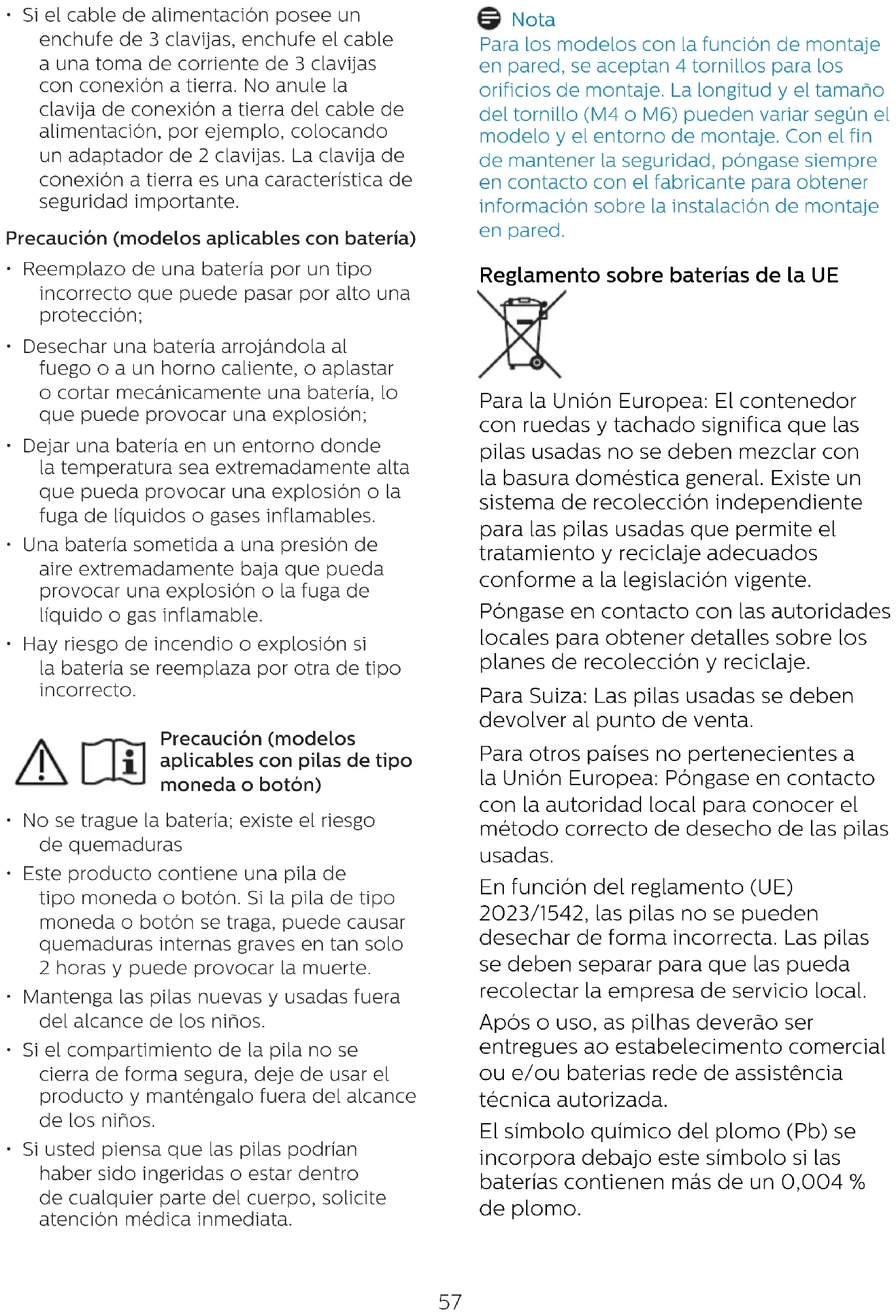 - Uppsök genast läkare om du tror att batterier kan ha svalts eller stoppats in i någon del av kroppen. Obs För modeller med väggmonteringsfunktion accepteras 4 st skruvar för monteringshålen. Skruvens längd och storlek (M4 eller M6) kan variera beroende på olika modeller och olika monteringsmiljöer. För att upprätthålla säkerheten ska du alltid kontakta tillverkaren vid väggmontering. EU:s batteriförordning För EU: Den överkorsade soptunnan innebär att förbrukade batterier inte får slängas i det vanliga hushållsavfallet! Det finns ett separat insamlingssystem för förbrukade batterier för att möjliggöra korrekt behandling och återvinning i enlighet med lagstiftningen. Kontakta din lokala myndighet för information om insamlings- och återvinningssystem. För Schweiz: Det förbrukade batteriet skall återlämnas till försäljningsstället. För andra länder utanför EU: Kontakta din kommun för korrekt avfallshantering av det förbrukade batteriet. Enligt förordning (EU) 2023/1542 får batteriet inte kasseras på ett felaktigt sätt. Batteriet skall separeras för insamling av lokal service. Após o uso, as pilhas deverão ser entregues ao estabelecimento comercial ou e/ou baterias rede de assistência técnica autorizada. Den kemiska symbolen för bly (Pb) läggs till under denna symbol om batteriet innehåller mer än 0,004 % bly.60