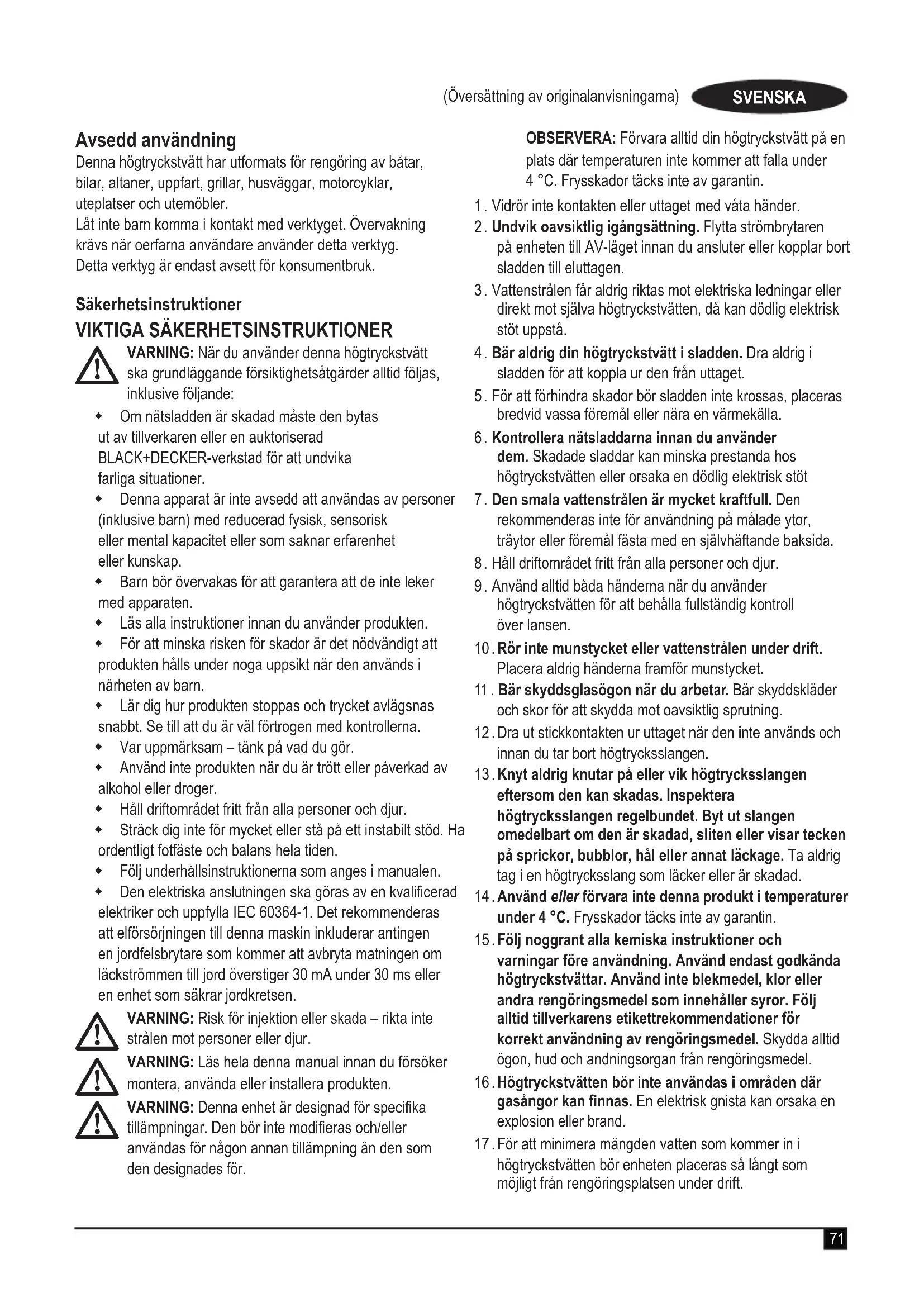 VARNING: När du använder denna högtryckstvätt ska grundläggande försiktighetsåtgärder alltid följas, inklusive följande: Om nätsladden är skadad måste den bytas ut av tillverkaren eller en auktoriserad BLACK+DECKER‑verkstad för att undvika farliga situationer. Denna apparat är inte avsedd att användas av personer (inklusive barn) med reducerad fysisk, sensorisk eller mental kapacitet eller som saknar erfarenhet eller kunskap. Barn bör övervakas för att garantera att de inte leker med apparaten. Läs alla instruktioner innan du använder produkten. För att minska risken för skador är det nödvändigt att produkten hålls under noga uppsikt när den används i närheten av barn. Lär dig hur produkten stoppas och trycket avlägsnas snabbt. Se till att du är väl förtrogen med kontrollerna. Var uppmärksam – tänk på vad du gör. Använd inte produkten när du är trött eller påverkad av alkohol eller droger. Håll driftområdet fritt från alla personer och djur. Sträck dig inte för mycket eller stå på ett instabilt stöd. Ha ordentligt fotfäste och balans hela tiden. Följ underhållsinstruktionerna som anges i manualen. Den elektriska anslutningen ska göras av en kvalicerad elektriker och uppfylla IEC 60364‑1. Det rekommenderas att elförsörjningen till denna maskin inkluderar antingen en jordfelsbrytare som kommer att avbryta matningen om läckströmmen till jord överstiger 30 mA under 30 ms eller en enhet som säkrar jordkretsen.