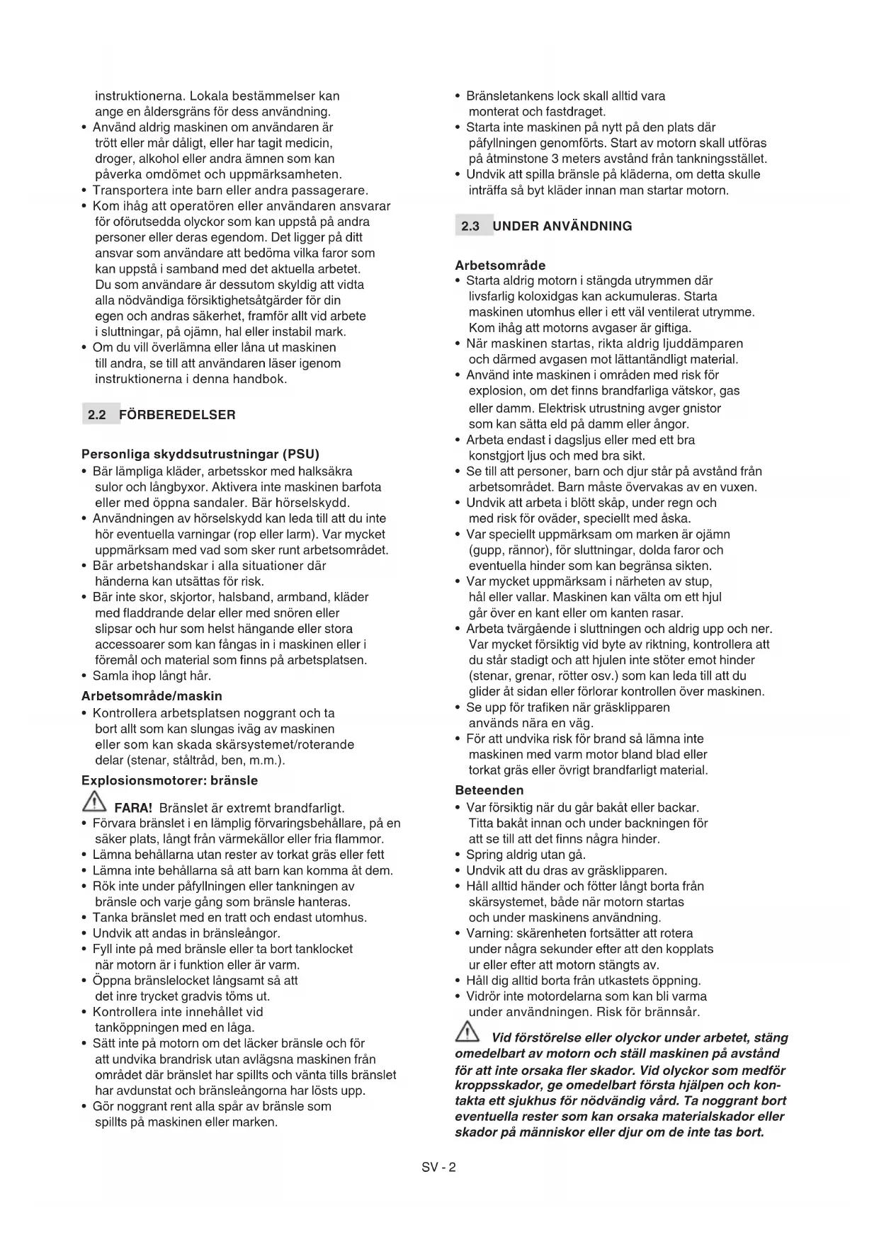 - Vidrör inte motordelarna som kan bli varma under användningen. Risk för brännsår. Vid förstörelse eller olyckor under arbetet, stäng omedelbart av motorn och ställ maskinen på avstånd för att inte orsaka er skador. Vid olyckor som medför kroppsskador, ge omedelbart första hjälpen och kon- takta ett sjukhus för nödvändig vård. Ta noggrant bort eventuella rester som kan orsaka materialskador eller skador på människor eller djur om de inte tas bort.SV - 3 Begränsad användning