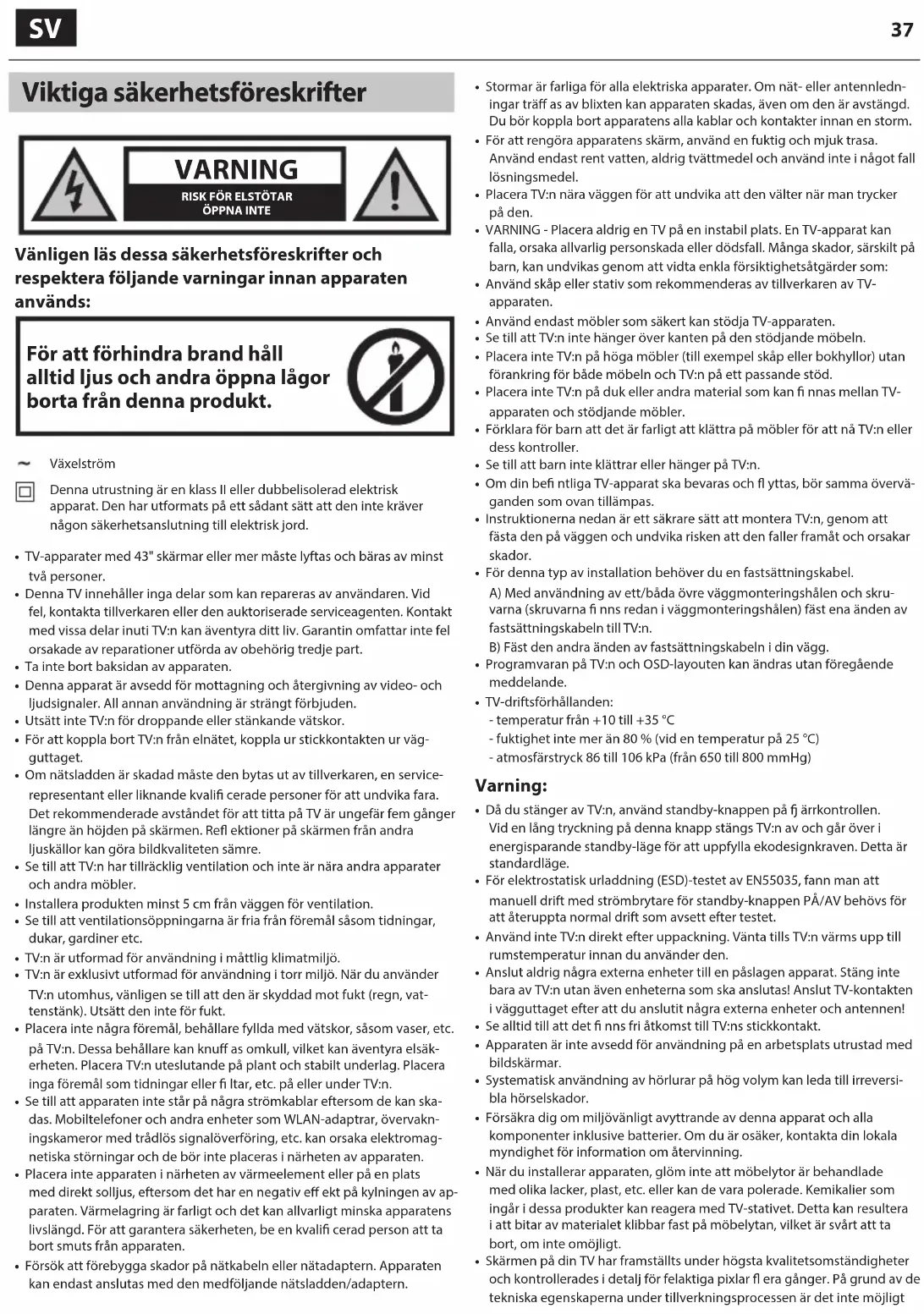 - VARNING - Placera aldrig en TV på en instabil plats. En TV-apparat kan falla, orsaka allvarlig personskada eller dödsfall. Många skador, särskilt på barn, kan undvikas genom att vidta enkla försiktighetsåtgärder som: