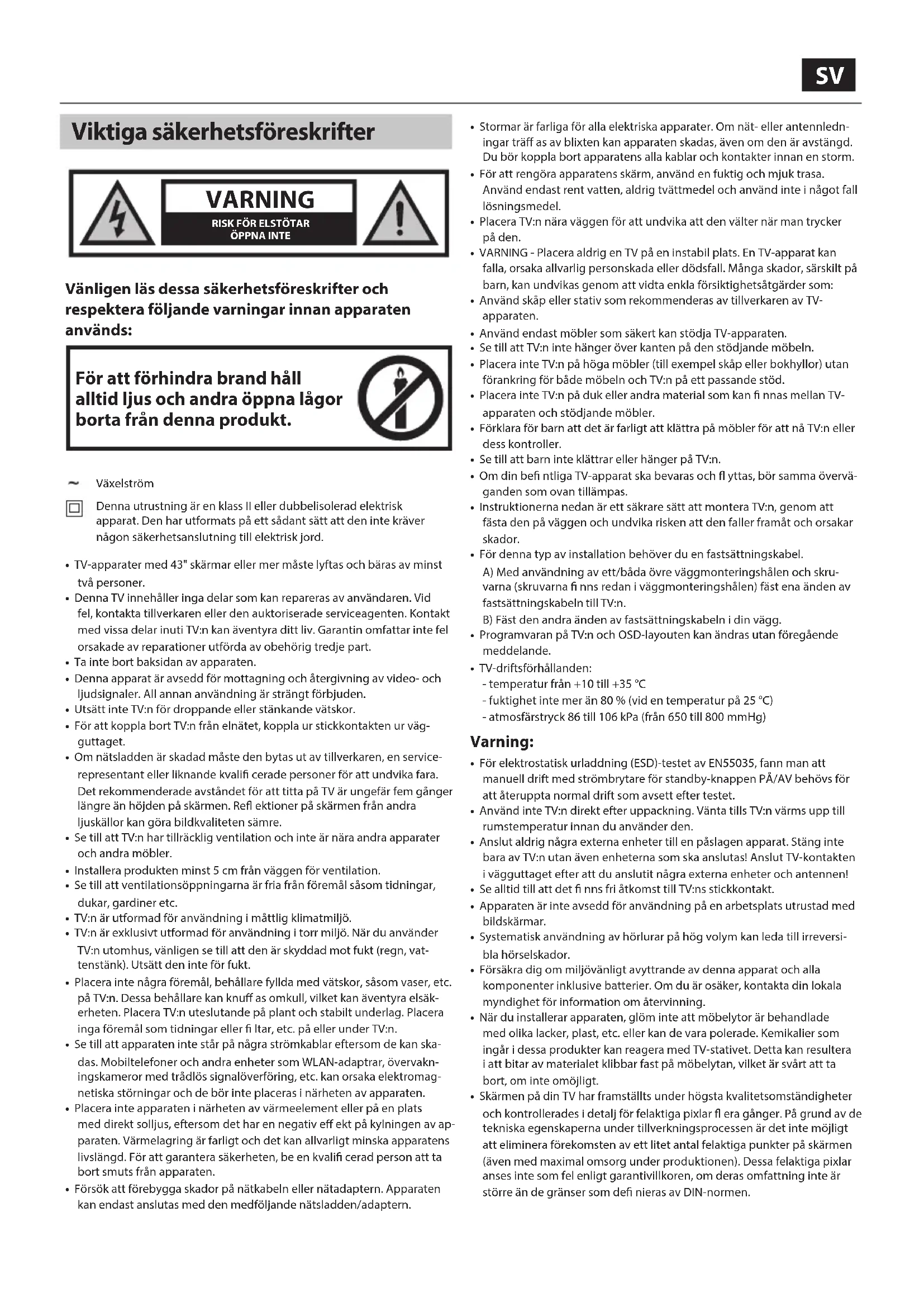 - - valgfritt TV-meny For å få tilgang til denne menyen, trykk på [MENU]-knappen på ernkontrollen. Trykk på [OK] for å gå inn i menyen. Hvis du ønsker å endre standardinnstillingene, bruk (▲/▼/◄/►). Trykk på [OK] hvis du ønsker å bekrefte noen innstillinger. Trykk på [EXIT]-knappen, hvis du ønsker å gå ut av denne menyen. Elektronisk instruksjonshåndbok For å starte håndboken på nettet, trykk på [MENU]-knappen og velg deretter Innstillinger > Oppsett > Hjelpinformasjon. Fjernkontroll Se i skjermhåndboken på TV. Avspillingsmerknad for USB-media Denne TV-en støtter avspilling av mange forskjellige ltyper fra en USB- stasjon. Av hensyn til datavern begrenser imidlertid Google de støttede typene lsystemer. For å spille av media fra en USB-minneenhet, må USB-stasjonen være formatert til et FAT16- eller FAT32- lsystem. NTFS støttes ikke.SVSV Viktiga säkerhetsföreskrifter VARNING RISK FÖR ELSTÖTARÖPPNA INTE Vänligen läs dessa säkerhetsföreskrifter och respektera följande varningar innan apparaten används: För att förhindra brand håll alltid ljus och andra öppna lågor borta från denna produkt. Växelström Denna utrustning är en klass II eller dubbelisolerad elektrisk apparat. Den har utformats på ett sådant sätt att den inte kräver någon säkerhetsanslutning till elektrisk jord.
