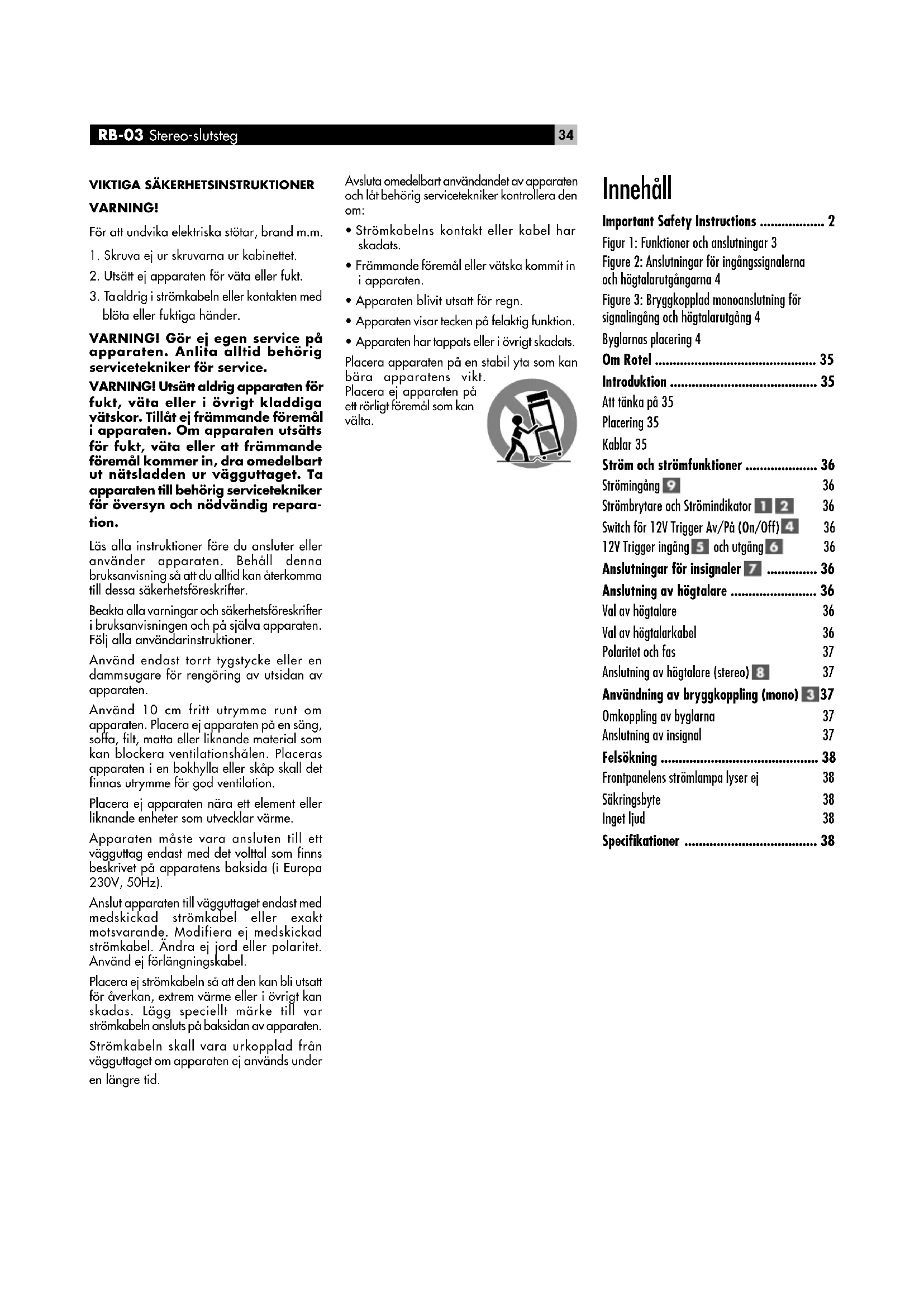 - Apparaten har tappats eller i övrigt skadats. Placera apparaten på en stabil yta som kan bära apparatens vikt. Placera ej apparaten på ett rörligt föremål som kan välta. Innehåll Important Safety Instructions .................. 2 Figur 1: Funktioner och anslutningar 3 Figure 2: Anslutningar för ingångssignalerna och högtalarutgångarna 4 Figure 3: Bryggkopplad monoanslutning för signalingång och högtalarutgång 4 Byglarnas placering 4 Om Rotel ............................................. 35 Introduktion ......................................... 35 Att tänka på 35 Placering 35 Kablar 35 Ström och strömfunktioner .................... 36 Strömingång 36 Strömbrytare och Strömindikator 36 Switch för 12V Trigger Av/På (On/Off) 36 12V Trigger ingång och utgång 36 Anslutningar för insignaler .............. 36 Anslutning av högtalare ........................ 36 Val av högtalare 36 Val av högtalarkabel 36 Polaritet och fas 37 Anslutning av högtalare (stereo) 37 Användning av bryggkoppling (mono) 37 Omkoppling av byglarna 37 Anslutning av insignal 37 Felsökning ............................................ 38 Frontpanelens strömlampa lyser ej 38 Säkringsbyte 38 Inget ljud 38 Specifikationer ..................................... 3835 Svenska Om Rotel En familj med ett passionerat intresse för musik grundade Rotel för över 40 år sedan. Det utmynnade i egen tillverkning av HiFi-produkter med en kvalitet utan kompromisser. Genom alla år har denna passion för musik varit oförändrad och målet har alltid varit att producera prisvärda produkter för både audiofiler och musikälskare. Detta är också Rotels hela personal delaktiga i. Rotels ingenjörer arbetar i team och har ett nära samarbete. De lyssnar på och finslipar varje ny produkt tills den når upp till deras krav på musikaliska kvalitet. De är fria att välja komponenter från hela världen i syfte att göra produkten så bra som möjligt. Kondensatorer från Storbritannien och Tyskland, halvledare från Japan och USA, medans toroidal- transformatorerna tillverkas i Rotels egna fabriker. Rotels goda rykte för kvalitet har förtjänats genom hundratals tester och erkännanden från HiFi-industrins seriösaste recensenter som lyssnar på musik varje dag. Deras erkännande håller företaget Rotel troget sitt mål att ta fram produkter som är musikaliska, pålitliga och prisvärda. Alla vi på Rotel är glada för att du valde Rotels produkt och hoppas att den kommer att ge dig många år av njutning och glädje Introduktion Tack för att du valde Rotel RB-03 stereo-slutsteg. Väl använd i ett kvalitetssystem för musik eller hemmabio kommer den att ge dig många år av musikalisk njutning. RB-03 är en komplett och högpresterande enhet. Alla områden gällande design, komponenter och funktionalitet har optimerats för att bevara dynamiken och nyanser i musiken. Med Rotels egentillverkade och specialbyggda torodial transformatorer har RB-03 en mycket kraftig uteffekt. Denna lågimpedanta strömförsörjning ger stora kraftresurser, vilket gör att RB-03 lätt kan återge de mest krävande audiosignaler som finns i musiken. Denna typ av konstruktion är dyrare men är bättre för musikåtergivning. Kretskorten är designade med ”Symmetrical Circuit Traces”. Detta garanterar att musikens kvalitet bibehålls och trovärdigt återskapas. Kretskorten i RB-03 är försedda med resistorer av metallfilm och kondensatorer av polystyren eller polypropylen i de viktiga signalvägarna. Alla aspekter gällande denna konstruktion har kontrollerats för att garantera den mest trovärdiga återgivningen av musiken. Huvudfunktionerna på RB-03 är både enkla att installera och att använda. Har du tidigare erfarenheter av HiFi-system kommer du inte att finna några konstigheter rörande RB-03. Anslut helt enkelt tillhörande HiFi-komponenter och njut av musiken. Att tänka på VARNING! För att undvika skador i ditt system: Stäng av ALLA enheter i systemet när du ansluter/kopplar ur högtalarna eller annan komponent. Aktivera ej någon enhet förrän du är helt säker på att anslutningarna är korrekt gjorda. Kontrollera högtalarkablarna extra noga. Det får inte finnas några lösa delar av kabeln som kan komma i kontakt med andra högtalarkablar eller chassit på slutsteget. Läs denna handbok noggrant. Den ger dig information om hur du bäst installerar och använder RB-03 i olika system för bästa ljudåtergivning. Kontakta din återförsäljare för Rotel om har fler frågor angående detta. Alla vi på Rotel välkomnar dina frågor och synpunkter. Spara kartongen och allt förpackningsmaterial till RB-03 för framtida behov. Att skicka eller flytta RB-03 i en annan förpackning kan skada apparaten allvarligt. Spara ditt originalkvitto från köptillfället. Det är det bästa beviset för inköpsdatum som du kan behöva i händelse av service och garanti anspråk. Placering Liksom andra ljudkomponenter som hanterar lågnivåsignaler kan RB-03 påverkas av sin omgivande miljö. Undvik att placera ovanpå andra komponenter. Detta kommer att minska möjligheten att apparaten plockar upp brum och störningar. RB-03 alstrar värme även vid normal användning. Kyldelarna och ventilationshålen är konstruerade för att avlägsna denna värme. Ventilationshålen på apparatens ovansida får ej täckas över. Det måste finnas 10 cm fritt utrymme runt om apparaten och tillräckligt med lufttillförsel för att förhindra att apparaten överhettas. Var noga med att apparatens vikt kan bäras av hyllan den skall placeras på. Vi rekommenderar att placera RA-02 i en möbel avsedd för audiokomponenter. Sådana möbler är tillverkade för att dämpa vibrationer som kan påverka ljudkvaliteten. Fråga din återförsäljare för Rotel för råd om HiFi-möbler och korrekt installation av audiokomponenter. Kablar Var noga med att hålla isär strömkablar, digitala signalkablar och vanliga audiokablar fr