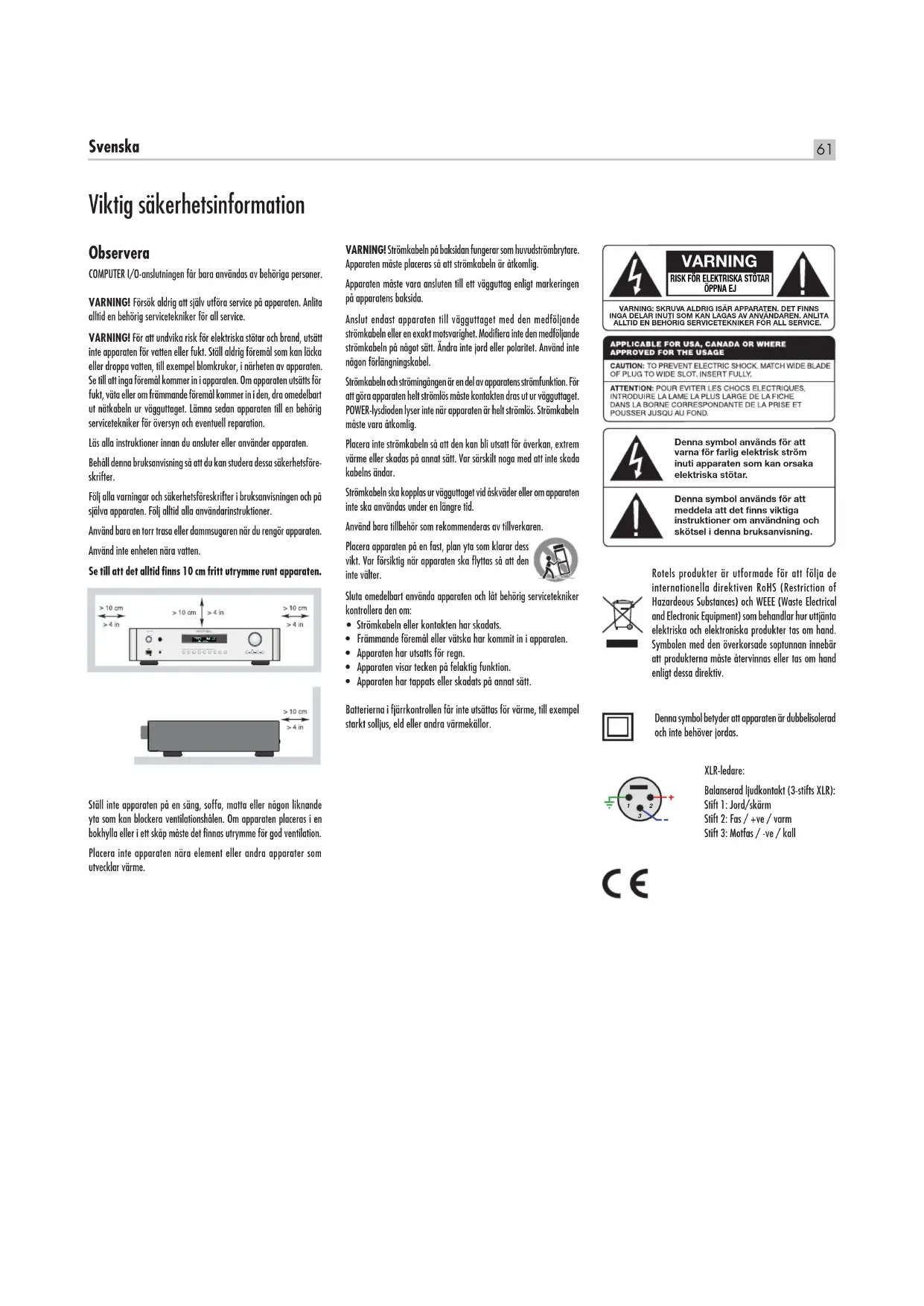 - ÖPPNA EJ VARNING: SKRUVA ALDRIG ISÄR APPARATEN. DET FINNS INGA DELAR INUTI SOM KAN LAGAS AV ANVÄNDAREN. ANLITA ALLTID EN BEHÖRIG SERVICETEKNIKER FÖR ALL SERVICE. Denna symbol används för att varna för farlig elektrisk ström inuti apparaten som kan orsaka elektriska stötar. Denna symbol används för att meddela att det finns viktiga instruktioner om användning och skötsel i denna bruksanvisning.62 RC‑1570 Stereokontrollförstärkare Om Rotel Vår historia började för mer än 50 år sedan. Under alla år som gått sedan dess har våra produkter belönats med hundratals utmärkelser och roat hundratusentals människor som tar sin underhållning på allvar – precis som du! Rotel grundades av en familj med ett passionerat intresse för musik. Detta ledde till en egen tillverkning av hifi-produkter med en kompromisslös kvalitet. Genom alla år har denna passion för musik, som delas av hela Rotels personal, varit oförminskad och målet har alltid varit att tillverka prisvärda produkter för både audiofiler och musikälskare, vilken budget de än har. Rotels ingenjörer arbetar i team och har ett nära samarbete. Tillsammans lyssnar de på och finslipar varje ny produkt tills den lever upp till deras höga krav. De får välja komponenter från hela världen för att göra produkterna så bra som möjligt. I apparaterna hittar du ofta allt från brittiska och tyska kondensatorer till japanska och amerikanska halvledare samt toroidaltransformatorer som tillverkas i Rotels egna fabriker. Vi bryr oss alla om miljön. Eftersom allt mer elektronik tillverkas, och så småningom kasseras, är det särskilt viktigt att tillverkare gör vad de kan för att produkterna får så liten inverkan som möjligt på sophantering och vattenmiljö. På Rotel är vi stolta över att kunna bidra. Vi har reducerat blyinnehållet i vår elektronik genom att använda ett speciellt RoHS-lödtenn, och våra Class D-förstärkare (ej digitala) är upp till fem gånger mer effektiva än våra äldre modeller samtidigt som de är kraftfulla och har höga prestanda. Dessa produkter utvecklar lite värme, slösar minimalt med energi, är bra för miljön – och låter bättre. Slutligen är denna manual tryckt på återvunnet papper. Även om detta är små, första steg så är de viktiga. Och vi fortsätter att eftersträva nya metoder och material som kan ge en renare och grönare tillverkning. Alla vi på Rotel är glada för att du köpt denna produkt. Vi är övertygade om att den kommer att ge dig många års njutning och glädje. Introduktion Tack för att du har köpt kontrollförstärkaren Rotel RC-1570. I en musikanläggning av hög kvalitet kommer den att ge dig många års musikalisk njutning. RC-1570 är en förförstärkare med många funktioner och höga prestanda. Den har utformats och optimerats för att kunna återge musikens hela dynamiska omfång och alla dess små nyanser. RC-1570 har en kraftfull strömförsörjning med en ringkärnetransformator och specialutformade ”slit- foil”-kondensatorer som utvecklats av Rotel. Denna strömförsörjning har låg impedans och stora kraftresurser, vilket innebär att RC-1570 kan återge även krävande ljudsignaler med lätthet. Att utforma en förstärkare med en sådan konstruktion är kostsamt, men innebär att musiken låter bättre. Kretskorten är försedda med SCT-teknik (Symmetrical Circuit Traces) som garanterar att musikens timing bibehålls och återskapas på ett korrekt sätt. Alla viktiga signalvägar i RC-1570 har kretsar som har metallfilmsresistorer och polystyren- eller polypropylen-kondensatorer. Hela konstruktionen är noggrant utformad för att återge musiken på ett så naturtroget sätt som möjligt. Innehåll Figur 1: Kontroller och anslutningar 3 Figur 2: RR-AX92 fjärrkontroll 3 Figur 3: Anslutningar för analoga in- och utgångar 4 Figur 4: Balanserade in- och utgångar (XLR) 5 Figur 5: Anslutningar för digitala ingångar och 12-volts styrsignaler 6 Figur 6: USB-port på fronten 7 Viktigt 8 Viktig säkerhetsinformation p. 61