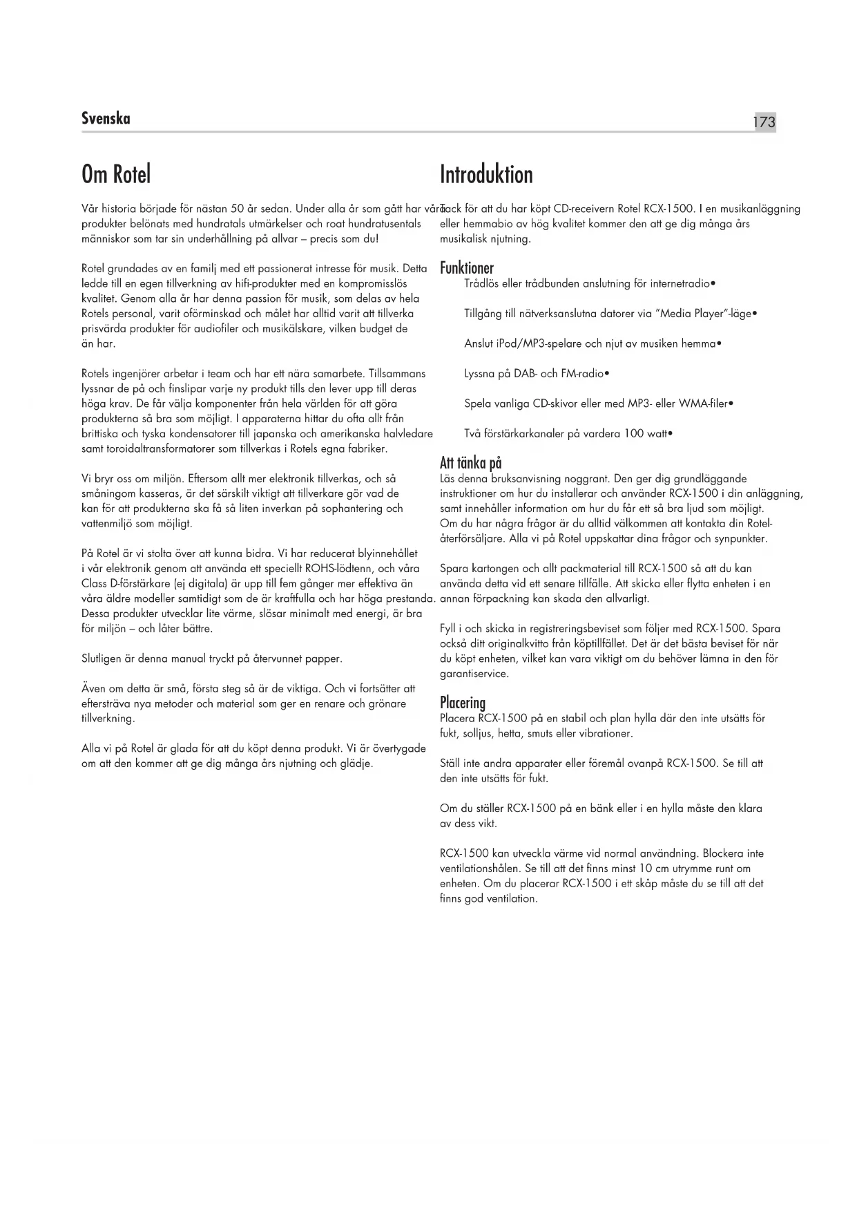 - Specifikationer RCX1500_ENG_SPA_FRE_GER_DUT_ITA_RUS_SWE.indb 172 27/8/10 13:52:56173 Svenska Om Rotel Vår historia började för nästan 50 år sedan. Under alla år som gått har våra produkter belönats med hundratals utmärkelser och roat hundratusentals människor som tar sin underhållning på allvar – precis som du! Rotel grundades av en familj med ett passionerat intresse för musik. Detta ledde till en egen tillverkning av hifi-produkter med en kompromisslös kvalitet. Genom alla år har denna passion för musik, som delas av hela Rotels personal, varit oförminskad och målet har alltid varit att tillverka prisvärda produkter för audiofiler och musikälskare, vilken budget de än har. Rotels ingenjörer arbetar i team och har ett nära samarbete. Tillsammans lyssnar de på och finslipar varje ny produkt tills den lever upp till deras höga krav. De får välja komponenter från hela världen för att göra produkterna så bra som möjligt. I apparaterna hittar du ofta allt från brittiska och tyska kondensatorer till japanska och amerikanska halvledare samt toroidaltransformatorer som tillverkas i Rotels egna fabriker. Vi bryr oss om miljön. Eftersom allt mer elektronik tillverkas, och så småningom kasseras, är det särskilt viktigt att tillverkare gör vad de kan för att produkterna ska få så liten inverkan på sophantering och vattenmiljö som möjligt. På Rotel är vi stolta över att kunna bidra. Vi har reducerat blyinnehållet i vår elektronik genom att använda ett speciellt ROHS-lödtenn, och våra Class D-förstärkare (ej digitala) är upp till fem gånger mer effektiva än våra äldre modeller samtidigt som de är kraftfulla och har höga prestanda. Dessa produkter utvecklar lite värme, slösar minimalt med energi, är bra för miljön – och låter bättre. Slutligen är denna manual tryckt på återvunnet papper. Även om detta är små, första steg så är de viktiga. Och vi fortsätter att eftersträva nya metoder och material som ger en renare och grönare tillverkning. Alla vi på Rotel är glada för att du köpt denna produkt. Vi är övertygade om att den kommer att ge dig många års njutning och glädje. Introduktion Tack för att du har köpt CD-receivern Rotel RCX-1500. I en musikanläggning eller hemmabio av hög kvalitet kommer den att ge dig många års musikalisk njutning. Funktioner Trådlös eller trådbunden anslutning för internetradio• Tillgång till nätverksanslutna datorer via ”Media Player”-läge• Anslut iPod/MP3-spelare och njut av musiken hemma• Lyssna på DAB- och FM-radio• Spela vanliga CD-skivor eller med MP3- eller WMA-filer• Två förstärkarkanaler på vardera 100 watt• Att tänka på Läs denna bruksanvisning noggrant. Den ger dig grundläggande instruktioner om hur du installerar och använder RCX-1500 i din anläggning, samt innehåller information om hur du får ett så bra ljud som möjligt. Om du har några frågor är du alltid välkommen att kontakta din Rotel- återförsäljare. Alla vi på Rotel uppskattar dina frågor och synpunkter. Spara kartongen och allt packmaterial till RCX-1500 så att du kan använda detta vid ett senare tillfälle. Att skicka eller flytta enheten i en annan förpackning kan skada den allvarligt. Fyll i och skicka in registreringsbeviset som följer med RCX-1500. Spara också ditt originalkvitto från köptillfället. Det är det bästa beviset för när du köpt enheten, vilket kan vara viktigt om du behöver lämna in den för garantiservice. Placering Placera RCX-1500 på en stabil och plan hylla där den inte utsätts för fukt, solljus, hetta, smuts eller vibrationer. Ställ inte andra apparater eller föremål ovanpå RCX-1500. Se till att den inte utsätts för fukt. Om du ställer RCX-1500 på en bänk eller i en hylla måste den klara av dess vikt. RCX-1500 kan utveckla värme vid normal användning. Blockera inte ventilationshålen. Se till att det finns minst 10 cm utrymme runt om enheten. Om du placerar RCX-1500 i ett skåp måste du se till att det finns god ventilation. RCX1500_ENG_SPA_FRE_GER_DUT_ITA_RUS_SWE.indb 173 27/8/10 13:52:56174 RCX-1500 CD-receiver Översikt – Rotels internetradio och Digital Gateway-produkter Denna produkt fungerar inte om inte Wi-Fi-dongeln eller nätverksdongeln är ansluten. Vi rekommenderar att du börjar med att läsa denna introduktion. Vanliga frågor och svar finns på Rotels webbsida www.rotel.com/NA/ support/FAQ.htm Denna Rotel-produkt sammanför konventionell FM-radiomottagning och DAB med datorvärldens förmåga att nå tusentals radiokanaler på internet. Utöver detta kan Rotels nya serie radio/Digital Gateway-produkter länkas samman med bärbara musikspelare (iPodar och MP3-spelare) och dina musikfiler som ligger lagrade på en nätverksserver. Läs mer om dessa funktioner längre fram i denna instruktionsbok. Det spelar ingen roll om hemnätverket är kabelbaserat eller trådlöst – det är däremot viktigt att Wi-Fi-dongeln eller nätverksdongeln ansluts till kontakten på baksidan av apparaten. Använd en förlängningskabel om det är ont om plats på baksidan. Varje gång enheten slås på låses den i ett sökläge i 15–20 sekunder. När sökningen är avslutad kan andra radiolägen användas. USB-porten aktiveras så fort enheten slås på. DAB- och FM-radio Detta är den mest konventionella delen av produkten och om du har tidigare erfarenheter av att söka efter, ställa in och välja radiokanaler från nuvarande DAB- och FM-radiosändningar så kommer du snabbt att bli bekant med hur radiomottagaren används. Allt detta förklaras i de relevanta avsnitten längre fram i denna manual. Kom ihåg att ange vilken antenningång som ska användas, dessa alternativ finns i inställningsmenyn. Utöver detta måste rätt antenn installeras för att optimera mottagningen av FM- och DAB-tjänster. Internetradio För att lyssna på internetradio krävs ytterligare två tjänster: tillgång till intern