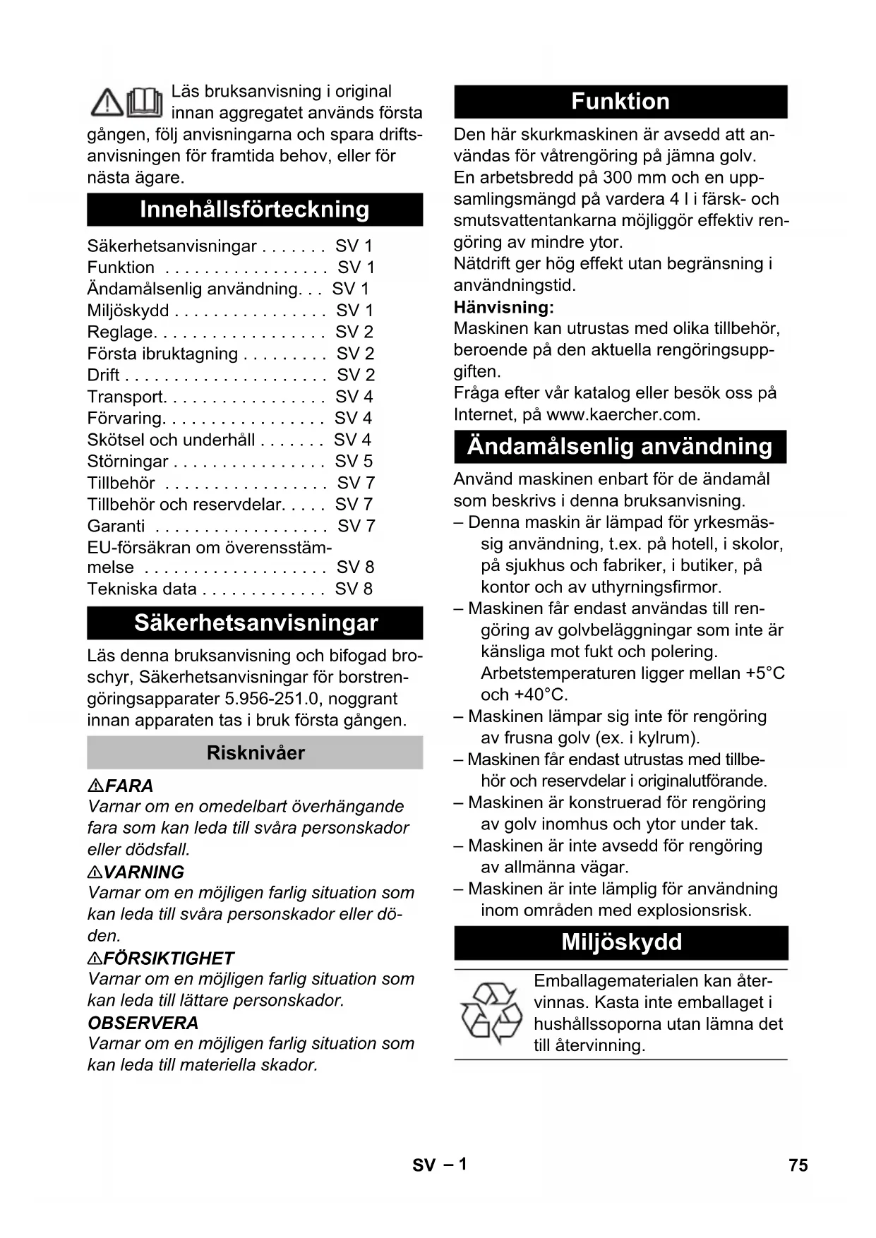 dB(A) 1 74 NO– 1 Läs bruksanvisning i original innan aggregatet används första gången, följ anvisningarna och spara drifts- anvisningen för framtida behov, eller för nästa ägare. Läs denna bruksanvisning och bifogad bro- schyr, Säkerhetsanvisningar för borstren- göringsapparater 5.956-251.0, noggrant innan apparaten tas i bruk första gången. FARA Varnar om en omedelbart överhängande fara som kan leda till svåra personskador eller dödsfall. 몇 VARNING Varnar om en möjligen farlig situation som kan leda till svåra personskador eller dö- den. 몇 FÖRSIKTIGHET Varnar om en möjligen farlig situation som kan leda till lättare personskador. OBSERVERA Varnar om en möjligen farlig situation som kan leda till materiella skador. Den här skurkmaskinen är avsedd att an- vändas för våtrengöring på jämna golv. En arbetsbredd på 300 mm och en upp- samlingsmängd på vardera 4 l i färsk- och smutsvattentankarna möjliggör effektiv ren- göring av mindre ytor. Nätdrift ger hög effekt utan begränsning i användningstid. Hänvisning: Maskinen kan utrustas med olika tillbehör, beroende på den aktuella rengöringsupp- giften. Fråga efter vår katalog eller besök oss på Internet, på www.kaercher.com. Använd maskinen enbart för de ändamål som beskrivs i denna bruksanvisning. – Denna maskin är lämpad för yrkesmäs- sig användning, t.ex. på hotell, i skolor, på sjukhus och fabriker, i butiker, på kontor och av uthyrningsfirmor. – Maskinen får endast användas till ren- göring av golvbeläggningar som inte är känsliga mot fukt och polering. Arbetstemperaturen ligger mellan +5°C och +40°C. – Maskinen lämpar sig inte för rengöring av frusna golv (ex. i kylrum). – Maskinen får endast utrustas med tillbe- hör och reservdelar i originalutförande. – Maskinen är konstruerad för rengöring av golv inomhus och ytor under tak. – Maskinen är inte avsedd för rengöring av allmänna vägar. – Maskinen är inte lämplig för användning inom områden med explosionsrisk. Innehållsförteckning Säkerhetsanvisningar . . . . . . . SV 1 Funktion . . . . . . . . . . . . . . . . . SV 1 Ändamålsenlig användning. . . SV 1 Miljöskydd . . . . . . . . . . . . . . . . SV 1 Reglage. . . . . . . . . . . . . . . . . . SV 2 Första ibruktagning . . . . . . . . . SV 2 Drift . . . . . . . . . . . . . . . . . . . . . SV 2 Transport. . . . . . . . . . . . . . . . . SV 4 Förvaring. . . . . . . . . . . . . . . . . SV 4 Skötsel och underhåll . . . . . . . SV 4 Störningar . . . . . . . . . . . . . . . . SV 5 Tillbehör . . . . . . . . . . . . . . . . . SV 7 Tillbehör och reservdelar. . . . . SV 7 Garanti . . . . . . . . . . . . . . . . . . SV 7 EU-försäkran om överensstäm- melse . . . . . . . . . . . . . . . . . . . SV 8 Tekniska data . . . . . . . . . . . . . SV 8 Säkerhetsanvisningar Risknivåer Funktion Ändamålsenlig användning Miljöskydd Emballagematerialen kan åter- vinnas. Kasta inte emballaget i hushållssoporna utan lämna det till återvinning. 75SV– 2 Elektriska och elektroniska maskiner inne- håller ofta komponenter som vid felaktig användning eller felaktig avfallshantering kan utgöra en potentiell risk för människors hälsa och för miljön. Dessa komponenter är dock nödvändiga för att maskinen ska kun- na arbeta korrekt. Maskiner som märkts med denna symbol får inte kastas i hus- hållssoporna. Upplysningar om ingredienser (REACH) Aktuell information om ingredienser finns på: www.kaercher.com/REACH Bild 1, se omslagssida 1 Handtag 2 Reglage vattenpump 3 Huvudströmbrytare borst-/sugdrift 4 Bärhandtag 5 Bygelhandtag smutsvattentank 6 Smutsvattentank 7 Färskvattentank 8 Förslutning färskvattentank 9Sil 10 Rengöringshuvud 11 Pedal sugskenehöjning 12 Frikoppling parkeringsposition 13 Sugrör 14 Anslutning sugrör 15 Sugmunstycke (endast BR 30/4 C Adv) 16 Borstvals 17 Sugskena 18 Upplåsningsknapp, utbytesborste 19 Skydd smutsvattentank 20 Tillslutning 21 Bränslemätare 22 Sladdlindningshake, vridbar 23 Nätkabel med nätkontakt 24 Handtag sugrör (endast BR 30/4 C Adv) Bild 2, se omslagssida Stick in röret, som sitter i slutet av hand- taget, i maskinen. Tryck på spärren och skjut in handtaget tills det hakar fast i maskinen. Rikta in kabeln i maskinen och sätt fast locket på det sätt som visas på den bi- fogade sidan. 몇 FÖRSIKTIGHET Skaderisk. Använd enbart de rekommen- derade rengöringsmedlen. För andra ren- göringsmedel bär den driftsansvarige an- svaret för den ökade risken med avseende på driftsäkerhet, olycksfallsrisk och förkor- tad livslängd för maskinen. Använd bara rengöringsmedel som inte innehåller lös- ningsmedel, salt- och fluorvätesyra. Beakta säkerhetsanvisningarna på rengö- ringsmedlen. Hänvisning: Använd inga kraftigt skummande rengö- ringsmedel. Följ doseringsanvisningarna. Kasserade aggregat innehåller återvinningsbart material som bör gå till återvinning. Batterier, olja och liknande ämnen får inte komma ut i miljön. Överlämna därför skrotade aggregat till lämpligt återvinningssystem. Reglage Symboler på apparaten Sugbalk i läge Utsugning. Vattenpump på/av Första ibruktagning Drift Fyll färskvattentanken 76 SV– 3 Rekommenderade rengöringsmedel: Lyft bort färskvattentanken från maskinen. Öppna locket på färskvattentanken. Häll i vatten-rengöringsmedel-bland- ningen. Högsta temperatur på vätskan är 50 °C. Stäng locket på färskvattentanken. Sätt tillbaka tanken i maskinen. Sväng upp den undre sladdlindningsha- ken och lyft av kabeln. Kontrollera nätsladd och stickkontakt avseende skador och brott. Anlita en- dast kundtjänst eller elektriker för utby- te. Anslut nätkontakt till vägguttag. FARA Risk för personskador på grund av elektrisk stöt på grund av en skadad nätkabel. Låt inte nätanslutningskabeln komma i kontakt med de roterande borstarna. OBSERVERA Risk för skada på golvbeläggningen. Ren- göringsmetoden