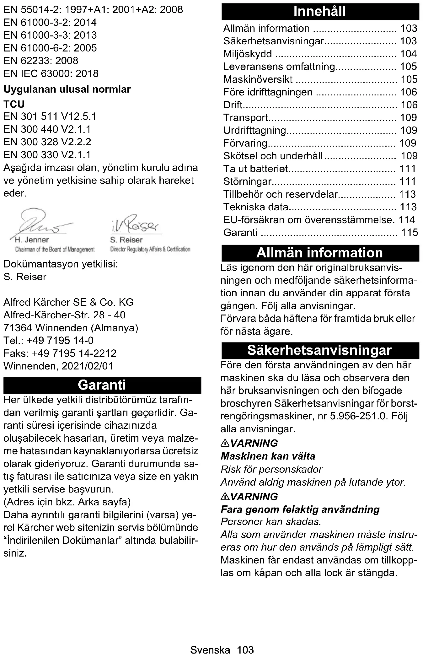 - dB(A) 85Svenska 103 EN 55014-2: 1997+A1: 2001+A2: 2008 EN 61000-3-2: 2014 EN 61000-3-3: 2013 EN 61000-6-2: 2005 EN 62233: 2008 EN IEC 63000: 2018 Uygulanan ulusal normlar TCU EN 301 511 V12.5.1 EN 300 440 V2.1.1 EN 300 328 V2.2.2 EN 300 330 V2.1.1 Aşağıda imzası olan, yönetim kurulu adına ve yönetim yetkisine sahip olarak hareket eder. Dokümantasyon yetkilisi: S. Reiser Alfred Kärcher SE & Co. KG Alfred-Kärcher-Str. 28 - 40 71364 Winnenden (Almanya) Tel.: +49 7195 14-0 Faks: +49 7195 14-2212 Winnenden, 2021/02/01 Garanti Her ülkede yetkili distribütörümüz tarafın- dan verilmiş garanti şartları geçerlidir. Ga- ranti süresi içerisinde cihazınızda oluşabilecek hasarları, üretim veya malze- me hatasından kaynaklanıyorlarsa ücretsiz olarak gideriyoruz. Garanti durumunda sa- tış faturası ile satıcınıza veya size en yakın yetkili servise başvurun. (Adres için bkz. Arka sayfa) Daha ayrıntılı garanti bilgilerini (varsa) ye- rel Kärcher web sitenizin servis bölümünde “İndirilenilen Dokümanlar” altında bulabilir- siniz. Innehåll Allmän information Läs igenom den här originalbruksanvis- ningen och medföljande säkerhetsinforma- tion innan du använder din apparat första gången. Följ alla anvisningar. Förvara båda häftena för framtida bruk eller för nästa ägare. Säkerhetsanvisningar Före den första användningen av den här maskinen ska du läsa och observera den här bruksanvisningen och den bifogade broschyren Säkerhetsanvisningar för borst- rengöringsmaskiner, nr 5.956-251.0. Följ alla anvisningar. 몇 VARNING Maskinen kan välta Risk för personskador Använd aldrig maskinen på lutande ytor. 몇 VARNING Fara genom felaktig användning Personer kan skadas. Alla som använder maskinen måste instru- eras om hur den används på lämpligt sätt. Maskinen får endast användas om tillkopp- las om kåpan och alla lock är stängda. Allmän information p. 103