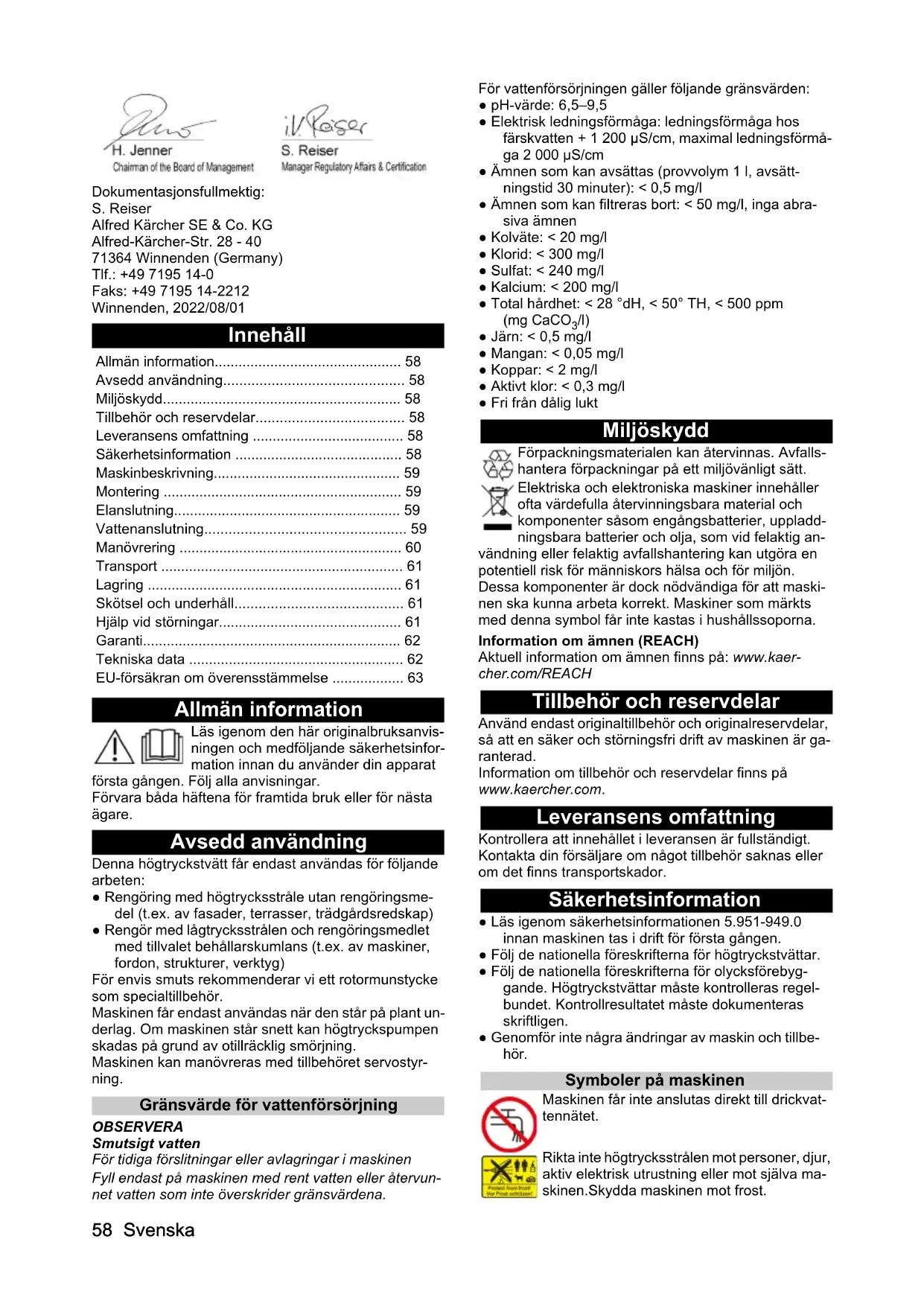 - /l) ● Järn: < 0,5 mg/l ● Mangan: < 0,05 mg/l ● Koppar: < 2 mg/l ● Aktivt klor: < 0,3 mg/l ● Fri från dålig lukt Miljöskydd Förpackningsmaterialen kan återvinnas. Avfalls- hantera förpackningar på ett miljövänligt sätt. Elektriska och elektroniska maskiner innehåller ofta värdefulla återvinningsbara material och komponenter såsom engångsbatterier, uppladd- ningsbara batterier och olja, som vid felaktig an- vändning eller felaktig avfallshantering kan utgöra en potentiell risk för människors hälsa och för miljön. Dessa komponenter är dock nödvändiga för att maski- nen ska kunna arbeta korrekt. Maskiner som märkts med denna symbol får inte kastas i hushållssoporna. Information om ämnen (REACH) Aktuell information om ämnen finns på: www.kaer- cher.com/REACH Tillbehör och reservdelar Använd endast originaltillbehör och originalreservdelar, så att en säker och störningsfri drift av maskinen är ga- ranterad. Information om tillbehör och reservdelar finns på www.kaercher.com. Leveransens omfattning Kontrollera att innehållet i leveransen är fullständigt. Kontakta din försäljare om något tillbehör saknas eller om det finns transportskador. Säkerhetsinformation ● Läs igenom säkerhetsinformationen 5.951-949.0 innan maskinen tas i drift för första gången. ● Följ de nationella föreskrifterna för högtryckstvättar. ● Följ de nationella föreskrifterna för olycksförebyg- gande. Högtryckstvättar måste kontrolleras regel- bundet. Kontrollresultatet måste dokumenteras skriftligen. ● Genomför inte några ändringar av maskin och tillbe- hör. Symboler på maskinen Maskinen får inte anslutas direkt till drickvat- tennätet. Rikta inte högtrycksstrålen mot personer, djur, aktiv elektrisk utrustning eller mot själva ma- skinen.Skydda maskinen mot frost. Allmän information p. 58