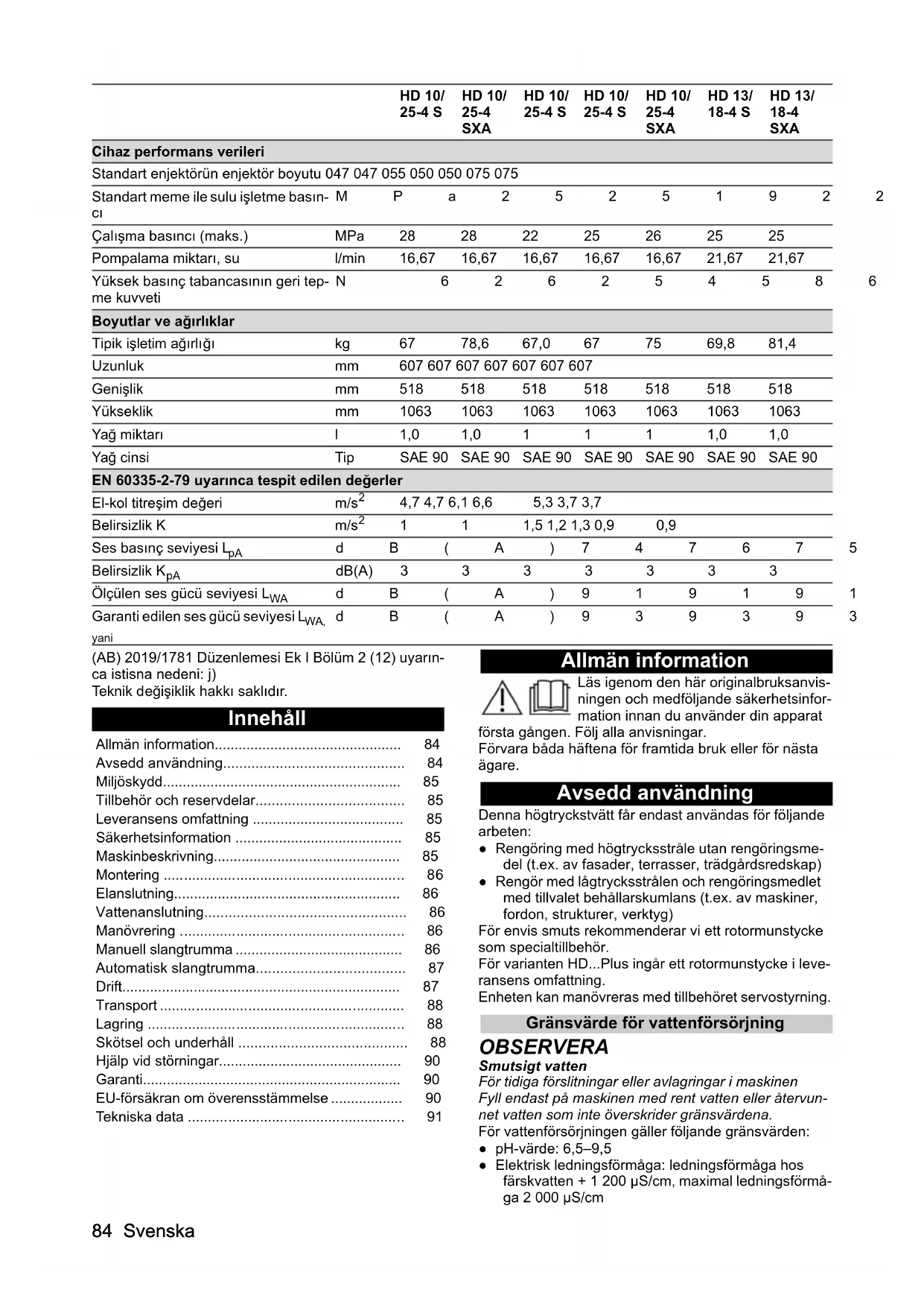 (AB) 2019/1781 Düzenlemesi Ek I Bölüm 2 (12) uyarın- ca istisna nedeni: j) Teknik d eğişiklik hakkı saklıdır. Innehåll Allmän information Läs igenom den här originalbruksanvis- ningen och medföljande säkerhetsinfor- mation innan du använder din apparat första gången. Följ alla anvisningar. Förvara båda häftena för framtida bruk eller för nästa ägare. Avsedd användning Denna högtryckstvätt får endast användas för följande arbeten: ● Rengöring med högtrycksstråle utan rengöringsme- del (t.ex. av fasader, terrasser, trädgårdsredskap) ● Rengör med lågtrycksstrålen och rengöringsmedlet med tillvalet behållarskumlans (t.ex. av maskiner, fordon, strukturer, verktyg) För envis smuts rekommenderar vi ett rotormunstycke som specialtillbehör. För varianten HD...Plus ingår ett rotormunstycke i leve- ransens omfattning. Enheten kan manövreras med tillbehöret servostyrning. Gränsvärde för vattenförsörjning OBSERVERA Smutsigt vatten För tidiga förslitningar eller avlagringar i maskinen Fyll endast på maskinen med rent vatten eller återvun- net vatten som inte överskrider gränsvärdena. För vattenförsörjningen gäller följande gränsvärden: ● pH-värde: 6,5–9,5 ● Elektrisk ledningsförmåga: ledningsförmåga hos färskvatten + 1 200 µS/cm, maximal ledningsförmå- ga 2 000 µS/cm Cihaz performans verileri Standart enjektörün enjektör boyutu 047 047 055 050 050 075 075 Standart meme ile sulu işletme basın-