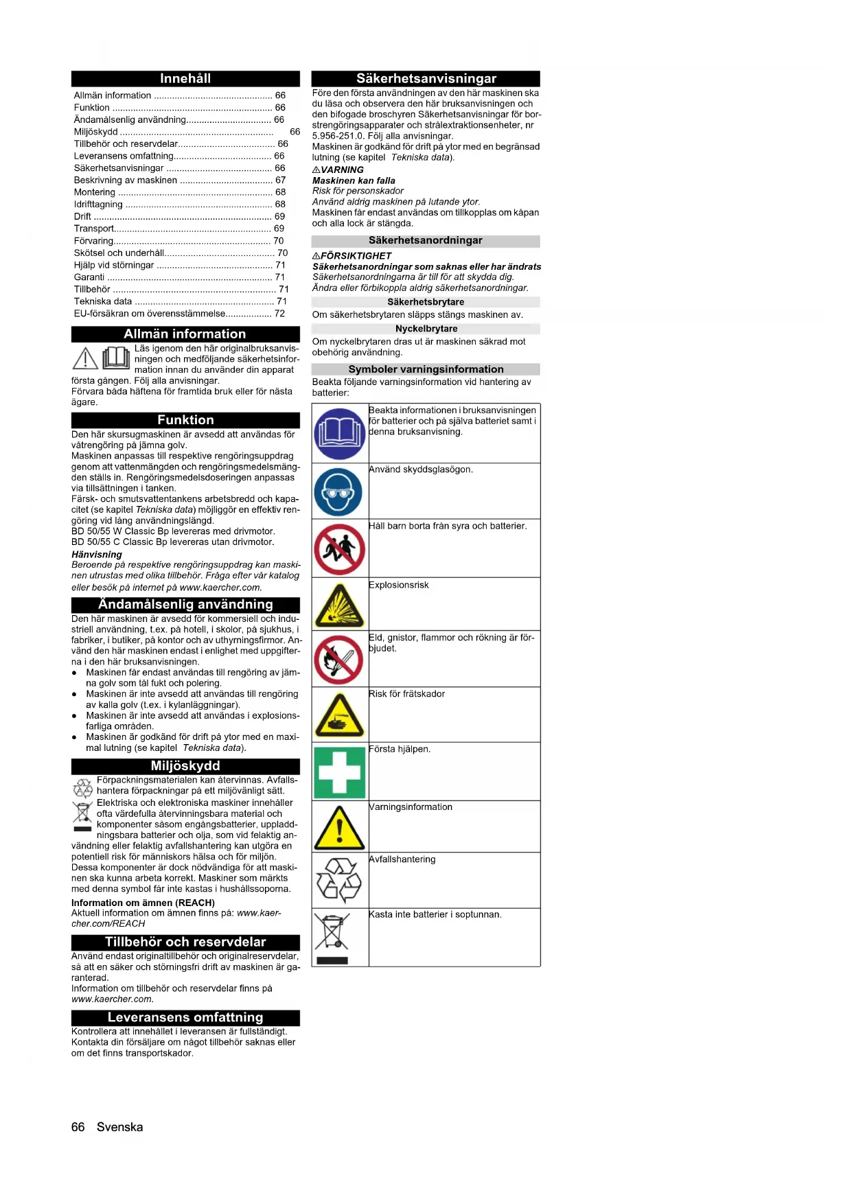 • dB(A) 84,1 84,1 BD 50/55 W Classic Bp BD 50/55 C Classic Bp Chairman of the Board of Management Director Regulatory Affairs & Certification H. Jenner S. Reiser66 Svenska Innehåll Allmän information Läs igenom den här originalbruksanvis- ningen och medföljande säkerhetsinfor- mation innan du använder din apparat första gången. Följ alla anvisningar. Förvara båda häftena för framtida bruk eller för nästa ägare. Funktion Den här skursugmaskinen är avsedd att användas för våtrengöring på jämna golv. Maskinen anpassas till respektive rengöringsuppdrag genom att vattenmängden och rengöringsmedelsmäng- den ställs in. Rengöringsmedelsdoseringen anpassas via tillsättningen i tanken. Färsk- och smutsvattentankens arbetsbredd och kapa- citet (se kapitel Tekniska data) möjliggör en effektiv ren- göring vid lång användningslängd. BD 50/55 W Classic Bp levereras med drivmotor. BD 50/55 C Classic Bp levereras utan drivmotor. Hänvisning Beroende på respektive rengöringsuppdrag kan maski- nen utrustas med olika tillbehör. Fråga efter vår katalog eller besök på internet på www.kaercher.com. Ändamålsenlig användning Den här maskinen är avsedd för kommersiell och indu- striell användning, t.ex. på hotell, i skolor, på sjukhus, i fabriker, i butiker, på kontor och av uthyrningsfirmor. An- vänd den här maskinen endast i enlighet med uppgifter- na i den här bruksanvisningen. ● Maskinen får endast användas till rengöring av jäm- na golv som tål fukt och polering. ● Maskinen är inte avsedd att användas till rengöring av kalla golv (t.ex. i kylanläggningar). ● Maskinen är inte avsedd att användas i explosions- farliga områden. ● Maskinen är godkänd för drift på ytor med en maxi- mal lutning (se kapitel Tekniska data). Miljöskydd Förpackningsmaterialen kan återvinnas. Avfalls- hantera förpackningar på ett miljövänligt sätt. Elektriska och elektroniska maskiner innehåller ofta värdefulla återvinningsbara material och komponenter såsom engångsbatterier, uppladd- ningsbara batterier och olja, som vid felaktig an- vändning eller felaktig avfallshantering kan utgöra en potentiell risk för människors hälsa och för miljön. Dessa komponenter är dock nödvändiga för att maski- nen ska kunna arbeta korrekt. Maskiner som märkts med denna symbol får inte kastas i hushållssoporna. Information om ämnen (REACH) Aktuell information om ämnen finns på: www.kaer- cher.com/REACH Tillbehör och reservdelar Använd endast originaltillbehör och originalreservdelar, så att en säker och störningsfri drift av maskinen är ga- ranterad. Information om tillbehör och reservdelar finns på www.kaercher.com. Leveransens omfattning Kontrollera att innehållet i leveransen är fullständigt. Kontakta din försäljare om något tillbehör saknas eller om det finns transportskador. Säkerhetsanvisningar Före den första användningen av den här maskinen ska du läsa och observera den här bruksanvisningen och den bifogade broschyren Säkerhetsanvisningar för bor- strengöringsapparater och strålextraktionsenheter, nr 5.956-251.0. Följ alla anvisningar. Maskinen är godkänd för drift på ytor med en begränsad lutning (se kapitel Tekniska data). 몇 VARNING Maskinen kan falla Risk för personskador Använd aldrig maskinen på lutande ytor. Maskinen får endast användas om tillkopplas om kåpan och alla lock är stängda. Säkerhetsanordningar 몇 FÖRSIKTIGHET Säkerhetsanordningar som saknas eller har ändrats Säkerhetsanordningarna är till för att skydda dig. Ändra eller förbikoppla aldrig säkerhetsanordningar. Säkerhetsbrytare Om säkerhetsbrytaren släpps stängs maskinen av. Nyckelbrytare Om nyckelbrytaren dras ut är maskinen säkrad mot obehörig användning. Symboler varningsinformation Beakta följande varningsinformation vid hantering av batterier: Allmän information p. 66