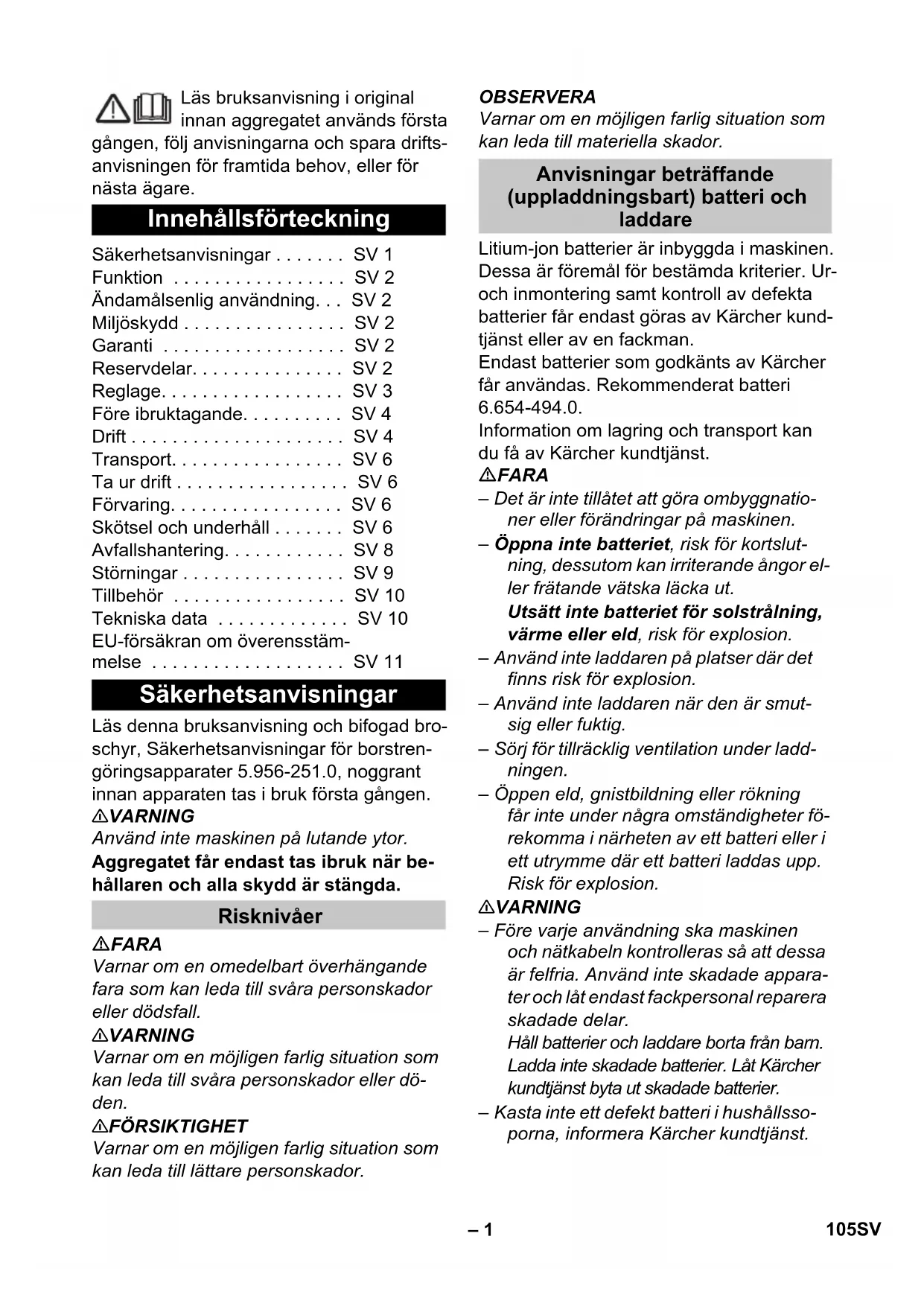dB(A) 85 EU-samsvarserklæring Produkt: Slipesugemaskin Type: 1.783-xxx Relevante EU-direktiver 2006/42/EF (+2009/127/EF) 2014/30/EU 2011/65/EU 2014/53/EU (TCU) Anvendte overensstemmende normer EN 60335–1 EN 60335–2–72 EN 60335-2-29 EN 55012: 2007 + A1: 2009 EN 55014-1:2006 + A1: 2009 + A2:2011 EN 55014–2: 1997 + A1: 2001 + A2: 2008 EN 61000–3–2: 2014 EN 61000–3–3: 2013 EN 61000–6–2: 2005 EN 62233: 2008 EN IEC 63000: 2018 Anvendte nasjonale normer TCU EN 301 511 V12.5.1 EN 300 440 V2.1.1 EN 300 328 V2.2.2 EN 300 330 V2.1.1 Chairman of the Board of Management Director Regulatory Affairs & Certification 104 NO– 1 Läs bruksanvisning i original innan aggregatet används första gången, följ anvisningarna och spara drifts- anvisningen för framtida behov, eller för nästa ägare. Läs denna bruksanvisning och bifogad bro- schyr, Säkerhetsanvisningar för borstren- göringsapparater 5.956-251.0, noggrant innan apparaten tas i bruk första gången. 몇 VARNING Använd inte maskinen på lutande ytor. Aggregatet får endast tas ibruk när be- hållaren och alla skydd är stängda. FARA Varnar om en omedelbart överhängande fara som kan leda till svåra personskador eller dödsfall. 몇 VARNING Varnar om en möjligen farlig situation som kan leda till svåra personskador eller dö- den. 몇 FÖRSIKTIGHET Varnar om en möjligen farlig situation som kan leda till lättare personskador. OBSERVERA Varnar om en möjligen farlig situation som kan leda till materiella skador. Litium-jon batterier är inbyggda i maskinen. Dessa är föremål för bestämda kriterier. Ur- och inmontering samt kontroll av defekta batterier får endast göras av Kärcher kund- tjänst eller av en fackman. Endast batterier som godkänts av Kärcher får användas. Rekommenderat batteri 6.654-494.0. Information om lagring och transport kan du få av Kärcher kundtjänst. FARA – Det är inte tillåtet att göra ombyggnatio- ner eller förändringar på maskinen. – Öppna inte batteriet, risk för kortslut- ning, dessutom kan irriterande ångor el- ler frätande vätska läcka ut. Utsätt inte batteriet för solstrålning, värme eller eld, risk för explosion. – Använd inte laddaren på platser där det finns risk för explosion. – Använd inte laddaren när den är smut- sig eller fuktig. – Sörj för tillräcklig ventilation under ladd- ningen. – Öppen eld, gnistbildning eller rökning får inte under några omständigheter fö- rekomma i närheten av ett batteri eller i ett utrymme där ett batteri laddas upp. Risk för explosion. 몇 VARNING – Före varje användning ska maskinen och nätkabeln kontrolleras så att dessa är felfria. Använd inte skadade appara- ter och låt endast fackpersonal reparera skadade delar. Håll batterier och laddare borta från barn. Ladda inte skadade batterier. Låt Kärcher kundtjänst byta ut skadade batterier. – Kasta inte ett defekt batteri i hushållsso- porna, informera Kärcher kundtjänst. Innehållsförteckning Säkerhetsanvisningar . . . . . . . SV 1 Funktion . . . . . . . . . . . . . . . . . SV 2 Ändamålsenlig användning. . . SV 2 Miljöskydd . . . . . . . . . . . . . . . . SV 2 Garanti . . . . . . . . . . . . . . . . . . SV 2 Reservdelar. . . . . . . . . . . . . . . SV 2 Reglage. . . . . . . . . . . . . . . . . . SV 3 Före ibruktagande. . . . . . . . . . SV 4 Drift . . . . . . . . . . . . . . . . . . . . . SV 4 Transport. . . . . . . . . . . . . . . . . SV 6 Ta ur drift . . . . . . . . . . . . . . . . . SV 6 Förvaring. . . . . . . . . . . . . . . . . SV 6 Skötsel och underhåll . . . . . . . SV 6 Avfallshantering. . . . . . . . . . . . SV 8 Störningar . . . . . . . . . . . . . . . . SV 9 Tillbehör . . . . . . . . . . . . . . . . . SV 10 Tekniska data . . . . . . . . . . . . . SV 10 EU-försäkran om överensstäm- melse . . . . . . . . . . . . . . . . . . . SV 11 Säkerhetsanvisningar Risknivåer Anvisningar beträffande (uppladdningsbart) batteri och laddare 105SV– 2 – Undvik kontakt med vätska som kom- mer ur defekta batterier. Spola bort vätskan med vatten vid oavsiktlig kon- takt. Kontakta läkare om vätska hamnar i ögonen. 몇 FÖRSIKTIGHET – Denna bruksanvisning ska ovillkorligen beaktas och följas. Observera lagstifta- rens rekommendationer angående hantering av batterier. – Nätspänningen måste överensstämma med den spänning som anges på ma- skinens typskylt. – Laddaren får endast användas för ladd- ning av godkända, uppladdningsbara batterier. – Det uppladdningsbara batteriet får en- dast användas tillsammans med denna maskin. Det är förbjudet att använda det för andra ändamål. Om säkerhetsbrytaren släpps stängs borst- drivningen av. Den här skurkmaskinen är avsedd att an- vändas för våtrengöring på jämna golv. Maskinen kan genom inställning av vatten- mängd kan maskinen lätt anpassas till olika rengöringsuppgifter. En arbetsbredd på 380 mm och en volym på 12 l i färsk- och smutsvattentanken ger möjlighet till en effektiv rengöring vid lång- varig användning. Batteriet kan laddas upp med hjälp av en inbyggd laddare som ansluts till ett 230V- eluttag. Denna maskin är lämpad för yrkesmässig användning, t.ex. på hotell, i skolor, på sjukhus och fabriker, i butiker, på kontor och av uthyrningsfirmor. Använd maskinen enbart för de ändamål som beskrivs i denna bruksanvisning. – Aggregatet får endast användas till ren- göring av blanka golv som ej är fukt- känsliga. – Denna maskin är endast avsedd för rengöring inomhus. – Maskinen lämpar sig inte för rengöring av frusna golv (ex. i kylrum). – Maskinen får endast utrustas med tillbehör och reservdelar i originalutförande. Emballagematerialen kan återvinnas. Kasta inte emballaget i hushållsso- porna utan för dem till återvinning. Skrotade aggregat innehåller återvin- ningsbara material som bör gå till återvinning. Överlämna skrotade ag- gregat till ett lämpligt återvinnings