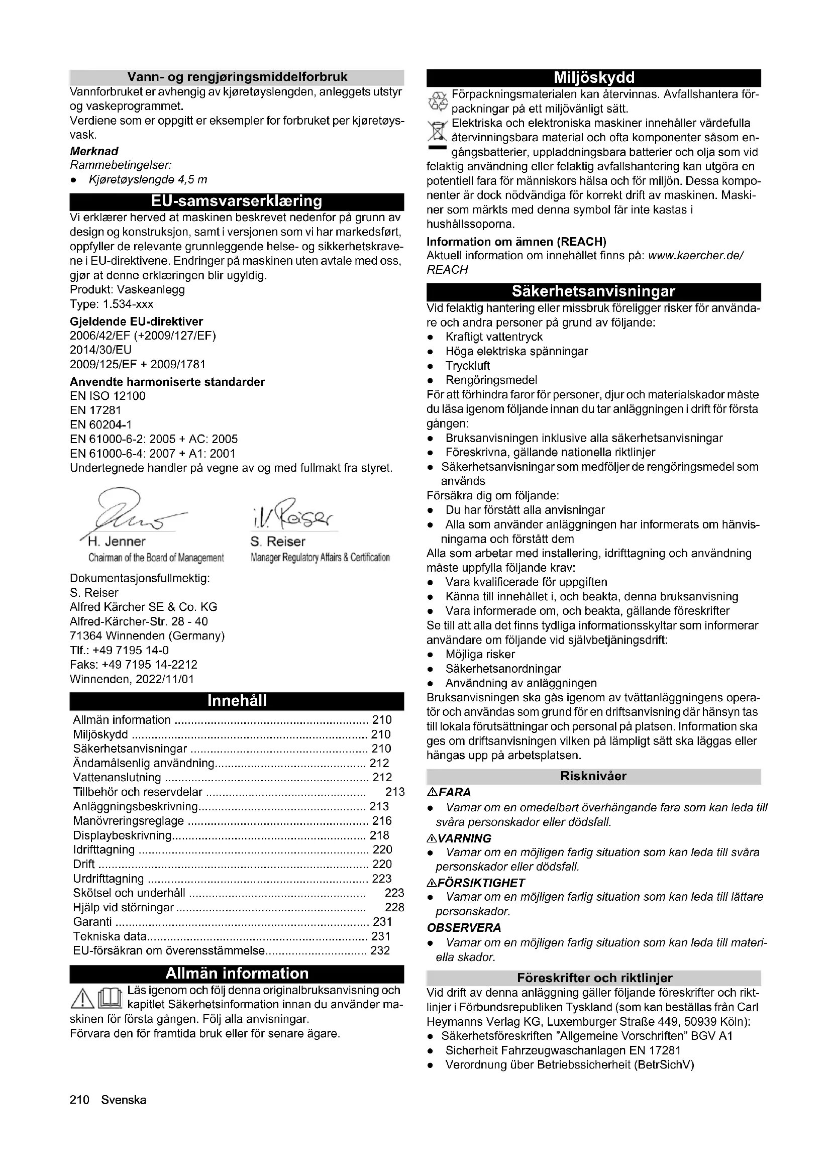 - Garanti Vår ansvarlige salgsorganisasjon for det enkelte land har utgitt garantibetingelsene som gjelder i det aktuelle landet. Eventuelle feil på apparatet repareres gratis i garantitiden dersom disse kan føres tilbake til material- eller produksjonsfeil. Ved behov for ga- rantireparasjoner, vennligst henvend deg med kjøpskvitteringen til din forhandler eller nærmeste autoriserte kundeservice. (Se adresse på baksiden) Tekniske spesifikasjoner Med forbehold om tekniske endringer. CW 3 / CW 5 (CWB 3/1) CW 3 / CW 5 (CWB 3/2) CW 3 / CW 5 (CWB 3/3) Anleggets dimensjoner Vaskehøyde mm 2100, 2200, 2300 2400, 2500, 2600 2700, 2800, 2900 Rammehøyde mm 2900 3200 3500 Total høyde mm 2930, 3030, 3130 3230, 3330, 3430 3530, 3630, 3730 Rammebredde mm 3500 3500 3500 Total bredde sidebørster mm 4040 4040 4040 Total bredde sprutbeskyttelse mm 4060 4060 4060 Rammedybde/ dybde med roterende børster mm 1600 / 2170 1600 / 2170 1600 / 2170 Total lengde kort hall mm 2070 2070 2070 Anleggets bredde i speilhøyde mm 2450 2450 2450 Anleggets bredde i området hjulvask mm 2100 2100 2100 Sporbredde kjøreskinner mm 2550, 2700, 2800 2550, 2700, 2800 2550, 2700, 2800 Hallbredde med sikkerhetsavstand mm 4500 4500 4500 Vaskebørster Børstediameter side mm 975 975 975 Børstedreietall side 1/min 107 107 107 Børstediameter tak mm 975 975 975 Børstedreietall tak 1/min 127 127 127 Portalhastighet m/min 0 - 24 0 - 24 0 - 24 Elektrisk tilkobling Nettspenning V 400 400 400 Frekvens Hz 50 50 50 Tilkoblingskapasitet kW 10-16 10-16 10-16 maks. forsikring styring A 35-50 35-50 35-50 Vanntilkobling Nominell bredde Tommer 1 1 1 Flytetrykk ifølge DIN 1988 (ved 100 l/min) MPa 0,4 - 0,6 0,4 - 0,6 0,4 - 0,6 Maks. temperatur °C 50 50 50 Trykklufttilkobling Nominell bredde Tommer 1/2 1/2 1/2 Trykk MPa 0,6 - 0,8 0,6 - 0,8 0,6 - 0,8 Bruk / vask (uten frostbeskyttelsesinnretning, programav- hengig ved 4,5 m kjøretøylengde) l505050 Forbruk ved frostbeskyttelse, ca. l 700 700 700 Registrerte verdier mht. EN 60335-2-79 Lydnivå vasking med tørking dB(A) 87 87 87 Lydnivå bare tørkerdrift dB(A) 91 91 91 Lydnivå høytrykksmodul dB(A) 86 86 86 Lydeffekt vasking med tørking dB(A) 101 101 101 Bare lydeffekt tørkerdrift dB(A) 105 105 105 Lydeffekt høytrykksmodul dB(A) 101 101 101 Usikkerhet dB(A) 3 3 3210 Svenska Vann- og rengjøringsmiddelforbruk Vannforbruket er avhengig av kjøretøyslengden, anleggets utstyr og vaskeprogrammet. Verdiene som er oppgitt er eksempler for forbruket per kjøretøys- vask. Merknad Rammebetingelser: ● Kjøretøyslengde 4,5 m EU-samsvarserklæring Vi erklærer herved at maskinen beskrevet nedenfor på grunn av design og konstruksjon, samt i versjonen som vi har markedsført, oppfyller de relevante grunnleggende helse- og sikkerhetskrave- ne i EU-direktivene. Endringer på maskinen uten avtale med oss, gjør at denne erklæringen blir ugyldig. Produkt: Vaskeanlegg Type: 1.534-xxx Gjeldende EU-direktiver 2006/42/EF (+2009/127/EF) 2014/30/EU 2009/125/EF + 2009/1781 Anvendte harmoniserte standarder EN ISO 12100 EN 17281 EN 60204-1 EN 61000-6-2: 2005 + AC: 2005 EN 61000-6-4: 2007 + A1: 2001 Undertegnede handler på vegne av og med fullmakt fra styret. Dokumentasjonsfullmektig: S. Reiser Alfred Kärcher SE & Co. KG Alfred-Kärcher-Str. 28 - 40 71364 Winnenden (Germany) Tlf.: +49 7195 14-0 Faks: +49 7195 14-2212 Winnenden, 2022/11/01 Innehåll Allmän information Läs igenom och följ denna originalbruksanvisning och kapitlet Säkerhetsinformation innan du använder ma- skinen för första gången. Följ alla anvisningar. Förvara den för framtida bruk eller för senare ägare. Miljöskydd Förpackningsmaterialen kan återvinnas. Avfallshantera för- packningar på ett miljövänligt sätt. Elektriska och elektroniska maskiner innehåller värdefulla återvinningsbara material och ofta komponenter såsom en- gångsbatterier, uppladdningsbara batterier och olja som vid felaktig användning eller felaktig avfallshantering kan utgöra en potentiell fara för människors hälsa och för miljön. Dessa kompo- nenter är dock nödvändiga för korrekt drift av maskinen. Maski- ner som märkts med denna symbol får inte kastas i hushållssoporna. Information om ämnen (REACH) Aktuell information om innehållet finns på: www.kaercher.de/ REACH Säkerhetsanvisningar Vid felaktig hantering eller missbruk föreligger risker för använda- re och andra personer på grund av följande: ● Kraftigt vattentryck ● Höga elektriska spänningar ● Tryckluft ● Rengöringsmedel För att förhindra faror för personer, djur och materialskador måste du läsa igenom följande innan du tar anläggningen i drift för första gången: ● Bruksanvisningen inklusive alla säkerhetsanvisningar ● Föreskrivna, gällande nationella riktlinjer ● Säkerhetsanvisningar som medföljer de rengöringsmedel som används Försäkra dig om följande: ● Du har förstått alla anvisningar ● Alla som använder anläggningen har informerats om hänvis- ningarna och förstått dem Alla som arbetar med installering, idrifttagning och användning måste uppfylla följande krav: ● Vara kvalificerade för uppgiften ● Känna till innehållet i, och beakta, denna bruksanvisning ● Vara informerade om, och beakta, gällande föreskrifter Se till att alla det finns tydliga informationsskyltar som informerar användare om följande vid självbetjäningsdrift: ● Möjliga risker ● Säkerhetsanordningar ● Användning av anläggningen Bruksanvisningen ska gås igenom av tvättanläggningens opera- tör och användas som grund för en driftsanvisning där hänsyn tas till lokala förutsättningar och personal på platsen. Information ska ges om driftsanvisningen vilken på lämpligt sätt ska läggas eller hängas upp på arbetsplatsen. Risknivåer FARA ● Varnar om en omedelbart överhängande fara som kan leda till svåra personskador eller dödsfall. 몇 VARNING ● Varnar om en möjligen farlig situation som kan leda till 