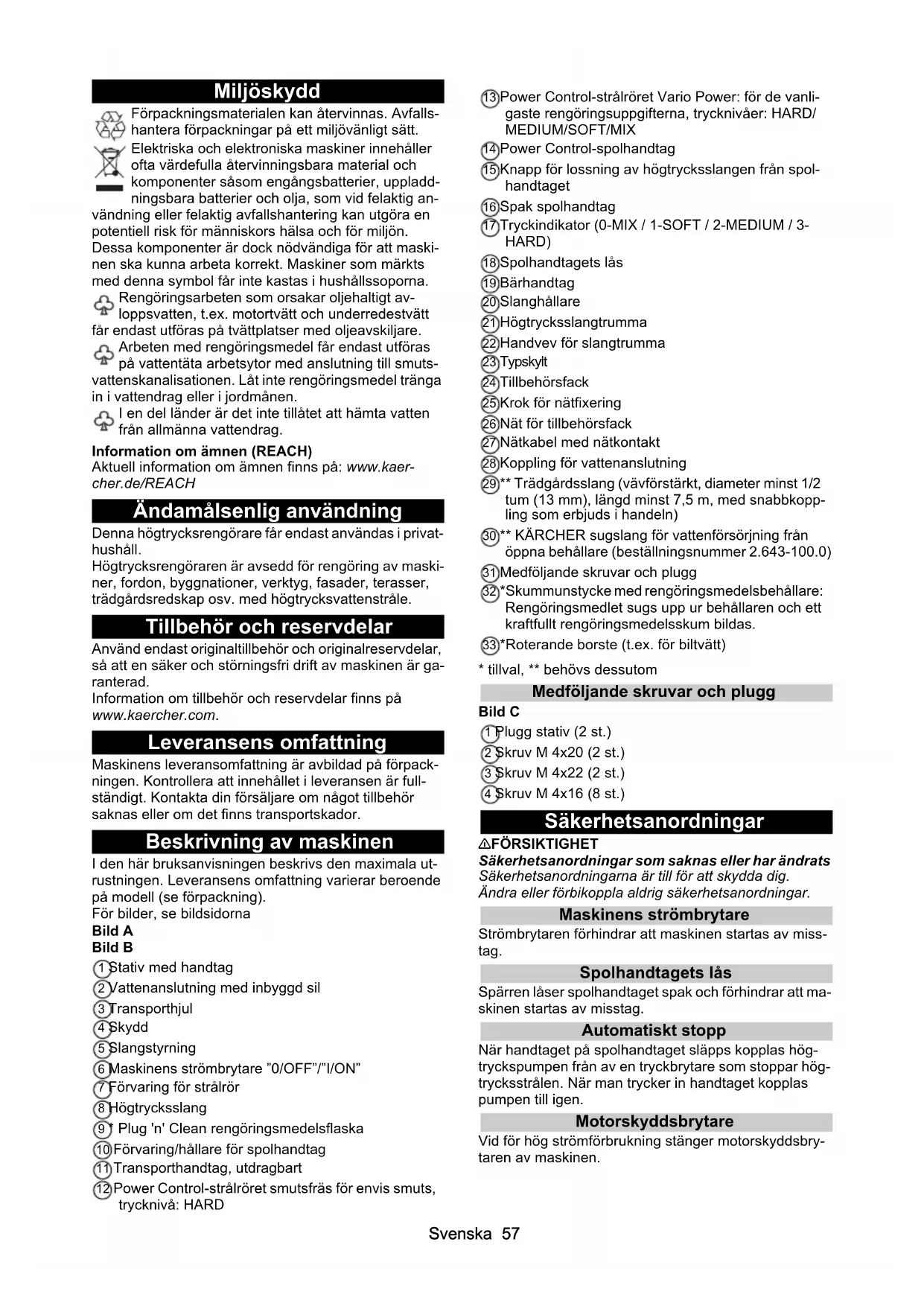 14 Power Control-spolhandtag 15 Knapp för lossning av högtrycksslangen från spol- handtaget 16 Spak spolhandtag 17 Tryckindikator (0-MIX / 1-SOFT / 2-MEDIUM / 3- HARD) 18 Spolhandtagets lås 19 Bärhandtag 20 Slanghållare 21 Högtrycksslangtrumma 22 Handvev för slangtrumma 23 Typskylt 24 Tillbehörsfack 25 Krok för nätfixering 26 Nät för tillbehörsfack 27 Nätkabel med nätkontakt 28 Koppling för vattenanslutning 29 ** Trädgårdsslang (vävförstärkt, diameter minst 1/2 tum (13 mm), längd minst 7,5 m, med snabbkopp- ling som erbjuds i handeln) 30 ** KÄRCHER sugslang för vattenförsörjning från öppna behållare (beställningsnummer 2.643-100.0) 31 Medföljande skruvar och plugg 32 *Skummunstycke med rengöringsmedelsbehållare: Rengöringsmedlet sugs upp ur behållaren och ett kraftfullt rengöringsmedelsskum bildas. 33 *Roterande borste (t.ex. för biltvätt)