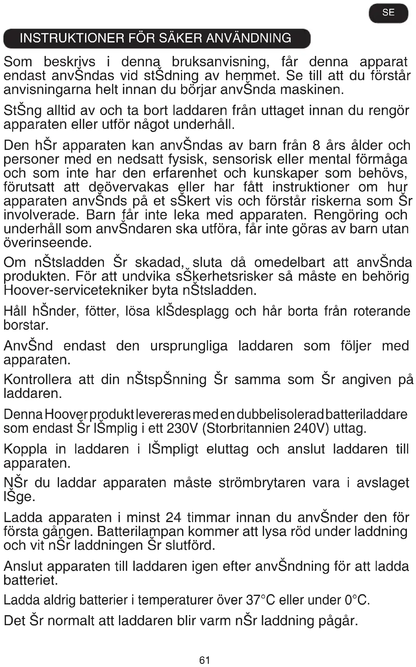Käytä vain alkuperäisiä Hoover-varaosia. Niitä on saatavana paikalliselta Hoover-jälleenmyyjältä tai valtuutetusta huoltoliikkeestä. Mainitse varaosatilauksen yhteydessä laitteen tyyppinumero. TAKUU Tämän laitteen takuuehdot määrittelee ostomaan Hoover-edustaja. Yksityiskohtaiset tiedot näistä ehdoista saa laitteen myyneeltä jälleenmyyjältä. Tämän takuun mukaisia vaateita esitettäessä on esitettävä myyntitodistus tai ostokuitti. TÄRKEÄÄ: Tämän imurin akun takuu on 6 kuukautta ostopäivästä. 6 kuukauden jälkeen asiakkaan on maksettava uusi akku. Oikeus muutoksiin pidätetään.61 INSTRUKTIONER FÖR SÄKER ANVÄNDNING Som beskrivs i denna bruksanvisning, får denna apparat endast användas vid städning av hemmet. Se till att du förstår anvisningarna helt innan du börjar använda maskinen. Stäng alltid av och ta bort laddaren från uttaget innan du rengör apparaten eller utför något underhåll. Den här apparaten kan användas av barn från 8 års ålder och personer med en nedsatt fysisk, sensorisk eller mental förmåga och som inte har den erfarenhet och kunskaper som behövs, förutsatt att deövervakas eller har fått instruktioner om hur apparaten används på et säkert vis och förstår riskerna som är involverade. Barn får inte leka med apparaten. Rengöring och underhåll som användaren ska utföra, får inte göras av barn utan överinseende. Om nätsladden är skadad, sluta då omedelbart att använda produkten. För att undvika säkerhetsrisker så måste en behörig Hoover-servicetekniker byta nätsladden. Håll händer, fötter, lösa klädesplagg och hår borta från roterande borstar. Använd endast den ursprungliga laddaren som följer med apparaten. Kontrollera att din nätspänning är samma som är angiven på laddaren. Denna Hoover produkt levereras med en dubbelisolerad batteriladdare som endast är lämplig i ett 230V (Storbritannien 240V) uttag. Koppla in laddaren i lämpligt eluttag och anslut laddaren till apparaten. När du laddar apparaten måste strömbrytaren vara i avslaget läge. Ladda apparaten i minst 24 timmar innan du använder den för första gången. Batterilampan kommer att lysa röd under laddning och vit när laddningen är slutförd. Anslut apparaten till laddaren igen efter användning för att ladda batteriet. Ladda aldrig batterier i temperaturer över 37°C eller under 0°C. Det är normalt att laddaren blir varm när laddning pågår. SE62 Dra inte ut kontakten till laddaren genom att dra i kabeln. Koppla ur laddaren vid långvarig frånvaro (semester, etc.). Ladda produkten igen innan användning då batterierna kan själv urladdas under förlängd förvaring. Om maskinen ska kasseras måste batterierna först tas bort. Maskinen måste kopplas bort från elnätet vid borttagning av batterierna. Kassera batterierna på ett säkert sätt. Kör apparaten tills den stannar på grund av att batterierna är helt urladdade. Använda batterier bör tas till en återvinningsstation och inte disponeras med hushållssoporna. För att tar bort batterierna, kontakta kundtjänsten på Hoover eller fortsätt enligt följande instruktioner. VIKTIGT: Ladda alltid ur batterier helt innan de tas ut. Kör apparaten tills det att batterierna är helt tomma. Dra ur laddarens stickpropp ur apparaten. Tryck på batteriets frikopplingsknapp och skjut fram för att ta bort det. [11] OBS! Om du upplever några svårigheter med att montera ner enheten eller för mer information om hantering eller återvinning av den här maskinen, var god och kontakta dina lokala myndigheter eller din återvinningsstation. Använd endast tillbehör, förbrukningsvaror och reservdelar som rekommenderas eller levereras av Hoover. Statisk elektricitet: Vissa mattor kan orsaka en liten uppbyggnad av statisk elektricitet. Elektrostatiska urladdningar är inte hälsofarliga. Använd inte apparaten utomhus eller på något vått underlag eller för våtupptagning. Dammsug inte hårda eller vassa föremål, tändstickor, het aska, fimpar eller andra liknande föremål. Plocka inte upp eller spraya med brandfarliga vätskor, rengöringsmedel, aerosoler eller ångor. Kör inte över sladden när du använder apparaten eller dra ut kontakten genom att dra i sladden. Fortsätt inte att använda apparaten eller laddaren om den verkar vara defekt. Hoover service: För att se till att maskinen fortsätter att vara effektiv och fungerar som den ska rekommenderar vi att service och reparationer endast utförs av behöriga servicetekniker från Hoover. SEPRODUKTKOMPONENTER
