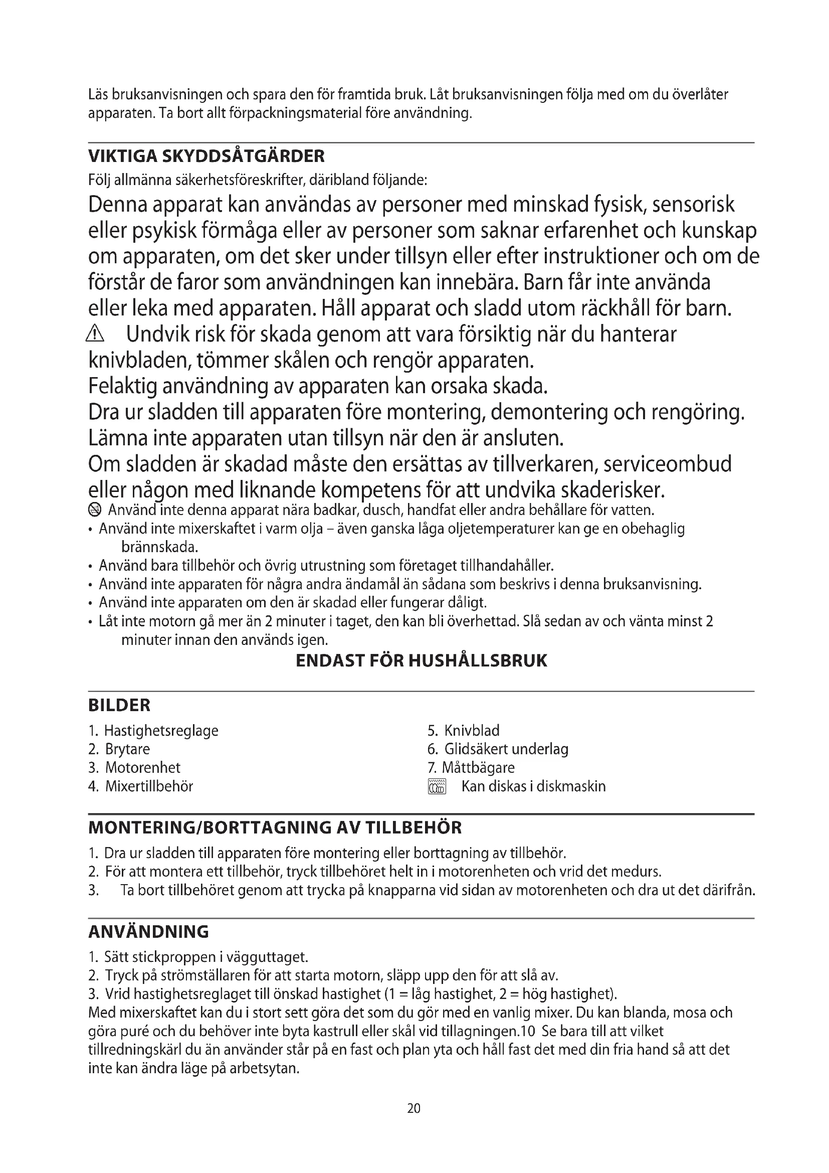 Följ allmänna säkerhetsföreskrifter, däribland följande: Denna apparat kan användas av personer med minskad fysisk, sensorisk eller psykisk förmåga eller av personer som saknar erfarenhet och kunskap om apparaten, om det sker under tillsyn eller efter instruktioner och om de förstår de faror som användningen kan innebära. Barn får inte använda eller leka med apparaten. Håll apparat och sladd utom räckhåll för barn. c Undvik risk för skada genom att vara försiktig när du hanterar knivbladen, tömmer skålen och rengör apparaten. Felaktig användning av apparaten kan orsaka skada. Dra ur sladden till apparaten före montering, demontering och rengöring. Lämna inte apparaten utan tillsyn när den är ansluten. Om sladden är skadad måste den ersättas av tillverkaren, serviceombud eller någon med liknande kompetens för att undvika skaderisker. b Använd inte denna apparat nära badkar, dusch, handfat eller andra behållare för vatten.
