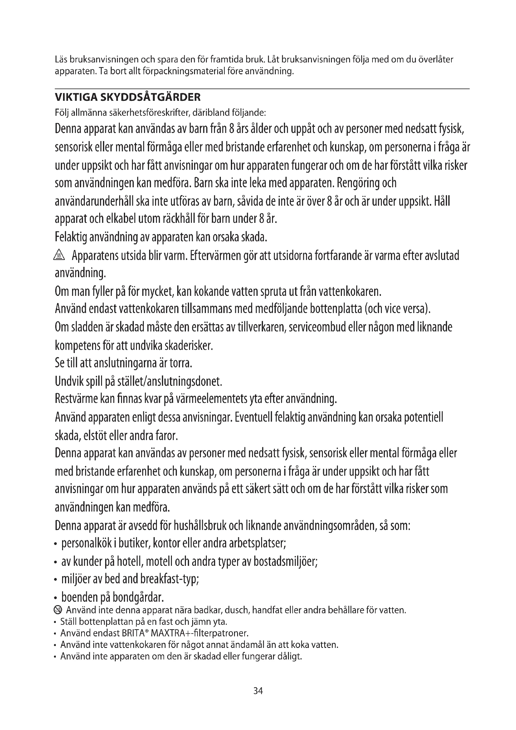 Följ allmänna säkerhetsföreskrifter, däribland följande: Denna apparat kan användas av barn från 8 års ålder och uppåt och av personer med nedsatt fysisk, sensorisk eller mental förmåga eller med bristande erfarenhet och kunskap, om personerna i fråga är under uppsikt och har fått anvisningar om hur apparaten fungerar och om de har förstått vilka risker som användningen kan medföra. Barn ska inte leka med apparaten. Rengöring och användarunderhåll ska inte utföras av barn, såvida de inte är över 8 år och är under uppsikt. Håll apparat och elkabel utom räckhåll för barn under 8 år. Felaktig användning av apparaten kan orsaka skada. h Apparatens utsida blir varm. Eftervärmen gör att utsidorna fortfarande är varma efter avslutad användning. Om man fyller på för mycket, kan kokande vatten spruta ut från vattenkokaren. Använd endast vattenkokaren tillsammans med medföljande bottenplatta (och vice versa). Om sladden är skadad måste den ersättas av tillverkaren, serviceombud eller någon med liknande kompetens för att undvika skaderisker. Se till att anslutningarna är torra. Undvik spill på stället/anslutningsdonet. Restvärme kan nnas kvar på värmeelementets yta efter användning. Använd apparaten enligt dessa anvisningar. Eventuell felaktig användning kan orsaka potentiell skada, elstöt eller andra faror. Denna apparat kan användas av personer med nedsatt fysisk, sensorisk eller mental förmåga eller med bristande erfarenhet och kunskap, om personerna i fråga är under uppsikt och har fått anvisningar om hur apparaten används på ett säkert sätt och om de har förstått vilka risker som användningen kan medföra. Denna apparat är avsedd för hushållsbruk och liknande användningsområden, så som: