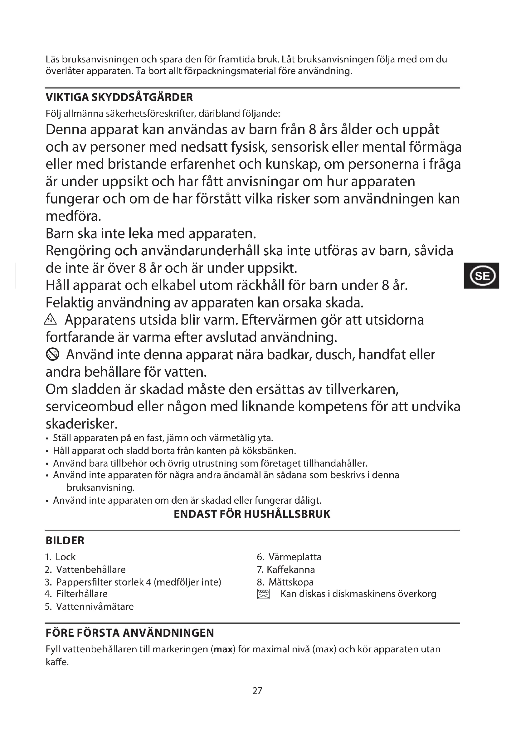 Följ allmänna säkerhetsföreskrifter, däribland följande: Denna apparat kan användas av barn från 8 års ålder och uppåt och av personer med nedsatt fysisk, sensorisk eller mental förmåga eller med bristande erfarenhet och kunskap, om personerna i fråga är under uppsikt och har fått anvisningar om hur apparaten fungerar och om de har förstått vilka risker som användningen kan medföra. Barn ska inte leka med apparaten. Rengöring och användarunderhåll ska inte utföras av barn, såvida de inte är över 8 år och är under uppsikt. Håll apparat och elkabel utom räckhåll för barn under 8 år. Felaktig användning av apparaten kan orsaka skada. h Apparatens utsida blir varm. Eftervärmen gör att utsidorna fortfarande är varma efter avslutad användning. b Använd inte denna apparat nära badkar, dusch, handfat eller andra behållare för vatten. Om sladden är skadad måste den ersättas av tillverkaren, serviceombud eller någon med liknande kompetens för att undvika skaderisker.
