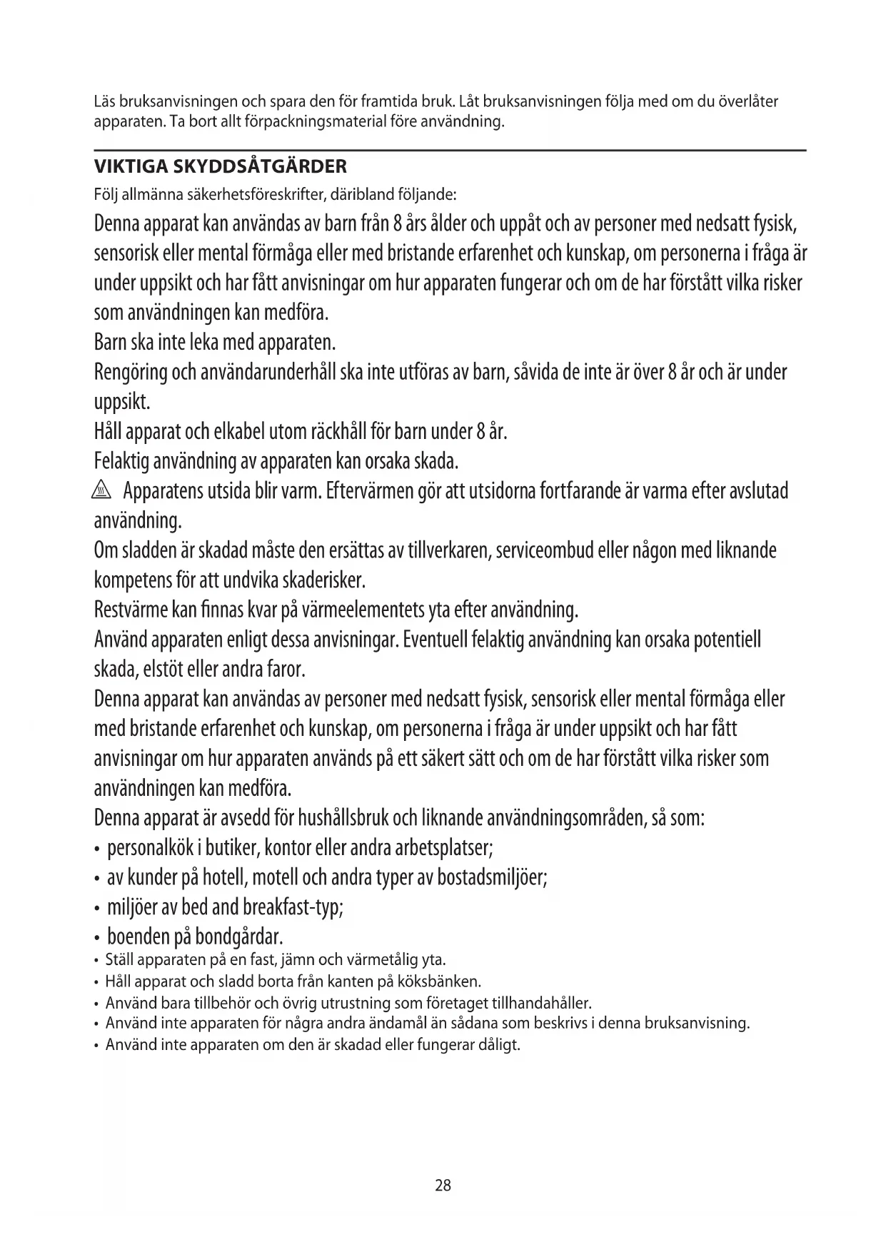 Följ allmänna säkerhetsföreskrifter, däribland följande: Denna apparat kan användas av barn från 8 års ålder och uppåt och av personer med nedsatt fysisk, sensorisk eller mental förmåga eller med bristande erfarenhet och kunskap, om personerna i fråga är under uppsikt och har fått anvisningar om hur apparaten fungerar och om de har förstått vilka risker som användningen kan medföra. Barn ska inte leka med apparaten. Rengöring och användarunderhåll ska inte utföras av barn, såvida de inte är över 8 år och är under uppsikt. Håll apparat och elkabel utom räckhåll för barn under 8 år. Felaktig användning av apparaten kan orsaka skada. h Apparatens utsida blir varm. Eftervärmen gör att utsidorna fortfarande är varma efter avslutad användning. Om sladden är skadad måste den ersättas av tillverkaren, serviceombud eller någon med liknande kompetens för att undvika skaderisker. Restvärme kan nnas kvar på värmeelementets yta efter användning. Använd apparaten enligt dessa anvisningar. Eventuell felaktig användning kan orsaka potentiell skada, elstöt eller andra faror. Denna apparat kan användas av personer med nedsatt fysisk, sensorisk eller mental förmåga eller med bristande erfarenhet och kunskap, om personerna i fråga är under uppsikt och har fått anvisningar om hur apparaten används på ett säkert sätt och om de har förstått vilka risker som användningen kan medföra. Denna apparat är avsedd för hushållsbruk och liknande användningsområden, så som: