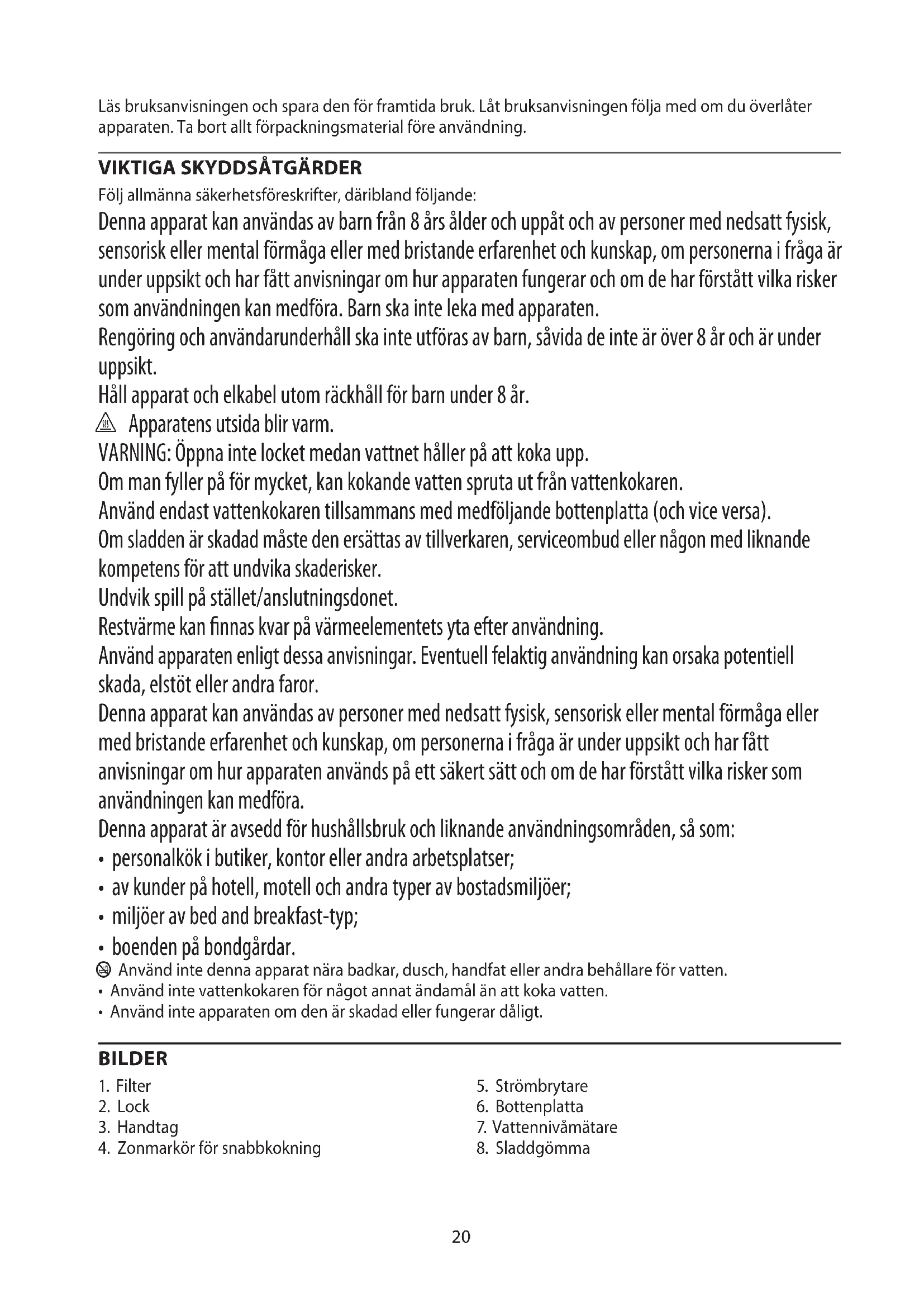 Följ allmänna säkerhetsföreskrifter, däribland följande: Denna apparat kan användas av barn från 8 års ålder och uppåt och av personer med nedsatt fysisk, sensorisk eller mental förmåga eller med bristande erfarenhet och kunskap, om personerna i fråga är under uppsikt och har fått anvisningar om hur apparaten fungerar och om de har förstått vilka risker som användningen kan medföra. Barn ska inte leka med apparaten. Rengöring och användarunderhåll ska inte utföras av barn, såvida de inte är över 8 år och är under uppsikt. Håll apparat och elkabel utom räckhåll för barn under 8 år. h Apparatens utsida blir varm. VARNING: Öppna inte locket medan vattnet håller på att koka upp. Om man fyller på för mycket, kan kokande vatten spruta ut från vattenkokaren. Använd endast vattenkokaren tillsammans med medföljande bottenplatta (och vice versa). Om sladden är skadad måste den ersättas av tillverkaren, serviceombud eller någon med liknande kompetens för att undvika skaderisker. Undvik spill på stället/anslutningsdonet. Restvärme kan nnas kvar på värmeelementets yta efter användning. Använd apparaten enligt dessa anvisningar. Eventuell felaktig användning kan orsaka potentiell skada, elstöt eller andra faror. Denna apparat kan användas av personer med nedsatt fysisk, sensorisk eller mental förmåga eller med bristande erfarenhet och kunskap, om personerna i fråga är under uppsikt och har fått anvisningar om hur apparaten används på ett säkert sätt och om de har förstått vilka risker som användningen kan medföra. Denna apparat är avsedd för hushållsbruk och liknande användningsområden, så som: