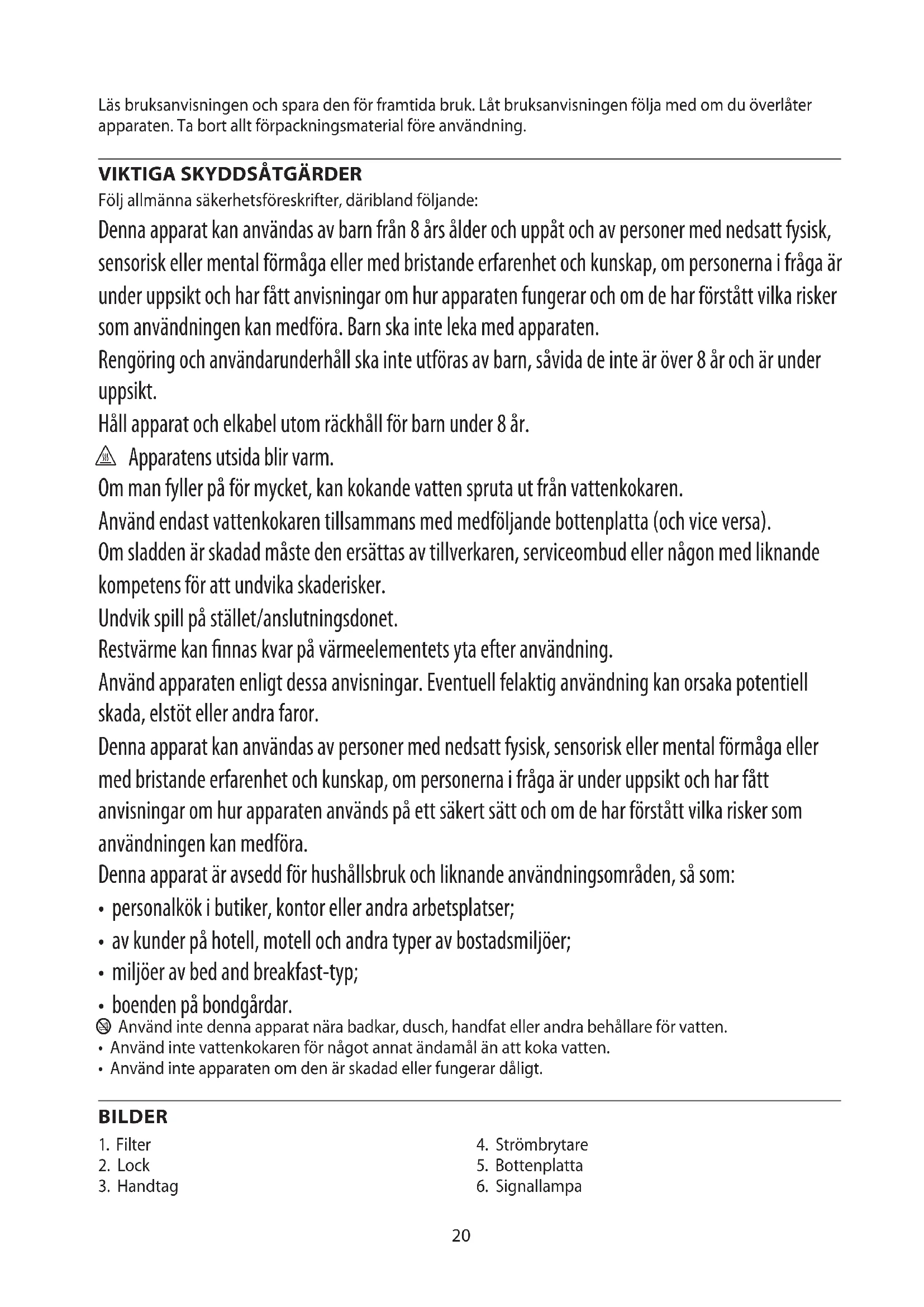 Följ allmänna säkerhetsföreskrifter, däribland följande: Denna apparat kan användas av barn från 8 års ålder och uppåt och av personer med nedsatt fysisk, sensorisk eller mental förmåga eller med bristande erfarenhet och kunskap, om personerna i fråga är under uppsikt och har fått anvisningar om hur apparaten fungerar och om de har förstått vilka risker som användningen kan medföra. Barn ska inte leka med apparaten. Rengöring och användarunderhåll ska inte utföras av barn, såvida de inte är över 8 år och är under uppsikt. Håll apparat och elkabel utom räckhåll för barn under 8 år. h Apparatens utsida blir varm. Om man fyller på för mycket, kan kokande vatten spruta ut från vattenkokaren. Använd endast vattenkokaren tillsammans med medföljande bottenplatta (och vice versa). Om sladden är skadad måste den ersättas av tillverkaren, serviceombud eller någon med liknande kompetens för att undvika skaderisker. Undvik spill på stället/anslutningsdonet. Restvärme kan finnas kvar på värmeelementets yta efter användning. Använd apparaten enligt dessa anvisningar. Eventuell felaktig användning kan orsaka potentiell skada, elstöt eller andra faror. Denna apparat kan användas av personer med nedsatt fysisk, sensorisk eller mental förmåga eller med bristande erfarenhet och kunskap, om personerna i fråga är under uppsikt och har fått anvisningar om hur apparaten används på ett säkert sätt och om de har förstått vilka risker som användningen kan medföra. Denna apparat är avsedd för hushållsbruk och liknande användningsområden, så som: