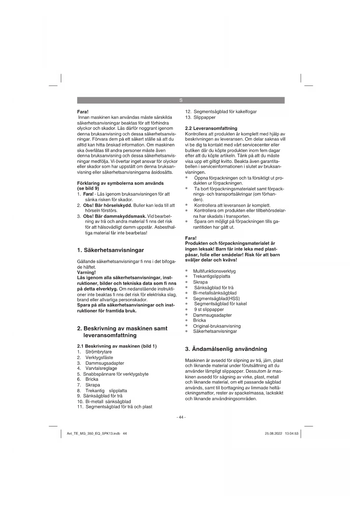 Maskinen är avsedd för slipning av trä, järn, plast och liknande material under förutsättning att du använder lämpligt slippapper. Dessutom är mas- kinen avsedd för sågning av virke, plast, metall och liknande material, om ett passande sågblad används, samt till borttagning av limmade heltä- ckningsmattor, rester av spackelmassa, lackskikt och liknande användningsområden. Anl_TE_MG_350_EQ_SPK13.indb 44Anl_TE_MG_350_EQ_SPK13.indb 44 25.08.2022 13:04:5325.08.2022 13:04:53S