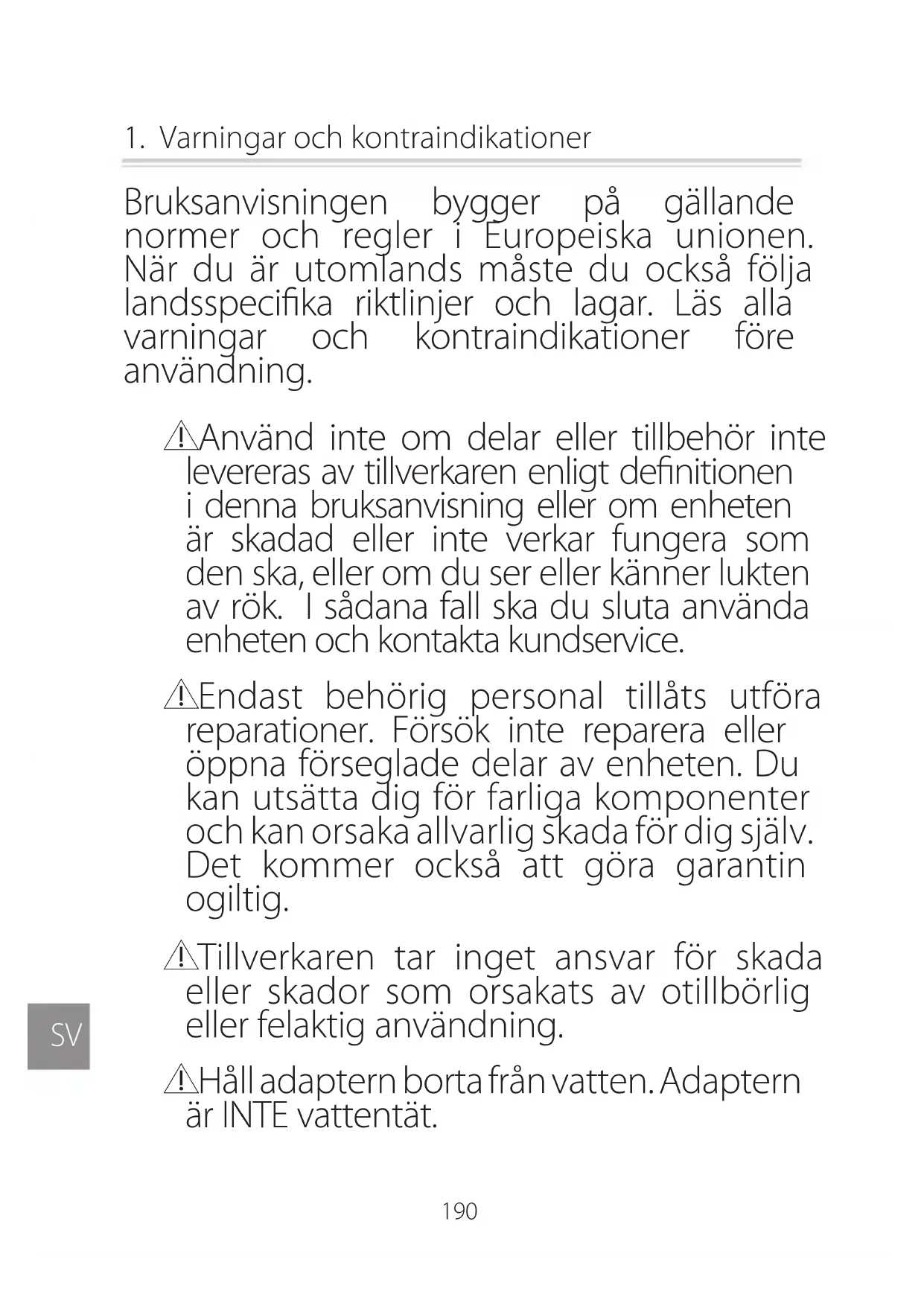 Bruksanvisningen bygger på gällande normer och regler i Europeiska unionen. När du är utomlands måste du också följa landsspecika riktlinjer och lagar. Läs alla varningar och kontraindikationer före användning. C Använd inte om delar eller tillbehör inte levereras av tillverkaren enligt denitionen i denna bruksanvisning eller om enheten är skadad eller inte verkar fungera som den ska, eller om du ser eller känner lukten av rök. I sådana fall ska du sluta använda enheten och kontakta kundservice. C Endast behörig personal tillåts utföra reparationer. Försök inte reparera eller öppna förseglade delar av enheten. Du kan utsätta dig för farliga komponenter och kan orsaka allvarlig skada för dig själv. Det kommer också att göra garantin ogiltig. C Tillverkaren tar inget ansvar för skada eller skador som orsakats av otillbörlig eller felaktig användning. C Håll adaptern borta från vatten. Adaptern är INTE vattentät. PURE UM EU124 1166E inside ED578-02 release combined.indd 190PURE UM EU124 1166E inside ED578-02 release combined.indd 190 15/06/2020 11:36:4215/06/2020 11:36:42191