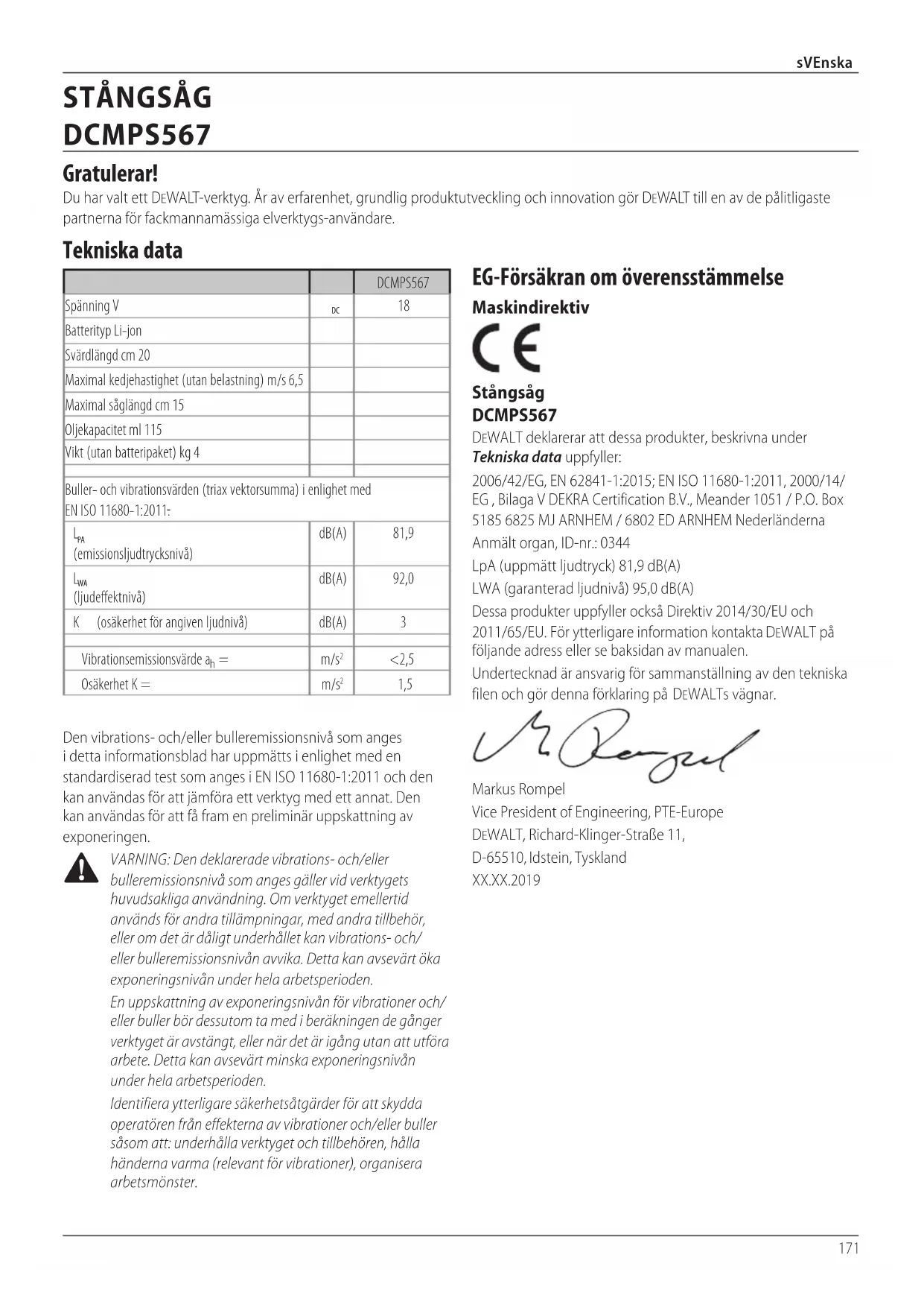 - DCMPS567 edellyttää varaketjun, varaosanumero DT20667-QZ. Varalaippa 20 cm (8 tuumaa), varaosanumeroDT20668-QZ.171 sVEnska EG-Försäkran om överensstämmelse Maskindirektiv Stångsåg DCMPS567 DeWALT deklarerar att dessa produkter, beskrivna under Tekniska data uppfyller: