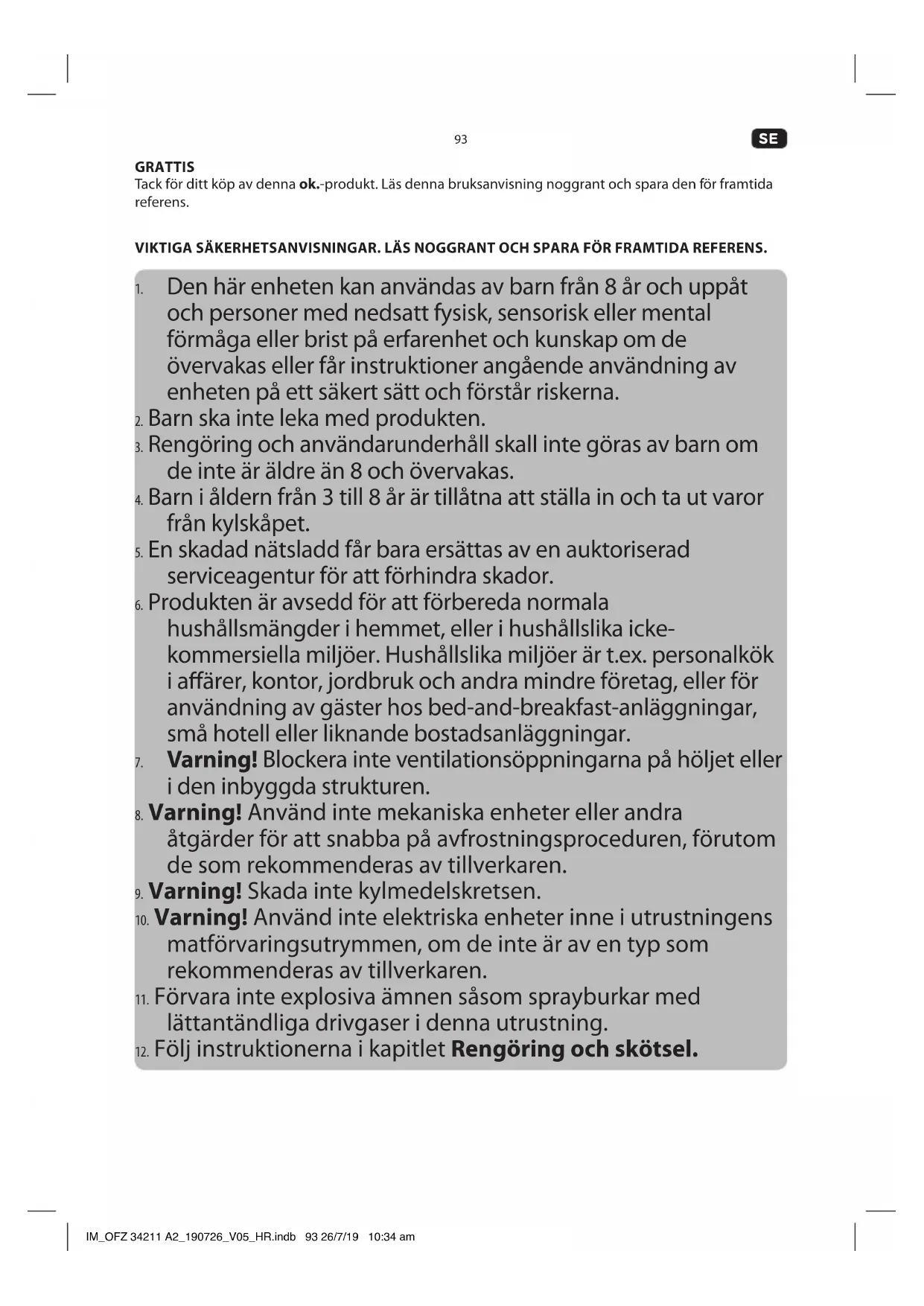 - Varje gång som produkten yttas måste du låta den stå utan att vara inkopplad under minst 6 hrs innan du använder den igen för att låta kylsystemet få tillbaka full kapacitet. IM_OFZ 34211 A2_190726_V05_HR.indb 96 26/7/19 10:34 am97