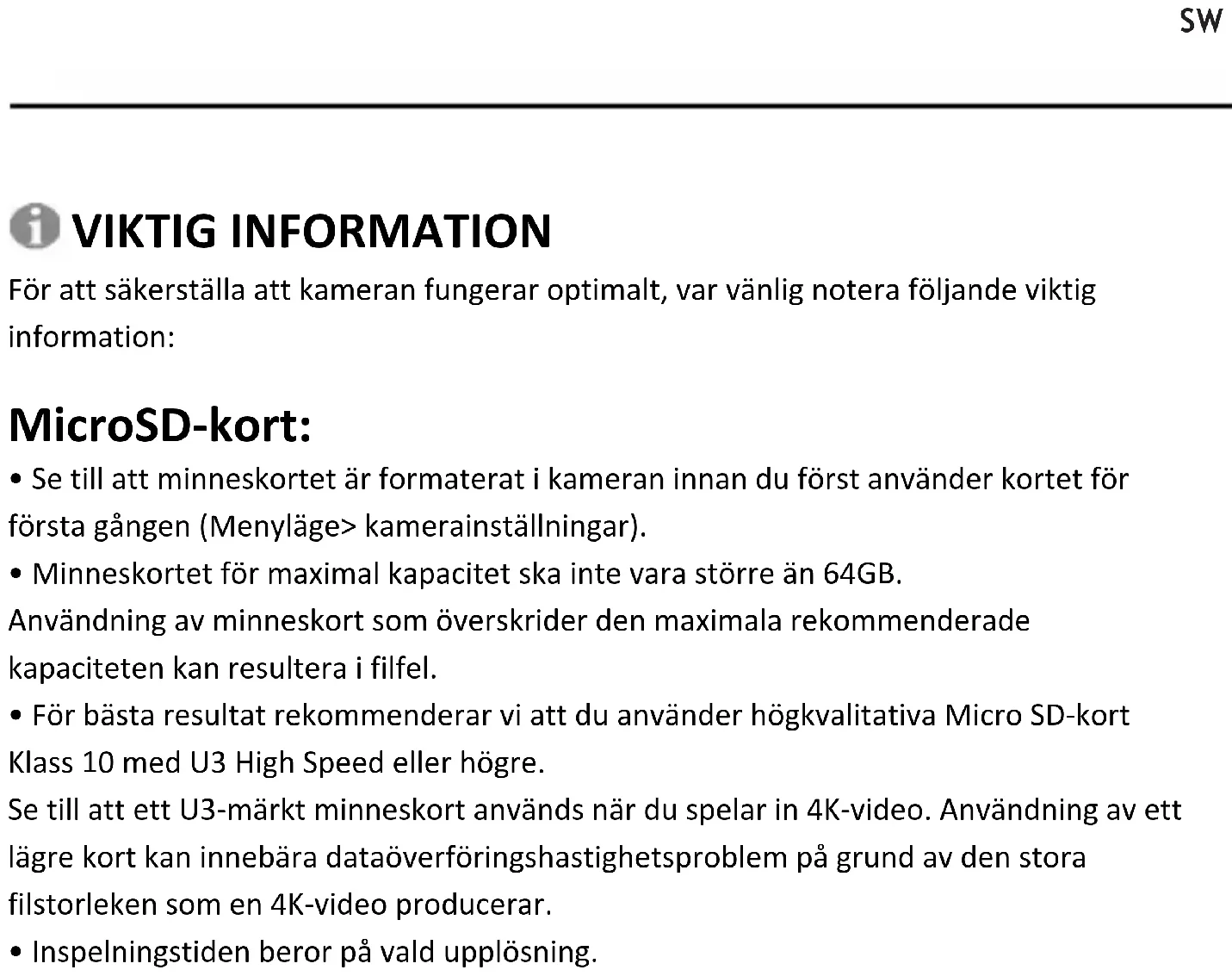 VIKTIG INFORMATION För att säkerställa att kameran fungerar optimalt, var vänlig notera följande viktig information: MicroSD-kort: