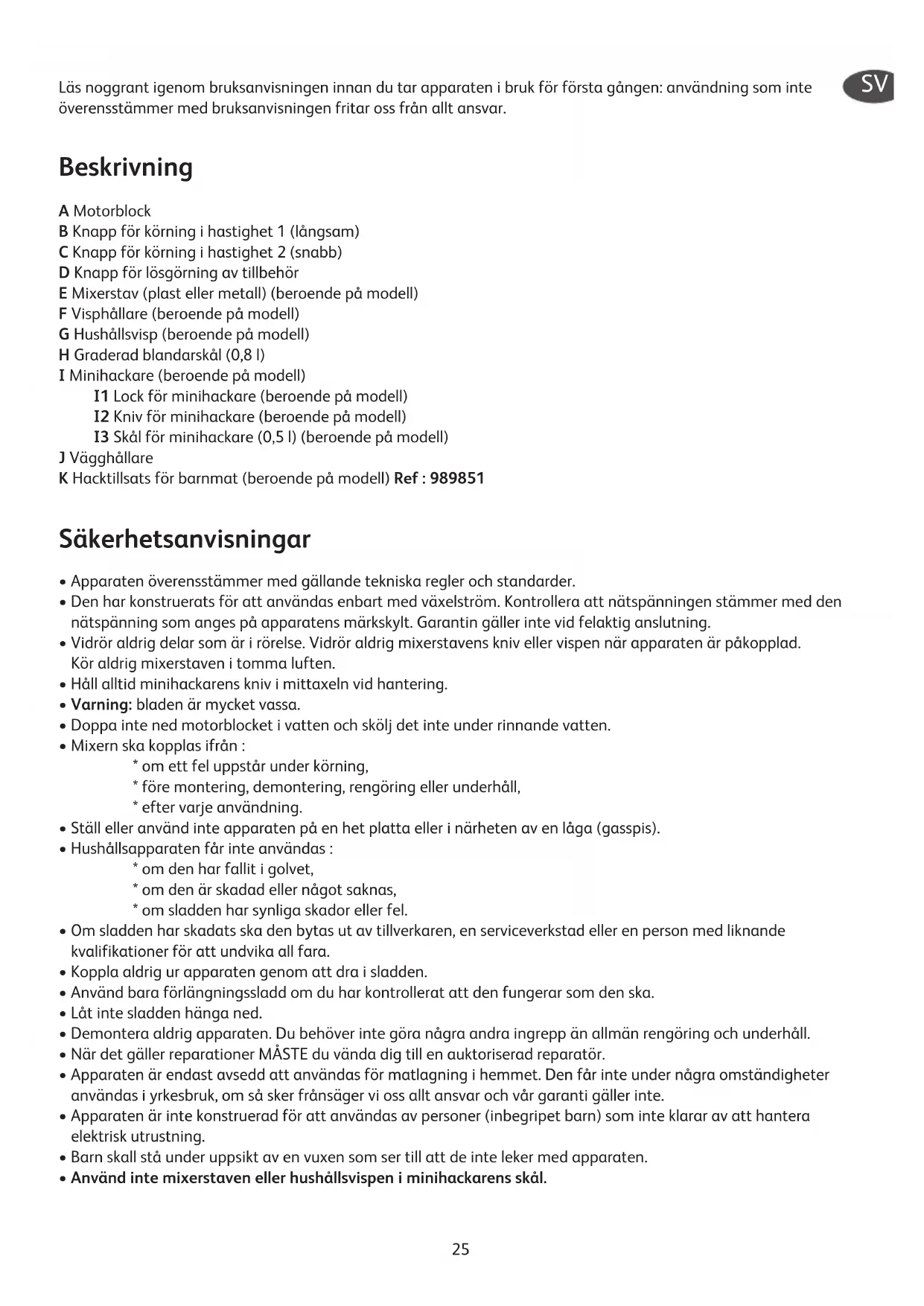 Ürün Kullanım Ömrü: 7 Yıl25 Läs noggrant igenom bruksanvisningen innan du tar apparaten i bruk för första gången: användning som inte överensstämmer med bruksanvisningen fritar oss från allt ansvar. Beskrivning A Motorblock B Knapp för körning i hastighet 1 (långsam) C Knapp för körning i hastighet 2 (snabb) D Knapp för lösgörning av tillbehör E Mixerstav (plast eller metall) (beroende på modell) F Visphållare (beroende på modell) G Hushållsvisp (beroende på modell) H Graderad blandarskål (0,8 l) I Minihackare (beroende på modell) I1 Lock för minihackare (beroende på modell) I2 Kniv för minihackare (beroende på modell) I3 Skål för minihackare (0,5 l) (beroende på modell) J Vägghållare K Hacktillsats för barnmat (beroende på modell) Ref : 989851 Säkerhetsanvisningar