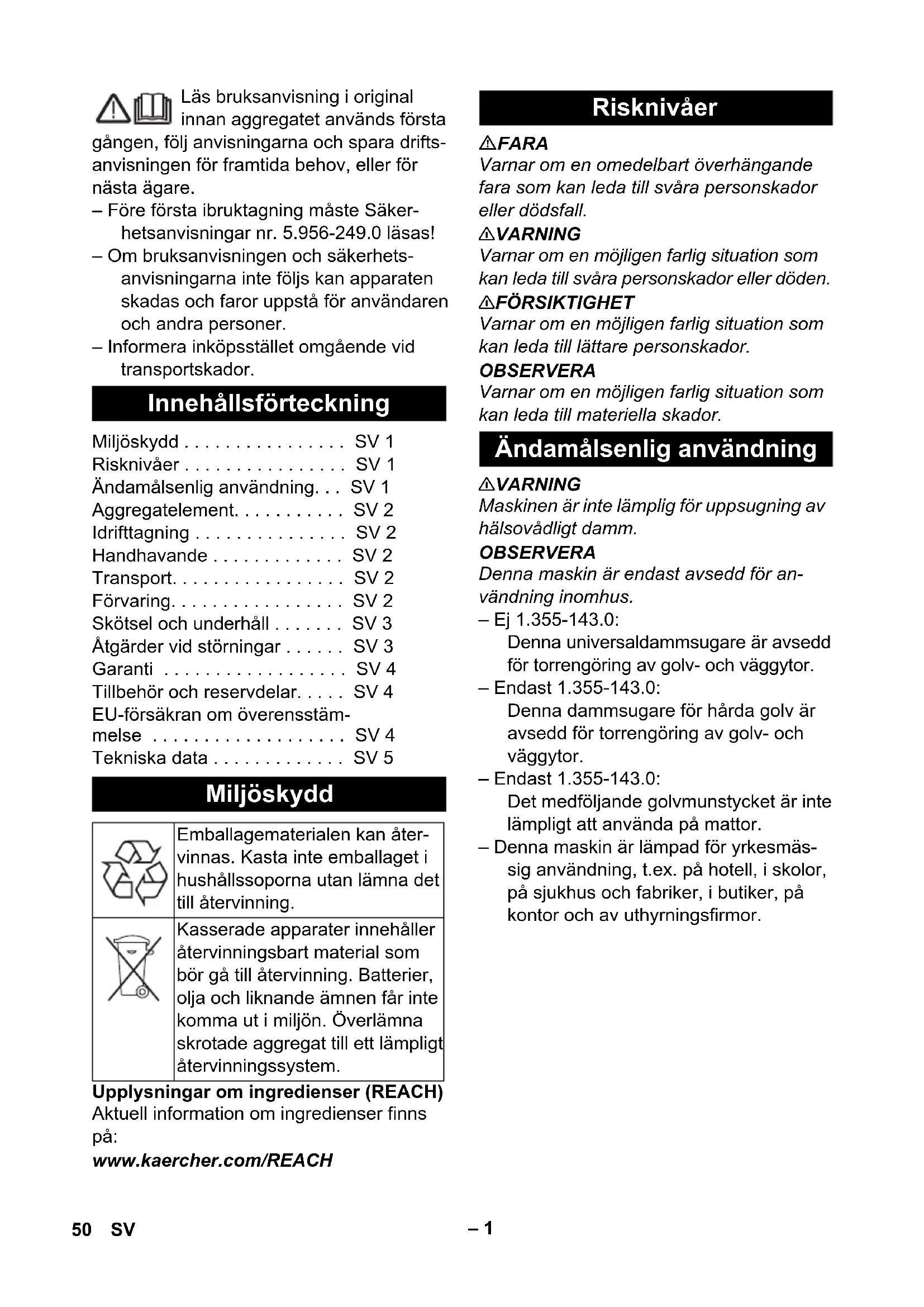 Best.nr. Kabellengde EU 6.650-622.0 12 m GB 6.650-641.0 12 m CH 6.650-638.0 12 m 49NO– 1 Läs bruksanvisning i original innan aggregatet används första gången, följ anvisningarna och spara drifts- anvisningen för framtida behov, eller för nästa ägare. – Före första ibruktagning måste Säker- hetsanvisningar nr. 5.956-249.0 läsas! – Om bruksanvisningen och säkerhets- anvisningarna inte följs kan apparaten skadas och faror uppstå för användaren och andra personer. – Informera inköpsstället omgående vid transportskador. Upplysningar om ingredienser (REACH) Aktuell information om ingredienser finns på: www.kaercher.com/REACH FARA Varnar om en omedelbart överhängande fara som kan leda till svåra personskador eller dödsfall. 몇 VARNING Varnar om en möjligen farlig situation som kan leda till svåra personskador eller döden. 몇 FÖRSIKTIGHET Varnar om en möjligen farlig situation som kan leda till lättare personskador. OBSERVERA Varnar om en möjligen farlig situation som kan leda till materiella skador. 몇 VARNING Maskinen är inte lämplig för uppsugning av hälsovådligt damm. OBSERVERA Denna maskin är endast avsedd för an- vändning inomhus. – Ej 1.355-143.0: Denna universaldammsugare är avsedd för torrengöring av golv- och väggytor. – Endast 1.355-143.0: Denna dammsugare för hårda golv är avsedd för torrengöring av golv- och väggytor. – Endast 1.355-143.0: Det medföljande golvmunstycket är inte lämpligt att använda på mattor. – Denna maskin är lämpad för yrkesmäs- sig användning, t.ex. på hotell, i skolor, på sjukhus och fabriker, i butiker, på kontor och av uthyrningsfirmor. Innehållsförteckning Miljöskydd . . . . . . . . . . . . . . . . SV 1 Risknivåer . . . . . . . . . . . . . . . . SV 1 Ändamålsenlig användning. . . SV 1 Aggregatelement. . . . . . . . . . . SV 2 Idrifttagning . . . . . . . . . . . . . . . SV 2 Handhavande . . . . . . . . . . . . . SV 2 Transport. . . . . . . . . . . . . . . . . SV 2 Förvaring. . . . . . . . . . . . . . . . . SV 2 Skötsel och underhåll . . . . . . . SV 3 Åtgärder vid störningar . . . . . . SV 3 Garanti . . . . . . . . . . . . . . . . . . SV 4 Tillbehör och reservdelar. . . . . SV 4 EU-försäkran om överensstäm- melse . . . . . . . . . . . . . . . . . . . SV 4 Tekniska data . . . . . . . . . . . . . SV 5 Miljöskydd Emballagematerialen kan åter- vinnas. Kasta inte emballaget i hushållssoporna utan lämna det till återvinning. Kasserade apparater innehåller återvinningsbart material som bör gå till återvinning. Batterier, olja och liknande ämnen får inte komma ut i miljön. Överlämna skrotade aggregat till ett lämpligt återvinningssystem. Risknivåer Ändamålsenlig användning 50 SV– 2 1 Filterdukspåse 2 Sugfästen 3 Sugslang 4 Typskylt 5 Kabelkrok 6 Bärhandtag 7 Nätkabel 8 Sughuvud 9 Spärr av sughuvud 10 Styrrulle 11 Smutsbehållare 12 Eluttag till el-sugborste 13 Huvudströmbrytare 14 Omkopplare hård yta/mattor (beroende på utrustning) 15 Golvmunstycke 16 Sugrör 17 Nätkontaktsfixering 18 Fäste för golvborste 19 Förregling av skyddet 20 Skydd 21 Filterkåpa 22 Frånluftsfilter 23 Sugkraftinställning (steglös) 24 Krök 25 Huvudfilterkorg 26 Motorskyddsfilter – Manöverelement för rengöringsproces- sen är gula. – Manöverelement för underhåll och ser- vice är ljusgrå. Kontroll om huvudfilterkorgen är insatt i apparaten. 1 Användning med filterdukspåse eller pappersfilterpåse (specialtillbehör) 2 Använding utan filterpåse Lossa spärr på sughuvudet och ta av det. Ta ur huvudfilterkorg. Trä på filterpåse eller pappersfilterpåse (specialtillbehör). Sätt i huvudfilterkorgen. Sätt på sughuvudet och lås fast. Stick i nätkontakten. Starta maskinen med huvudbrytaren. Ställ omkopplaren på hård yta eller mat- ta. Reglera sugkraften med inställningen för sugkraften (steglös). Genomför rengöringsarbetet. Stäng av maskinen med huvudbrytaren. Drag ur nätkontakten. Töm behållaren. Rengör apparaten invändigt och utvän- digt genom uppsugning och torka med en fuktig trasa. 몇 FÖRSIKTIGHET Risk för person och egendomsskada! Ob- servera vid transport maskinens vikt. Vid transport i fordon ska maskinen säkras enligt respektive gällande be- stämmelser så den inte kan tippa eller glida. 몇 FÖRSIKTIGHET Risk för person och egendomsskada! Ob- servera maskinens vikt vid lagring. Denna maskin får endast lagras inomhus. Aggregatelement Färgmärkning Idrifttagning Driftslägen Isättning av filterpåse Handhavande Koppla till aggregatet Rengöringsdrift Koppla från aggregatet Efter varje användning Transport Förvaring 51SV– 3 FARA Stäng alltid av aggregatet och lossa nät- kontakten innan arbeten på aggregatet ut- förs. Slå ur smutsen ut huvudfilterkorgen (ur- tvättbar) och rengör vid behov under rinnande vatten. OBSERVERA Fara för skada! Sätt aldrig i huvudfilterkor- gen när den är blöt. Frånluftsfilter: byt en gång varje år Lossa skyddet och ta av det. Ta ur filterhuset. Ta ur det utgående luftfiltret ut filterhu- set. Sätt i ett nytt utgående luftfilter i filterhu- set. Sätt i filterhus. Sätt tillbaka skyddet och regla fast det. Lossa spärr på sughuvudet och ta av det. Ta ur motorskyddsfilter. Sätt i nytt motorskyddsfilter. Sätt på sughuvudet och lås fast. Bara T 12/1 eco!efficiency: Bild FARA Stäng alltid av aggregatet och lossa nät- kontakten innan arbeten på aggregatet ut- förs. – Motor-Termoprotektor har trätt i funktion. Byt filterdukspåse eller pappersfilterpå- se (specialtillbehör) Byt motorskyddsfilter. Byta frånluftsfilter. Kontrollera alla delar avseende tilltäpp- ning. Återstart efter avkylning av motorturbinen efter ca 30-40 minuter. Kontrollera eluttaget och strömförsörj- ningens säkring. Kontrollera apparatens nätkabel och nätkontakt. Slå på apparaten. Avlägsna stopp i sugmunstycke, sugrör eller sugslang. Byt filterdukspåse eller pappersfilt