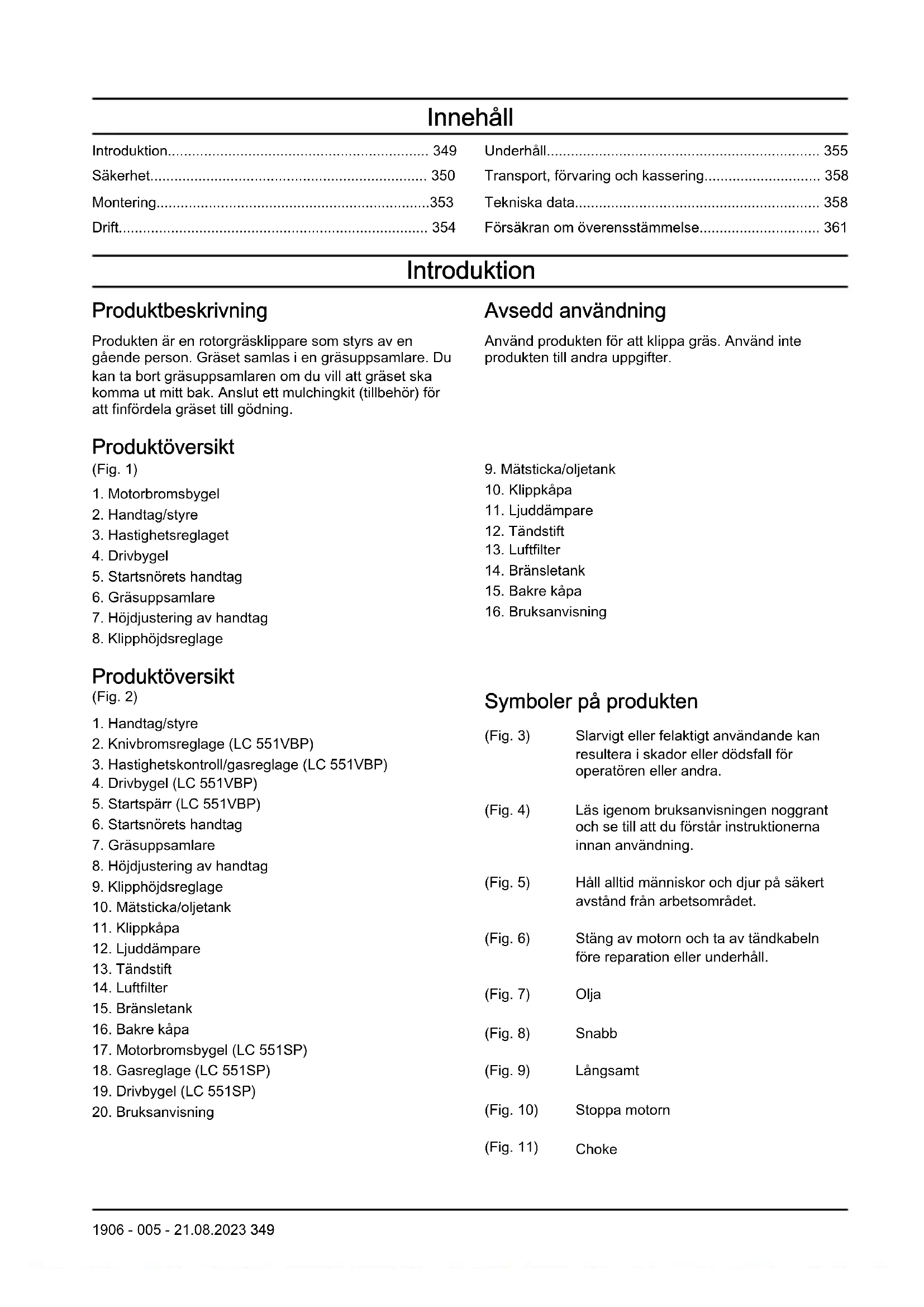Symboler på produkten (Fig. 3) Slarvigt eller felaktigt användande kan resultera i skador eller dödsfall för operatören eller andra. (Fig. 4) Läs igenom bruksanvisningen noggrant och se till att du förstår instruktionerna innan användning. (Fig. 5) Håll alltid människor och djur på säkert avstånd från arbetsområdet. (Fig. 6) Stäng av motorn och ta av tändkabeln före reparation eller underhåll. (Fig. 7) Olja (Fig. 8) Snabb (Fig. 9) Långsamt (Fig. 10) Stoppa motorn (Fig. 11) Choke 1906 - 005 - 21.08.2023 349(Fig. 12) Knivkoppling (Fig. 13) Akta dig för utslungade föremål och rikoschetter. (Fig. 14) Håll händer och fötter borta från den roterande kniven. (Fig. 15) Håll händer och fötter borta från roterande delar. (Fig. 16) Produkten överensstämmer med gällande EU-direktiv. (Fig. 17) Produkten överensstämmer med gällande brittiska direktiv. (Fig. 18) Miljömärkning för bulleremission enligt direktiv och bestämmelser för EU och Storbritannien samt New South Wales-lagen "Protection of the Environment Operations (Noise Control) Regulation 2017". Produktens garanterade ljudeffektnivå anges i Tekniska data på sida 358 och på etiketten (Fig. 19) Motorns avgaser innehåller kolmonoxid, en luktlös, giftig och mycket farlig gas. Kör inte produkten inomhus eller i slutna utrymmen. (Fig. 20) Kör inte produkten inomhus eller i slutna utrymmen. (Fig. 21) Risk för explosion. (Fig. 22) Het yta (Fig. 23) Motorn levereras utan olja. (Fig. 24) Fyll på olja innan du använder produkten. (Fig. 25) Använd inte E85-bränsle. (Fig. 26) Håll produkten borta från öppna lågor. (Fig. 27) Kod som kan skannas. Notera: Andra symboler/dekaler på produkten hänvisar till marknadsspecifika juridiska krav. Euro V-utsläpp VARNING: Manipulering av motorn upphäver EG-typgodkännandet för den här produkten. Produktansvar Enligt lagstiftningen för produktansvar ansvarar vi inte för skador som vår produkt orsakar om: