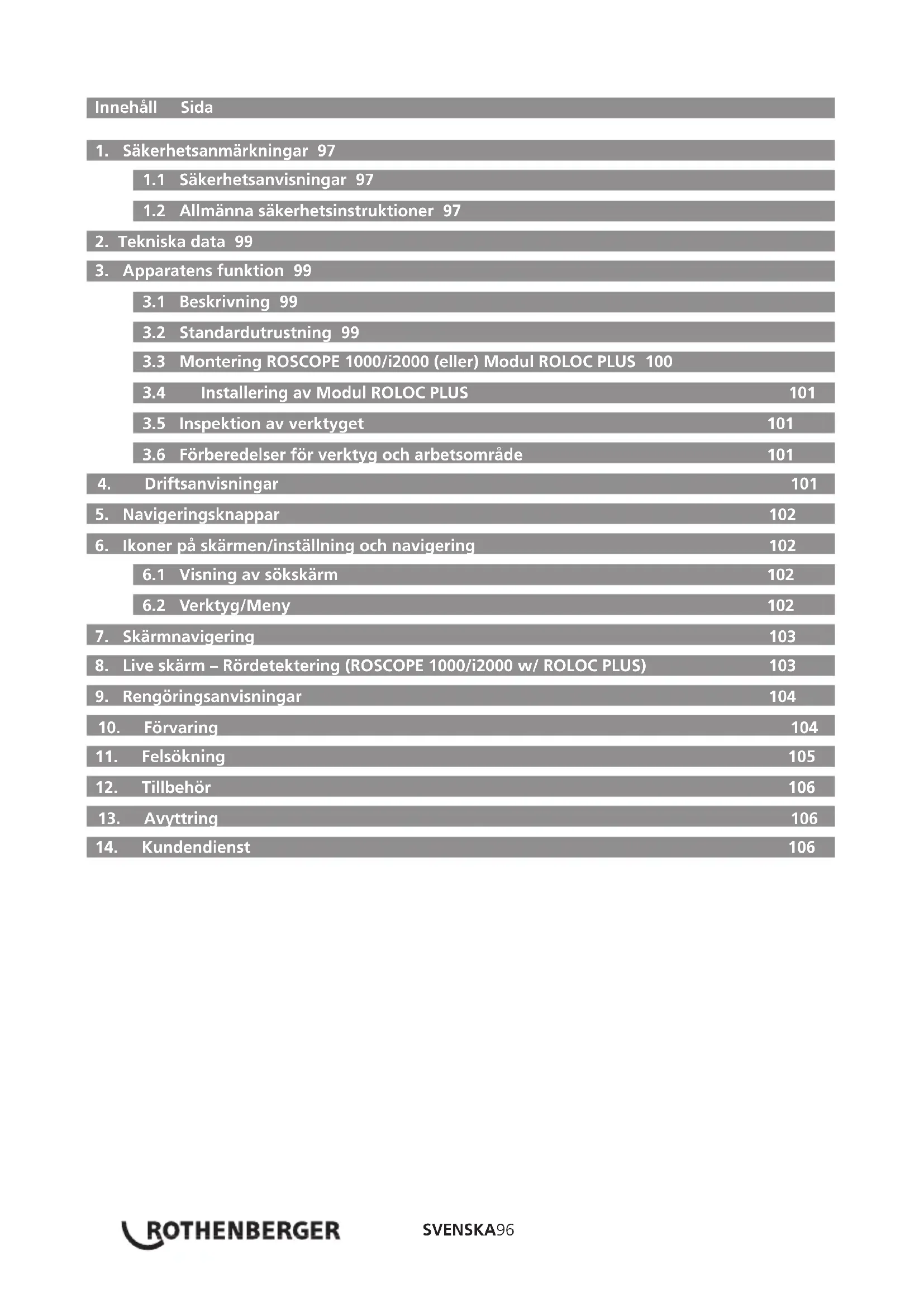 Symptom Möjlig orsak Åtgärd Displayen tänds inte Batteriet är urladdat Ladda batteriet Kontrollera att batteriet sitter i Sätt i batteriet i batteriluckan Elektronikfel Kontakta ROTHENBERGER Service Center Displayen tänds men ingen bild visas Lösa kabelanslutningar Kontrollera kabelanslutningarna Bildgeneratorhuvudet är täckt av smuts Rengör bildgeneratorhuvudet Displayen visar bild utan mottagning Bildgeneratorns processor har stött på ett fel Stäng av enheten och sätt på den igen för att återställa. Batteriet håller sig inte laddat Batteriet kan ha laddat ur under förvaringen Ta bort batteriet när enheten inte används. Drifttiden beror på LED-användning Ladda batteriet oftare när LED används mycket. Batteriet kan vara skadat Byt batteri Batteriet är slut Byt batteri Ingen signal Fel frekvens Verifiera frekvensen för din sond och anpassa ROLOC frekvensen via menyn Djupmätning Visar: ROLOC PLUS är utanför räckvidden Verifiera starkaste signalen ROSCOPE 1000/i2000 Felkod 1 “urkopplad” Fel uppstår när bildgeneratorn har kopplats in och arbetar och sedan tagits bort Kontakta serviceavdelningen ROSCOPE 1000/i2000 Felkod 2 “Digital / Ingen videosynk” Indikerar att en digital bildgenerator har identifierats men ingen videosynk föreligger Kontakta serviceavdelningen ROSCOPE 1000/i2000 Felkod 3 “Analog/ Ingen videosynk” Indikerar att en analog bildgenerator har identifierats men ingen videosynk föreligger Kontakta serviceavdelningen ROSCOPE 1000/i2000 Felkod 4 (PPI) “Videodata inte i korrekt format” Indikerar att videodata inte är i korrekt format Kontakta serviceavdelningenSVENSKA106 Symptom Möjlig orsak Åtgärd ROSCOPE 1000/i2000 Felkod 5 “Aurora upptäckt” Detta är ett förhållande där bildgeneratorerna automatiskt korrigeringsschema (endast digital bidlgenerator) resulterar i en bild med videoartefakt – bildgeneratorn återställs sedan. Om detta förhållande kvarstår efter flera försök, presenteras detta fel. Kontakta serviceavdelningen ROSCOPE 1000/i2000 Felkod 6 “Bundna eller döda dataledningar” Detta är ett självdiagnostiserat fel där systemet konfigurerar sig självt för att generera ett testmönster detta mönster bekräftas sedan. Om mönstret inte är korrekt indikerar det att det finns en kortslutning eller öppning i dataledningarna från videokällan till huvudprocessorn. Kontakta serviceavdelningen