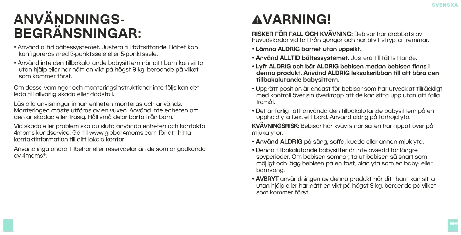 - Använd inte den tillbakalutande babysittern när ditt barn kan sitta utan hjälp eller har nått en vikt på högst 9kg, beroende på vilket som kommer först. Om dessa varningar och monteringsinstruktioner inte följs kan det leda till allvarlig skada eller dödsfall. Läs alla anvisningar innan enheten monteras och används. Monteringen måste utföras av en vuxen. Använd inte enheten om den är skadad eller trasig. Håll små delar borta från barn. Vid skada eller problem ska du sluta använda enheten och kontakta 4moms kundservice. Gå till www.global.4moms.com för att hitta kontaktinformation till ditt lokala kontor. Använd inga andra tillbehör eller reservdelar än de som är godkända av 4moms®. VARNING! RISKER FÖR FALL OCH KVÄVNING: Bebisar har drabbats av huvudskador vid fall från gungor och har blivit strypta i remmar.