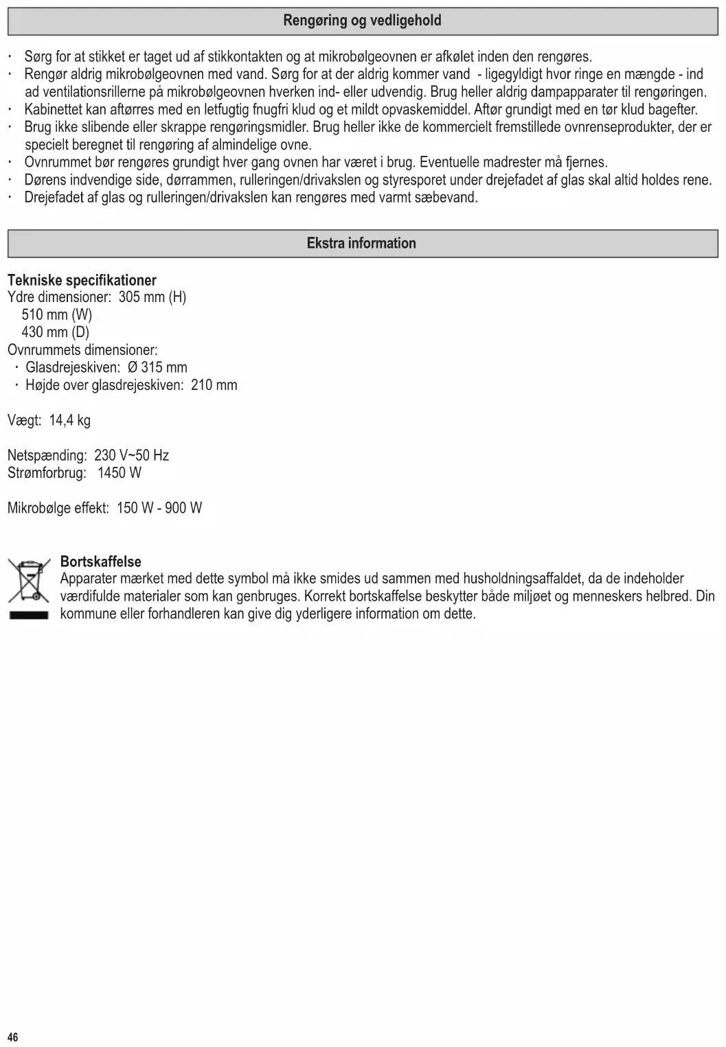 Timer ∙ Timern har två skalor. Den yttre skalan är för upptining enligt vikt i kg. Den inre skalan används för att ställa in kok- eller uppvärmningstider. ∙ Genom att använda timern kan en användningstid på upp till 35 minuter väljas. ∙ När du ställer in en koktid på mindre än 5 minuter (eller för mängder mindre än 350 g) bör du först vrida knappen till ett högre värde och sedan långsamt tillbaka till den önskade inställningen. ∙ När timern är inställd startar mikrovågsugnen automatiskt när luckan stängs. ∙ Du kan stänga av mikrovågsugnen när som helst genom att vrida timern tillbaka till ‘0’. ∙ För att tina upp mat ställer du in effektväljaren på ’Defrosting’ dvs upptining. Använd timerns yttre skala för att ställa in vikt på den mat som skall tinas upp. De justerbara inställningarna för upptining är ungefärliga och kan skilja sig från dem som faktiskt krävs. Om upptiningen inte är färdig efter att tiden gått ut kan du upprepa processen med en kortade tidsinställning. Användningsförlopp ∙ Placera maten som skall värmas i ett lämpligt kärl. Placera kärlet på ugnens roterande platta. ∙ När livsmedel behandlas med mikrovågor bör de täckas över för att inte torka ut. Glas- eller plasthuvor ämnade för användning i mikrovågsugn nns i de esta affärer som säljer köksutrustning. ∙ Använd effektväljaren för att ställa in den önskade effektnivån. ∙ Stäng luckan och ställ in användningstiden med timern. Glasplattan börjar rotera under användningen och ugnslampan förblir tänd. ∙ Om du öppnar luckan under tillagningen (t.ex. för att röra om i maten) avstängs funktionerna automatiskt och återupptas när luckan stängs igen. ∙ När den förprogrammerade tiden har gått ut, hörs en ljudsignal och ugnslampan släcks. Lampan släcks också när luckan öppnas. ∙ Öppna luckan och tag ut kärlet med mat. ∙ Låt maten stå några minuter efter värmningen så att värmen sprider sig jämnt. Skötsel och rengöring ∙ Innan du rengör apparaten, bör du se till den inte är kopplad till eluttaget och att den har svalnat fullständigt. ∙ Rengör inte ugnen med vatten. Låt inte vatten – oavsett hur liten vattenmängden är – komma in i ventilationsöppningarna på in- och utsidan av ugnen. Använd inga ångapparater för att rengöra ugnen. ∙ Hela mikrovågsugnen kan avtorkas med en lätt fuktad luddfri trasa och ett milt rengöringsmedel. Torka torrt efteråt. ∙ Använd inga slipmedel eller starka rengöringsmedel. Kommersiellt framställda ugnsrengöringsprodukter för vanliga ugnar, exempelvis spray, får inte användas. ∙ De inre ytorna måste rengöras noggrant efter varje användning. Eventuella matrester bör avlägsnas. ∙ Insidan av dörren, dörrkarmen, rullringen/drivenheten och skenorna under glasplattan måste alltid hållas rena. ∙ Glasplattan och rullringen/drivenheten kan rengöras med varmt diskvatten.52 142 x 208 mm Ytterligare information Teknisk specikation Yttre dimensioner: 305 mm höjd 510 mm bredd 430 mm djup Inre dimensioner: ∙ glasplatta: Ø 315 mm ∙ fritt utrymme ovanför glasplattan: 210 mm Ugnens vikt: 14,4 kg Nätspänning: 230 V~ 50 Hz Effektförbrukning: 1450 W Mikrovågseffekt: 150 W - 900 W Avfallshantering Enheter märkta med denna symbol måste kasseras separat från hushållsavfallet, eftersom de innehåller värdefulla material som kan återvinnas. Korrekt avfallshantering skyddar miljön och människors hälsa. Din lokala myndighet eller återförsäljare kan ge information i ärendet.53 142 x 208 mm Mikroaaltouuni Hyvä Asiakas, Lue seuraavat ohjeet huolellisesti ennen mikrouunin käyttämistä. Talleta ohjeet vastaisen varalle. Laitetta saavat käyttää vain henkilöt, jotka ovat tutustuneet näihin ohjeisiin. Laitteen osat