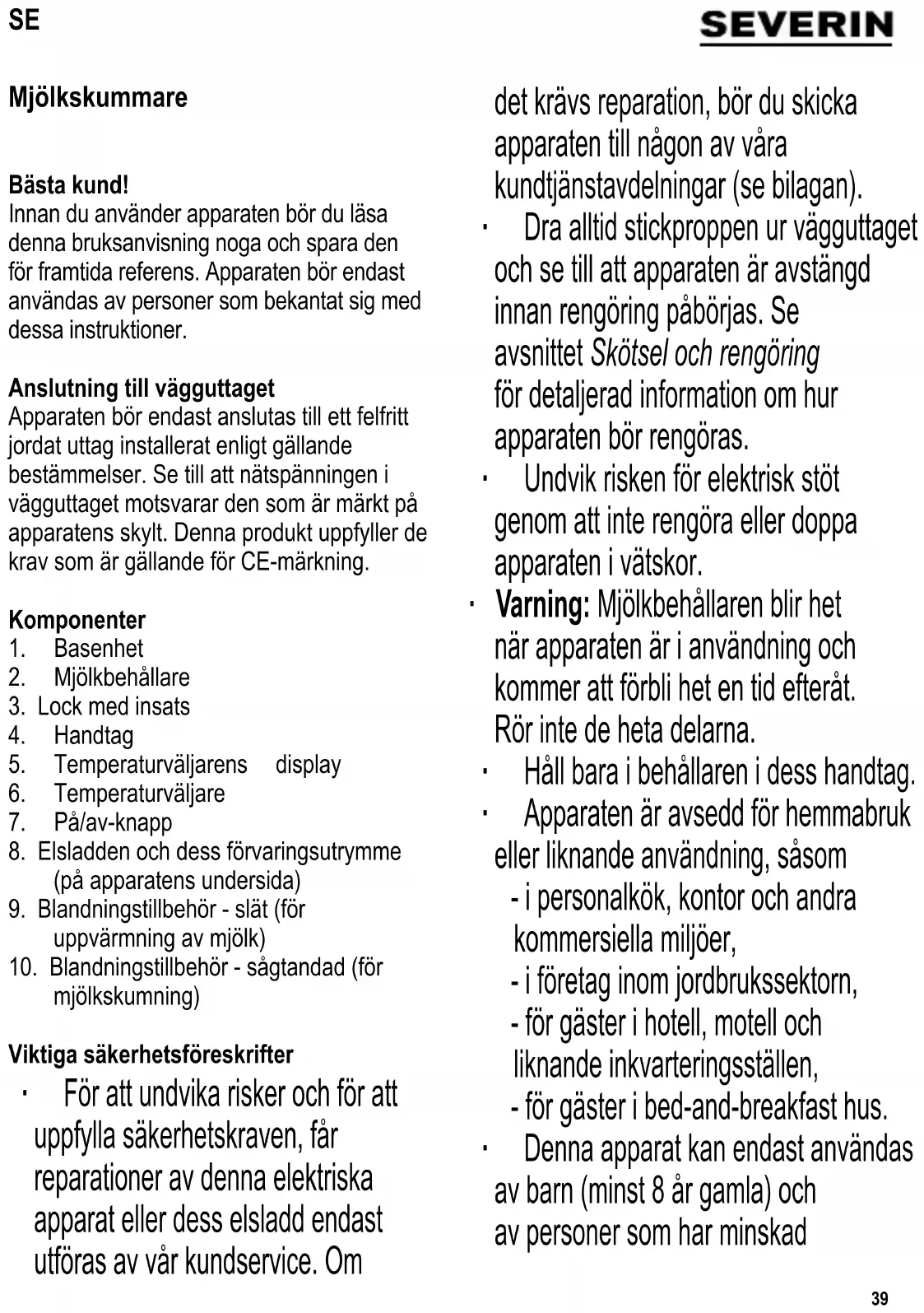basenheten. Använd en lämplig sked för att ta vara på mjölkskummet. Kylningssystemet fortsätter sin funktion ännu en kort stund. Temperatursignallampan slutar blinka efter ca tre minuter. Elsladdens stickpropp kan nu dras ur vägguttaget.42 Anmärkningar Då apparaten är ansluten till eluttaget bör du trycka på på/av-knappen två gånger för att starta en ny användningsomgång. Efter en uppvärmningsomgång kan inte apparaten starta en ny blandnings- och uppvärmningsomgång genast utan måste svalna först. Efter en skumningomgång med kall mjölk kan du starta en ny blandnings- och uppvärmningsomgång genast. Göra choklad Med denna apparat kan du också göra chokladdrycker. Följ beskrivningen i avsnittet Värma upp eller skumma mjölk. Montera på det släta blandningstillbehöret och ställ temperaturväljaren på 45° C. Så snart som mjölken värmts till 45° C (enligt pipsignalerna) tar du bort lockets insats och tillsätter önskad mängd kakaopulver. Ställ nu in temperaturväljaren på 65° C och tryck på på/av- knappen igen. Undvik att använda riven choklad eller chokladfl ingor eftersom de kan leda till blockering eller stopp i apparaten. Avbrytande eller avslutning av en process Tryck på på/av-knappen för att avsluta en uppvärmnings- och blandningsprocess: Huvudsignallampan börjar blinka och motorkylningssystemet startar. Fortsätt uppvärmnings- och blandningsprocessen genom att trycka på på/av-knappen igen. Tips Du får tjockare skum genom att först göra en skumningsomgång med kall mjölk och därefter en omgång med varm mjölk. Skötsel och rengöring ∙ Tag alltid stickproppen ur vägguttaget och vänta tills motorn har stannat helt innan du rengör apparaten. ∙ Undvik risken för elstöt genom att inte rengöra basenheten eller elsladden med vatten och sänk inte ner dem i vatten. ∙ Behållaren, blandartillbehören och locket kan diskas med varmt vatten och ett milt diskmedel efter varje användning, eller i diskmaskin. Vid behov kan det sågtandade tillbehöret rengöras med en lämplig borste. ∙ Torka alla delar helt torra. ∙ Basenheten kan rengöras med en mjuk fuktad duk och en liten mängd diskmedel. ∙ Använd inga slipmedel eller starka rengöringsmedel. Avfallshantering Enheter märkta med denna symbol måste kasseras separat från hushållsavfallet, eftersom de innehåller värdefulla material som kan återvinnas. Korrekt avfallshantering skyddar miljön och människors hälsa. Din lokala myndighet eller återförsäljare kan ge information i ärendet. Garanti i Sverige och Finland För material- och tillverkningsfel gäller 2 års garanti räknat från inköpsdagen mot uppvisande av specifi cerat inköpskvitto i överensstämmelse med de allmänna garantivillkoren. Denna garanti inverkar inte på dina lagstadgade rättigheter eller dina lagenliga rättigheter enligt den nationella konsumentskyddslagstiftningen. Ifall apparaten används felaktigt, eller vårdslöst,43 ansvarar den som använder apparaten för eventuella material- och personskador. Tillverkas för: Severin Elektrogeräte GmbH, Tyskland.44 Maitovaahdotin Hyvä Asiakas, Lue seuraavat ohjeet huolellisesti ennen laitteen käyttöä ja säilytä tämä opas tulevaa tarvetta varten. Laitetta saavat käyttää vain henkilöt, jotka ovat tutustuneet näihin ohjeisiin. Verkkoliitäntä Laite tulee liittää määräysten mukaisesti asennettuun, maadoitettuun pistorasiaan. Varmista, että verkkojännite vastaa laitteen arvokilpeen merkittyä jännitettä. Tämä tuote on kaikkien voimassa olevien CE-merkintöjä koskevien direktiivien mukainen. Osat