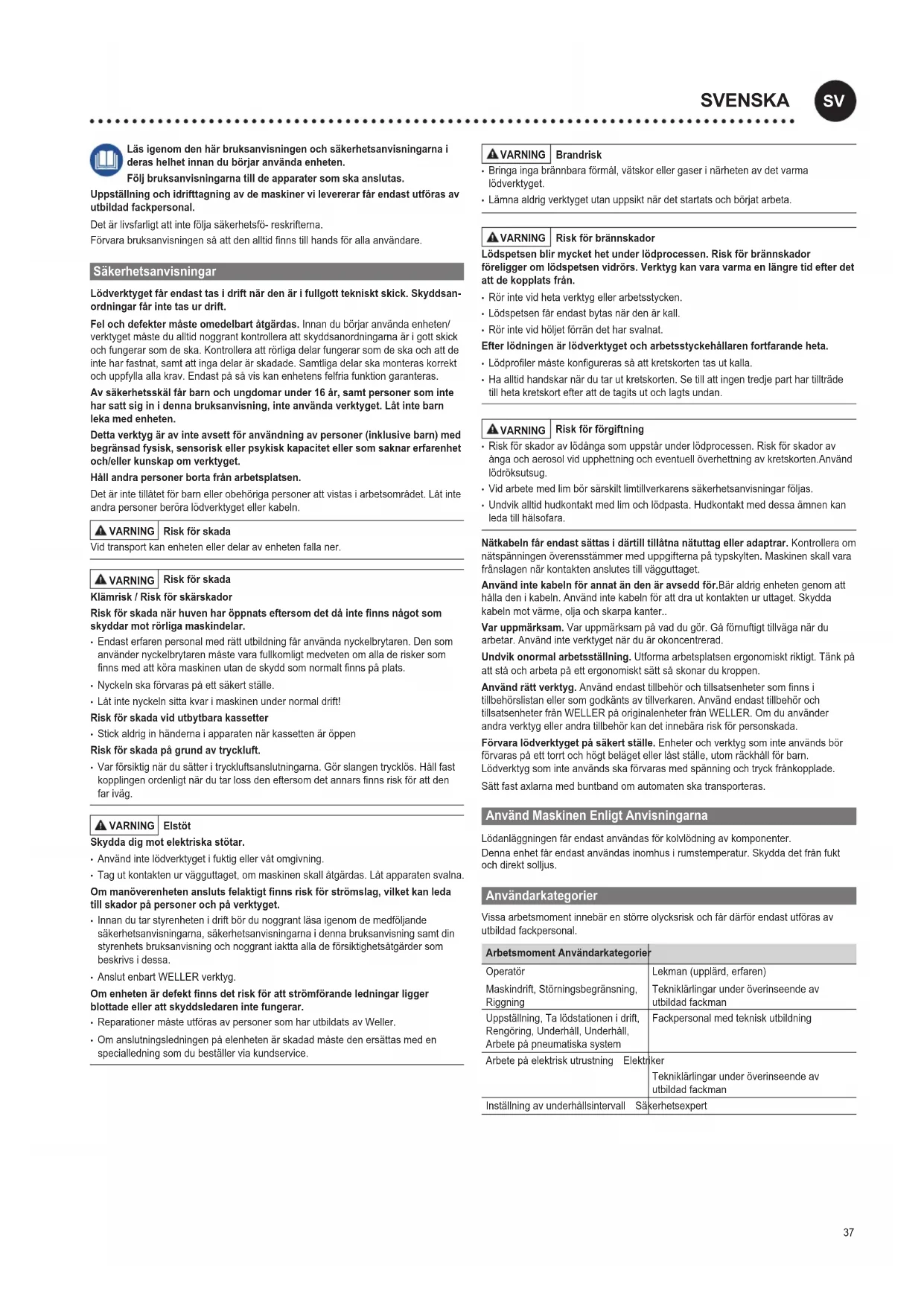 - Undvik alltid hudkontakt med lim och lödpasta. Hudkontakt med dessa ämnen kan leda till hälsofara. Nätkabeln får endast sättas i därtill tillåtna nätuttag eller adaptrar. Kontrollera om nätspänningen överensstämmer med uppgifterna på typskylten. Maskinen skall vara frånslagen när kontakten anslutes till vägguttaget. Använd inte kabeln för annat än den är avsedd för.Bär aldrig enheten genom att hålladenikabeln.Användintekabelnförattdrautkontaktenuruttaget.Skydda kabeln mot värme, olja och skarpa kanter.. Var uppmärksam. Varuppmärksampåvaddugör.Gåförnuftigttillväganärdu arbetar.Användinteverktygetnärduärokoncentrerad. Undvik onormal arbetsställning. Utformaarbetsplatsenergonomisktriktigt.Tänkpå attståocharbetapåettergonomisktsättsåskonardukroppen. Använd rätt verktyg. Användendasttillbehörochtillsatsenhetersomnnsi tillbehörslistan eller som godkänts av tillverkaren. Använd endast tillbehör och tillsatsenheterfrånWELLERpåoriginalenheterfrånWELLER.Omduanvänder andraverktygellerandratillbehörkandetinnebärariskförpersonskada. Förvara lödverktyget på säkert ställe.Enheterochverktygsominteanvändsbör förvaraspåetttorrtochhögtbelägetellerlåstställe,utomräckhållförbarn. Lödverktygsominteanvändsskaförvarasmedspänningochtryckfrånkopplade. Sätt fast axlarna med buntband om automaten ska transporteras. Använd Maskinen Enligt Anvisningarna Lödanläggningenfårendastanvändasförkolvlödningavkomponenter. Dennaenhetfårendastanvändasinomhusirumstemperatur.Skyddadetfrånfukt och direkt solljus. Användarkategorier Vissaarbetsmomentinnebärenstörreolycksriskochfårdärförendastutförasav utbildad fackpersonal. Arbetsmoment Användarkategorier Operatör Maskindrift, Störningsbegränsning, Riggning Lekman (upplärd, erfaren) Tekniklärlingar under överinseende av utbildad fackman Uppställning, Ta lödstationen i drift, Rengöring,Underhåll,Underhåll, Arbetepåpneumatiskasystem Fackpersonal med teknisk utbildning Arbetepåelektriskutrustning Elektriker Tekniklärlingar under överinseende av utbildad fackman Inställningavunderhållsintervall Säkerhetsexpert