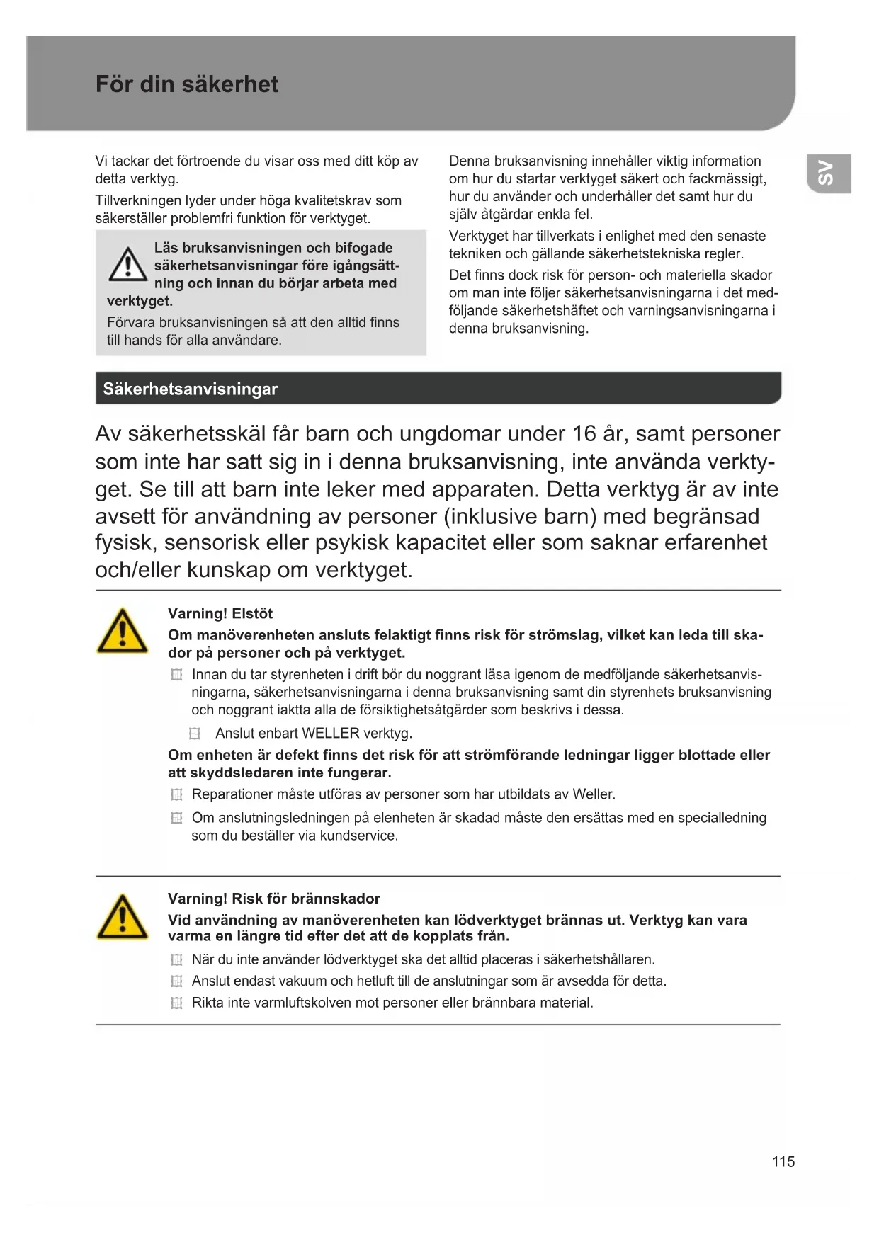 NL113 Foutmeldingen en verhelpen van fouten Melding/symptoom Mogelijke oorzaak Maatregelen om het probleem te verhelpen Indicatie „- - -“ Werktuig werd niet herkend Werktuig defect Aansluiting van het werktuig aan het toestel controleren Aangesloten werktuig controleren Geendisplayfunctie(displayuit) Geen netspanning voorhanden Netschakelaar inschakelen. Netspanning controleren. Toestelzekering controleren. Geen vacuüm aan het soldeerru- imwerktuig Vakuum nicht angeschlossen Soldeerruimmond verstopt. Pomp defect Vacuümslang aan de vacuümaansluiting aansluiten Soldeerruimmond met reinigingswerktuig onder- houden. Ontoereikend vacuüm aan het soldeerruimwerktuig Filterpatroon aan het soldeerruimwerktuig vol Hoofdltervol Filterpatroon aan het soldeerruimwerktuig vervangen Hoofdlterelementaanhet soldeerstation vervangen Geen lucht aan de heteluchtbout Luchtslang niet aangesloten Hoofdltervol Luchtslang aansluiten of controleren Hoofdlterelementaanhet soldeerstation vervangen Technische Gegevens NL114 Symbolen Attentie! Bedieningshandleidinglezen! Voor het uitvoeren van alle werk- zaamheden aan het toestel altijd de stekker uit het stopcontact trekken. ESD-conform design en ESD- conforme werkplek Potentiaalvereffening CE-teken Britssymboolvanovereenstemming Zekering Veiligheidstransformator Solderen Soldeerruimen Hete lucht Afvoer Afgedankte elektrische en elektroni- sche apparatuur moeten gescheiden ingezameld en afgevoerd worden. Verwijder de verlichtingsmiddelen uit de apparatuur voordat u deze afvoert. Informeer bij uw gemeente of bij uw vakhandelaarnaarrecyclingbedrijven en inzamelpunten. Al naargelang de lokaal van toepassing zijnde voor- schriften kunnen detailhandelaren ver- plicht zijn om afgedankte elektrische en elektronische apparatuur kosteloos terug te nemen. Geef uw afgedankte elektrische en elektronische appara- tuurafvoorrecyclingenhelpzomee om de behoefte aan grondstoffen te verminderen. Afgedankte elektrische en elektronische apparatuur bevatten waardevolle,recyclebarematerialen die, mits ze niet milieuvriendelijk wor- den afgevoerd, negatieve gevolgen kunnen hebben voor het milieu en uw gezondheid. Verwijder persoonlijke ge- gevens van uw afgedankte apparatuur voordat u deze afvoert. Vervuildeltersmoetenalsgevaarlijkaf- val worden behandeld. Voer vervan- gentoestelonderdelen,ltersofoude toestel conform de voorschriften van uw land af. Garantie Aanspraak op garantie van de koper verjaart een jaar na levering van het product. Dit geldt niet voor regresrecht van de koper volgens §§ 478, 479 BGB. Voor een door ons verleende garantie zijn we alleen aansprakelijk als de kwaliteits- of houdbaar- heidsgarantie door ons schriftelijk en met vermel- ding van het begrip „Garantie“ afgegeven werd. De garantie vervalt bij ondeskundig gebruik en als doorongekwaliceerdepersoneningrepenuitgevo- erd werden. Technischewijzigingenvoorbehouden! Gelieve u te informeren op www.weller-tools.com. Technische Gegevens NL115 För din säkerhet Vi tackar det förtroende du visar oss med ditt köp av dettaverktyg. Tillverkningenlyderunderhögakvalitetskravsom säkerställerproblemfrifunktionförverktyget. Läs bruksanvisningen och bifogade säkerhetsanvisningar före igångsätt- ning och innan du börjar arbeta med verktyget. Förvarabruksanvisningensåattdenalltidnns till hands för alla användare. Denna bruksanvisning innehåller viktig information omhurdustartarverktygetsäkertochfackmässigt, hur du använder och underhåller det samt hur du själv åtgärdar enkla fel. Verktygethartillverkatsienlighetmeddensenaste tekniken och gällande säkerhetstekniska regler. Detnnsdockriskförperson-ochmateriellaskador om man inte följer säkerhetsanvisningarna i det med- följande säkerhetshäftet och varningsanvisningarna i denna bruksanvisning. Säkerhetsanvisningar Av säkerhetsskäl får barn och ungdomar under 16 år, samt personer sominteharsattsiginidennabruksanvisning,inteanvändaverkty- get.Setillattbarnintelekermedapparaten.Dettaverktygäravinte avsett för användning av personer (inklusive barn) med begränsad fysisk,sensoriskellerpsykiskkapacitetellersomsaknarerfarenhet och/ellerkunskapomverktyget. Varning! Elstöt Om manöverenheten ansluts felaktigt nns risk för strömslag, vilket kan leda till ska- dor på personer och på verktyget. Innandutarstyrenhetenidriftbördunoggrantläsaigenomdemedföljandesäkerhetsanvis- ningarna,säkerhetsanvisningarnaidennabruksanvisningsamtdinstyrenhetsbruksanvisning och noggrant iaktta alla de försiktighetsåtgärder som beskrivs i dessa. AnslutenbartWELLERverktyg. Om enheten är defekt nns det risk för att strömförande ledningar ligger blottade eller att skyddsledaren inte fungerar. Reparationer måste utföras av personer som har utbildats av Weller. Om anslutningsledningen på elenheten är skadad måste den ersättas med en specialledning som du beställer via kundservice. Varning! Risk för brännskador Vid användning av manöverenheten kan lödverktyget brännas ut. Verktyg kan vara varma en längre tid efter det att de kopplats från. Närduinteanvänderlödverktygetskadetalltidplacerasisäkerhetshållaren. Anslut endast vakuum och hetluft till de anslutningar som är avsedda för detta. Rikta inte varmluftskolven mot personer eller brännbara material. SV116 Varning! Brand- och explosionsrisk! Brandrisk på grund av heta verktyg Närduinteanvänderlödverktygetskadetalltidplacerasisäkerhetshållaren. Rikta inte varmluftskolven mot personer eller brännbara material. Håll explosiva och antändliga föremål på avstånd. Täckinteöververktyget. Varning! Risk för skada Vid transport kan enheten eller delar av enheten falla ner. Använd Maskinen Enligt Anvisningarna FörsörjningsenhetWELLERlödverktyg. Använd endast reparationsstationen enligt de metoder och villkor för lödning och avlödning som anges i bruksanvisningen. Brandfarliga gaser och vätskor får inte sugas ut. Verktygetfårenbartdrivasmedkor- rektisattaochförver
