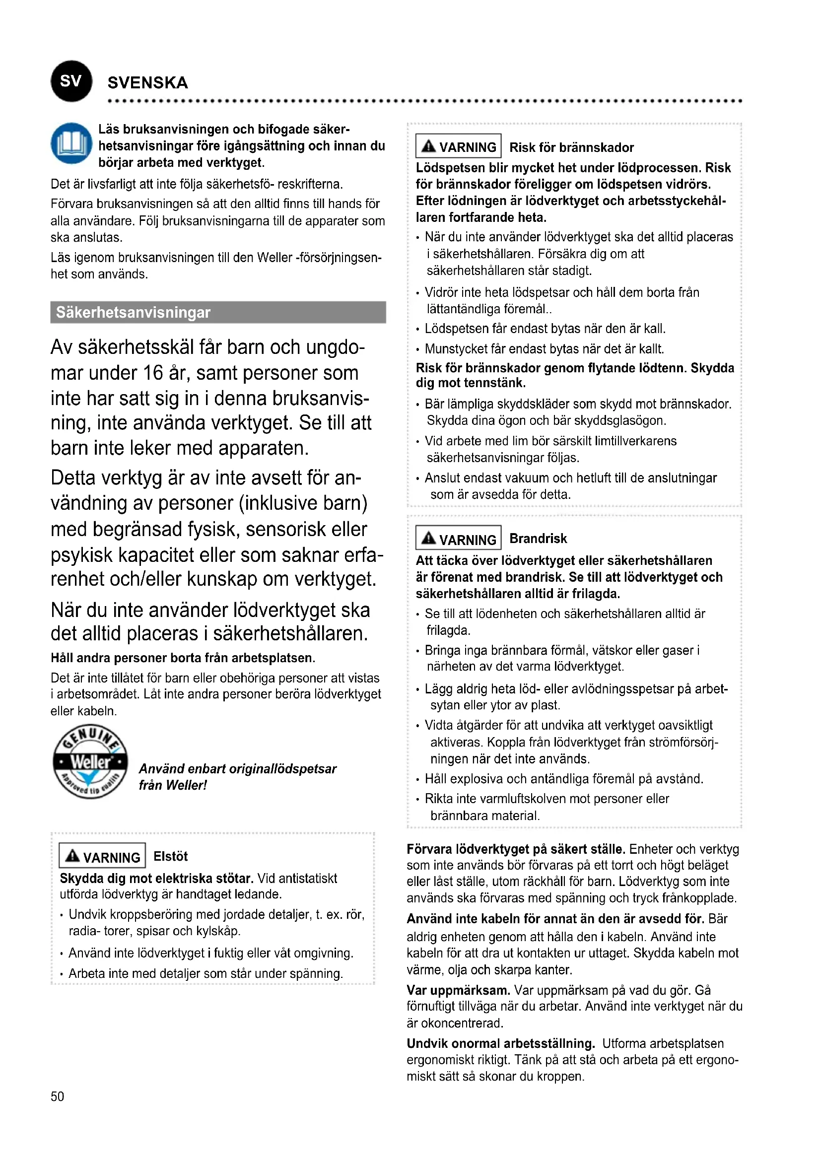 renhet och/eller kunskap om verktyget. När du inte använder lödverktyget ska det alltid placeras i säkerhetshållaren. Håll andra personer borta från arbetsplatsen. Det är inte tillåtet för barn eller obehöriga personer att vistas i arbetsområdet. Låt inte andra personer beröra lödverktyget eller kabeln. Använd enbart originallödspetsar från Weller! VARNING Elstöt Skydda dig mot elektriska stötar. Vid antistatiskt utförda lödverktyg är handtaget ledande.
