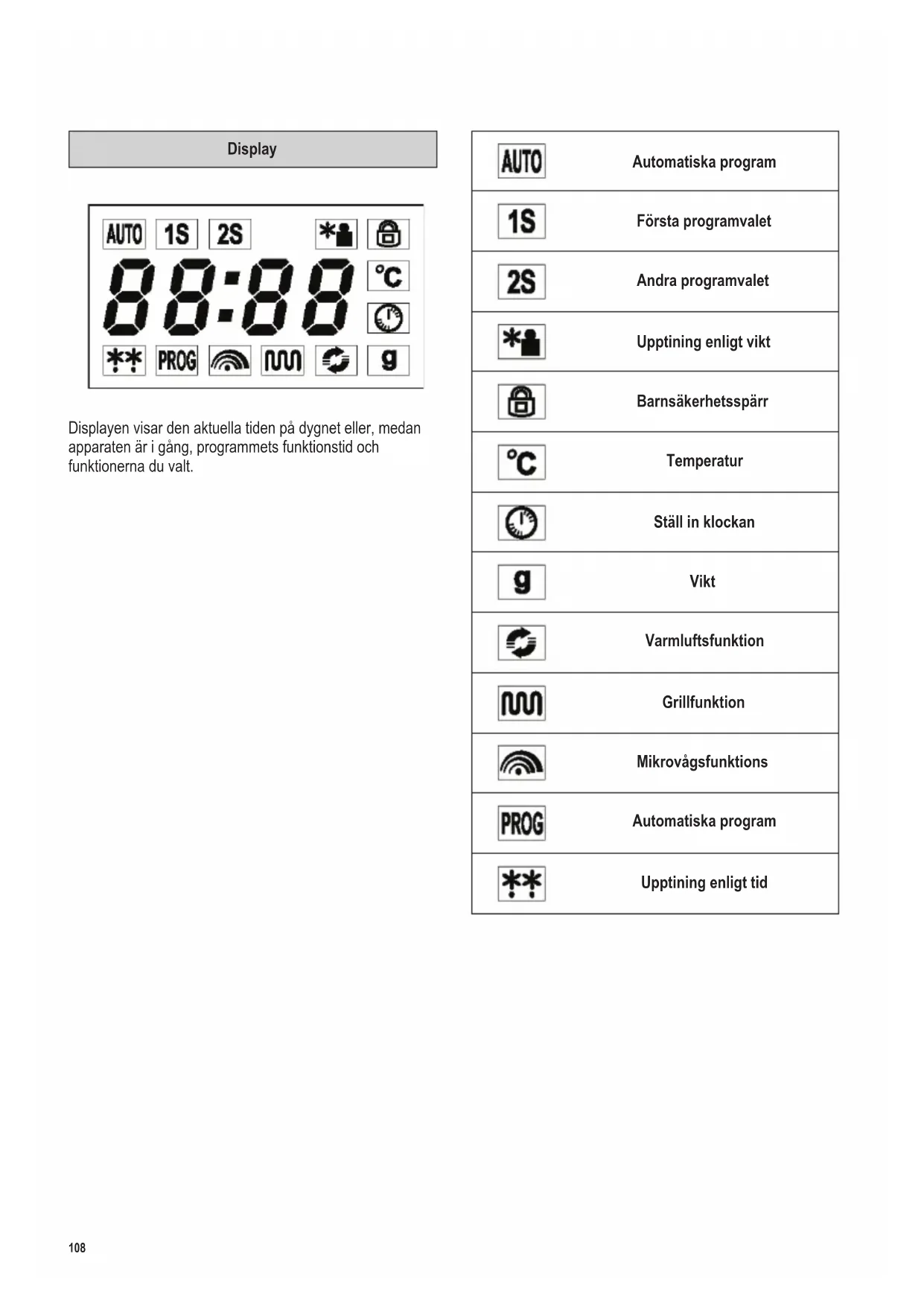 SE107 142 x 208 mm Kontrollpanelens detaljer Knapp Funktion Knappljud & Barnsäkerhetsspärr Favoriträtt & Klocka Snabbstart / Öka tillagningstiden med 30 sekunder Mikrovågor Grill Varmluft Avbryta / Stanna Vridreglage Funktion Tryck Start / Snabbstart Vrid Tid & Automatiska matlagningsprogram108 142 x 208 mm Display Displayen visar den aktuella tiden på dygnet eller, medan apparaten är i gång, programmets funktionstid och funktionerna du valt. Automatiska program Första programvalet Andra programvalet Upptining enligt vikt Barnsäkerhetsspärr Temperatur Ställ in klockan Vikt Varmluftsfunktion Grillfunktion Mikrovågsfunktions Automatiska program Upptining enligt tid109 142 x 208 mm Säkerhetsinstruktioner Viktiga säkerhetsinstruktioner Vänligen läs följande instruktioner noggrant och behåll denna bruksanvisning för framtida referens. Anslutning till vägguttaget Ugnen får endast anslutas till godkänt jordat vägguttag. Se till att nätspänningen i vägguttaget motsvarar den som är märkt på apparatens skylt. Denna produkt uppfyller de krav som är gällande för CE-märkning. Enhetens placering ∙ Placera alltid mikrovågsugnen på en stabil och jämn värmebeständig yta och se till att apparaten är skyddad från eventuella värmekällor och extremt hög fuktighet. ∙ Använd inte apparaten utomhus. ∙ Fötterna på ugnens undersida bör inte tas bort. ∙ Se alltid till att ventilationen är tillräcklig. Placera inga föremål ovanpå ugnen och se till att det fria avståndet mellan ugnen och väggen eller andra föremål är minst följande: Sidorna: 7,5 cm Bakom: 7,5 cm Ovanför: 30,0 cm Enheten får inte installeras inuti ett skåp; placera den inte heller direkt under ett skåp eller dylika föremål. Viktigt att veta ∙ Varning: Vissa typer av matprodukter kan fatta eld. Lämna under inga omständigheter apparaten utan tillsyn när någon av mikrovågs-, grill-, varmlufts- eller kombinationsfunktionerna är i användning. ∙ Denna mikrovågsugn är endast ämnad för upptining, värmning och tillagning av mat. Varning: Försök att värma upp torra matprodukter eller kläder, värmedynor, tofor, tvättsvampar, våta rengöringsdukar etc. kan leda till förbränningsskador eller eldsvåda. ∙ Inget ansvar accepteras för skada som uppstått genom otillbörlig användning eller om dessa instruktioner inte åtföljts. ∙ Använd endast kärl lämpliga för användning i mikrovågsugn. Använd inte behållare av metall när du värmer upp mat eller dryck med mikrovågsfunktionen. För mer information, se avsnittet ’Använd alltid lämpliga kokkärl’. ∙ Apparaten bör inte användas med hjälp av en extern timer eller separat fjärrkontroll.110 142 x 208 mm ∙ Denna apparat kan användas av barn (minst 8 år gamla) och av personer som har minskad fysisk rörelseförmåga, reducerat sinnes- eller mentaltillstånd, eller som har bristfällig erfarenhet och kunskap, förutsatt att dessa personer är under uppsyn eller har fått tillräckliga instruktioner beträffande apparatens användning och vet vilka risker och säkerhetsåtgärder som användningen innefattar. ∙ Barn bör inte tillåtas leka med apparaten. ∙ Barn bör inte tillåtas rengöra eller göra service på apparaten ifall de inte är övervakade och minst 8 år gamla. ∙ Apparaten och dess elsladd bör hållas utom räckhåll för barn under 8 år. ∙ På grund av risken för elektrisk stöt bör apparaten inte rengöras eller doppas i vatten. ∙ Varning: På grund av de höga temperaturerna som uppstår vid användning av grill- och/eller varmluftsfunktionerna bör barn inte använda apparaten ifall de inte är övervakade av en vuxen. ∙ Under användning av kombinations-, grill-och/eller varmluftsfunktionerna bör du vara extremt noga med att inte röra de inre värmeelementen. ∙ Använd inga ångapparater för att rengöra ugnen. ∙ Stäng alltid av apparaten och dra stickproppen ur vägguttaget: - innan rengöring påbörjas, - om apparaten skulle upphöra att fungera. - efter varje användning. ∙ Ta stickproppen ur vägguttaget genom att dra i stickproppen, aldrig i sladden.