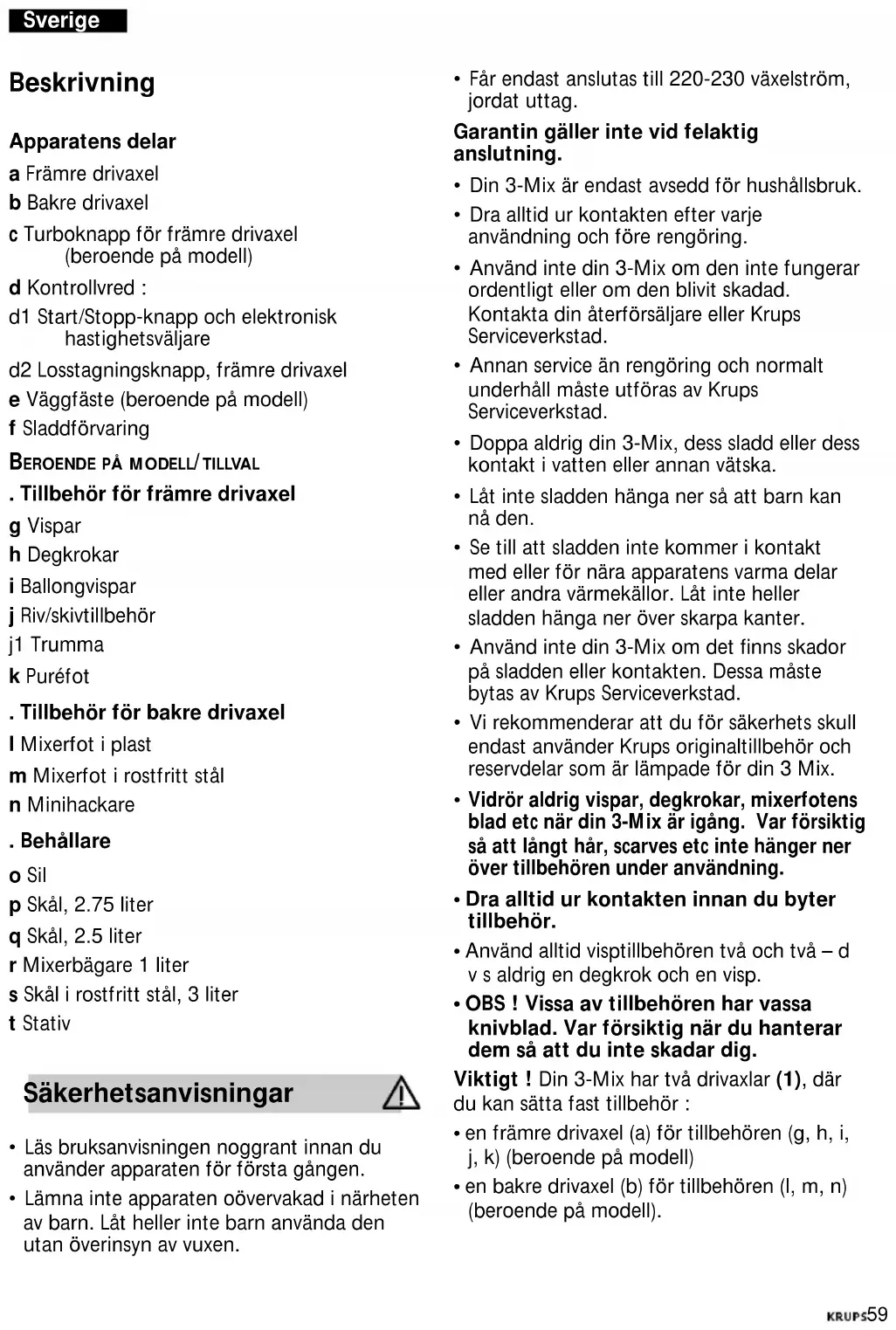 - Vi rekommenderar att du för säkerhets skull endast använder Krups originaltillbehör och reservdelar som är lämpade för din 3 Mix.
