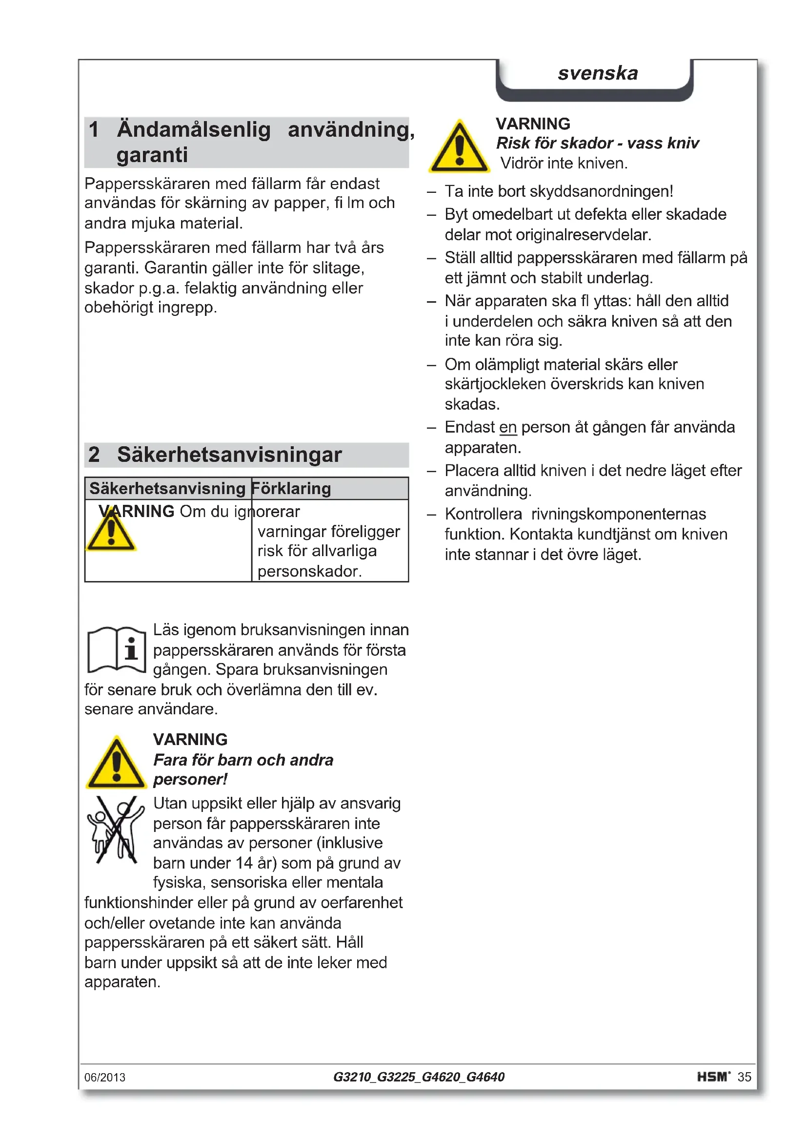 Maks. skærehøjde (mm) 1,0 2,5 2,0 4,0 Maks. format A4 A4 A3 A3 Skærelængde (mm) 325 325 460 460 Presning Manuelt Automatisk Automatisk Automatisk Arbejdsbord (mm) 325 x 155 325 x 230 460 x 230 460 x 320 Mål (mm) 605 x 280 x 75 606 x 308 x 122 737 x 362 x 122 750 x 406 x 133 Vægt (kg) 2,12 3,72 4,66 7,30 Bemærk: For at reducere pladsbehovet under opbevaringen og for at fastgøre kniven under transport af skæremaskinen kan beskyttelsesafskærmningen slås om. Det er dog kun muligt, når kniven befi nder sig i den nederste position.34 G3210_G3225_G4620_G4640 06/2013 dansk06/2013 G3210_G3225_G4620_G4640 35 svenska 1 Ändamålsenlig användning, garanti Pappersskäraren med fällarm får endast användas för skärning av papper, fi lm och andra mjuka material. Pappersskäraren med fällarm har två års garanti. Garantin gäller inte för slitage, skador p.g.a. felaktig användning eller obehörigt ingrepp. 2 Säkerhetsanvisningar Säkerhetsanvisning Förklaring VARNING Om du ignorerar varningar föreligger risk för allvarliga personskador. Läs igenom bruksanvisningen innan pappersskäraren används för första gången. Spara bruksanvisningen för senare bruk och överlämna den till ev. senare användare. VARNING Fara för barn och andra personer! Utan uppsikt eller hjälp av ansvarig person får pappersskäraren inte användas av personer (inklusive barn under 14 år) som på grund av fysiska, sensoriska eller mentala funktionshinder eller på grund av oerfarenhet och/eller ovetande inte kan använda pappersskäraren på ett säkert sätt. Håll barn under uppsikt så att de inte leker med apparaten. VARNING Risk för skador - vass kniv Vidrör inte kniven. – Ta inte bort skyddsanordningen! – Byt omedelbart ut defekta eller skadade delar mot originalreservdelar. – Ställ alltid pappersskäraren med fällarm på ett jämnt och stabilt underlag. – När apparaten ska fl yttas: håll den alltid i underdelen och säkra kniven så att den inte kan röra sig. – Om olämpligt material skärs eller skärtjockleken överskrids kan kniven skadas. – Endast en person åt gången får använda apparaten. – Placera alltid kniven i det nedre läget efter användning. – Kontrollera rivningskomponenternas funktion. Kontakta kundtjänst om kniven inte stannar i det övre läget.36 G3210_G3225_G4620_G4640 06/2013 svenska