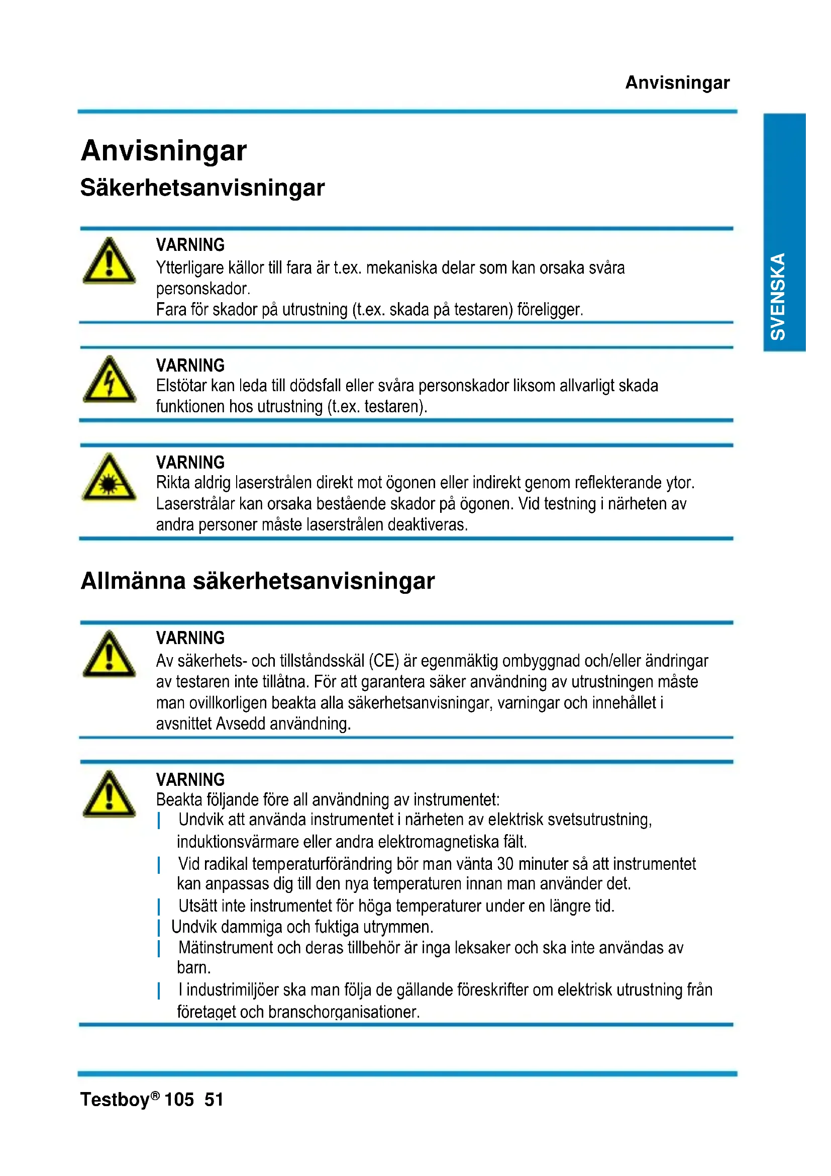 VARNING Beakta följande före all användning av instrumentet: | Undvik att använda instrumentet i närheten av elektrisk svetsutrustning, induktionsvärmare eller andra elektromagnetiska fält. | Vid radikal temperaturförändring bör man vänta 30 minuter så att instrumentet kan anpassas dig till den nya temperaturen innan man använder det. | Utsätt inte instrumentet för höga temperaturer under en längre tid. | Undvik dammiga och fuktiga utrymmen. | Mätinstrument och deras tillbehör är inga leksaker och ska inte användas av barn. | I industrimiljöer ska man följa de gällande föreskrifter om elektrisk utrustning från företaget och branschorganisationer.Anvisningar 52 Testboy