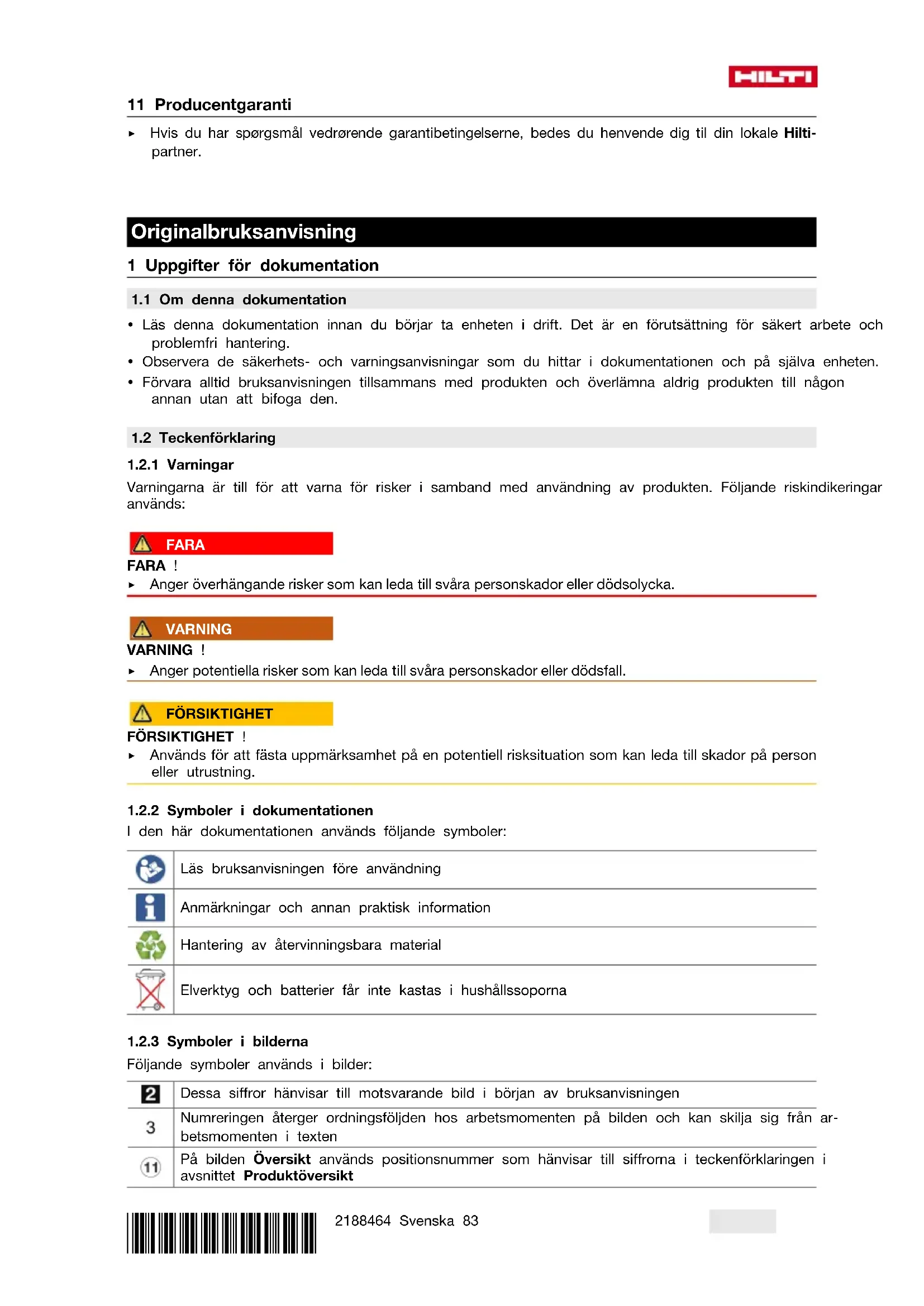 Vi försäkrar på eget ansvar att den produkt som beskrivs här överensstämmer med gällande direktiv och standarder. En bild på försäkran om överensstämmelse hittar du i slutet av dokumentationen. Den tekniska dokumentationen finns sparad här: Hilti Entwicklungsgesellschaft mbH | Zulassung Geräte | Hiltistraße 6 | 86916 Kaufering, Tyskland 2 Säkerhet