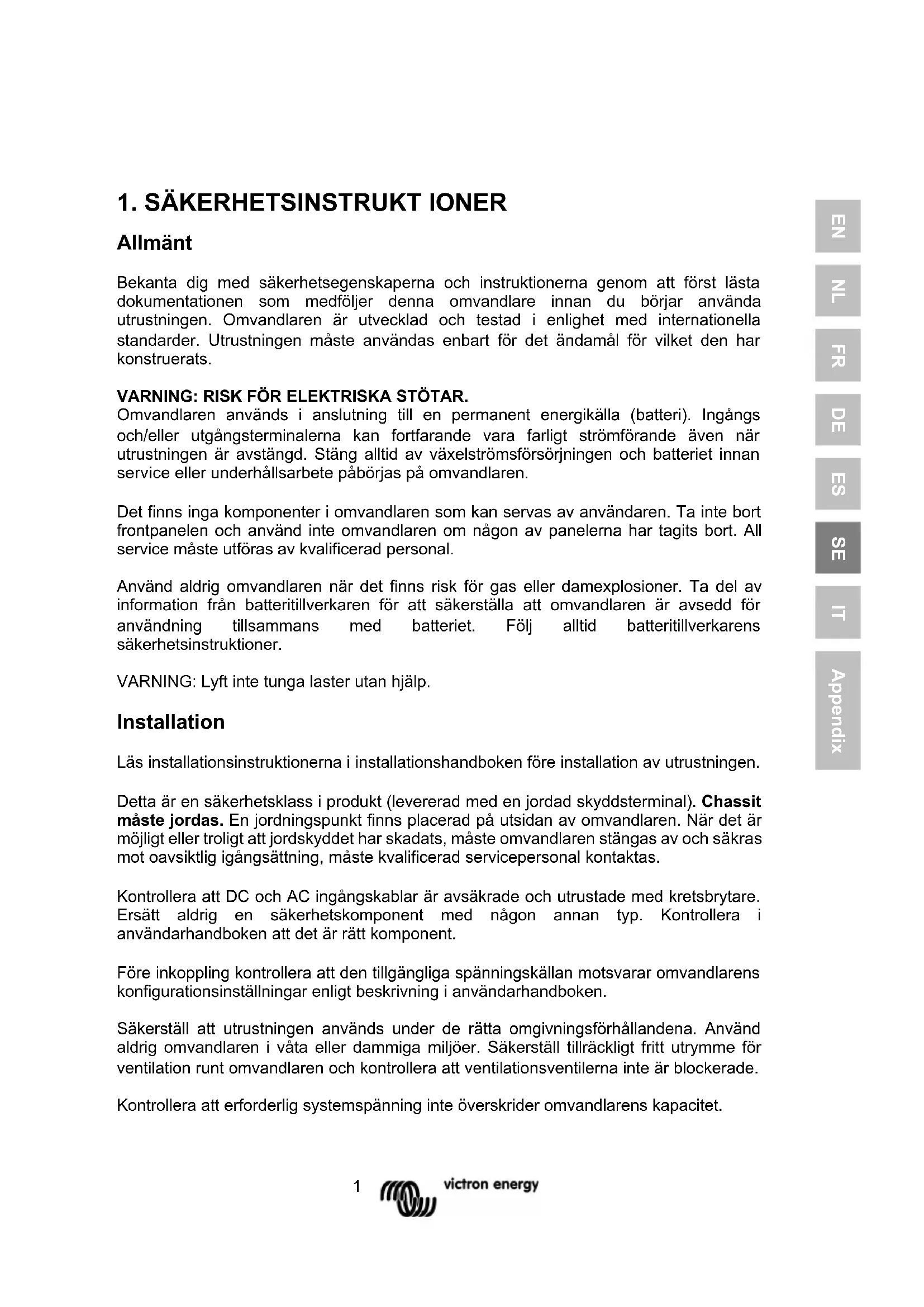 Inställningarna kan enbart utföras av kvalificerad tekniker. Läs instruktionerna noggrant innan ändringarna genomförs. Batterierna bör placeras på en torr och välventilerad plats under laddningen.11 EN NL FR DE ES SE IT Appendix Inställning för sökning (Tillämplig enbart med fristående konfiguration) Om sökinställning är ”on” (på) minskas effektförbrukningen i drift utan last med ca 70 %. I detta läge stängs Compact av när den arbetar i omvandlarläge, i händelse av ingen belastning eller väldigt låg belastning och sätts igång varannan sekund under en kort period. Om utgångsströmmen överskrider en inställd nivå, kommer omvandlaren att fortsätta att fungera. Om inte, kommer omvandlaren att stängas av igen. Sökinställningen kan ställas in med hjälp DIP switch. Söklägets belastningsnivåer ”stäng av” och ”förbli påslagen” kan ställas in med VEConfigure3. Standardinställningen är: Avstängning: 40 Watt (linjär last). Påslagning: 100 Watt (linjär last). AES (Automatic Economy Switch) I stället för sökinställning, kan AES inställning också väljas (enbart med hjälp av VEConfigure3). Om denna inställning aktiveras, minskar strömförbrukningen under drift utan belastning och med låg belastning med ungefär 20 %, genom något minska sinusspänningen. Inte justerbar med DIP switchar. Enbart tillämplig i fristående konfiguration. Programmerbart relä Som standard är det programmerbara reläet inställt som ett larmrelä, dvs. reläet kommer att göras strömlöst i händelse av ett larm eller ett för-larm (växelriktaren är nästan för varm, brumspänningen på ingången är nästan för hög, batterispänningen är nästan för låg). Ej justerbar med DIP-switchar.12