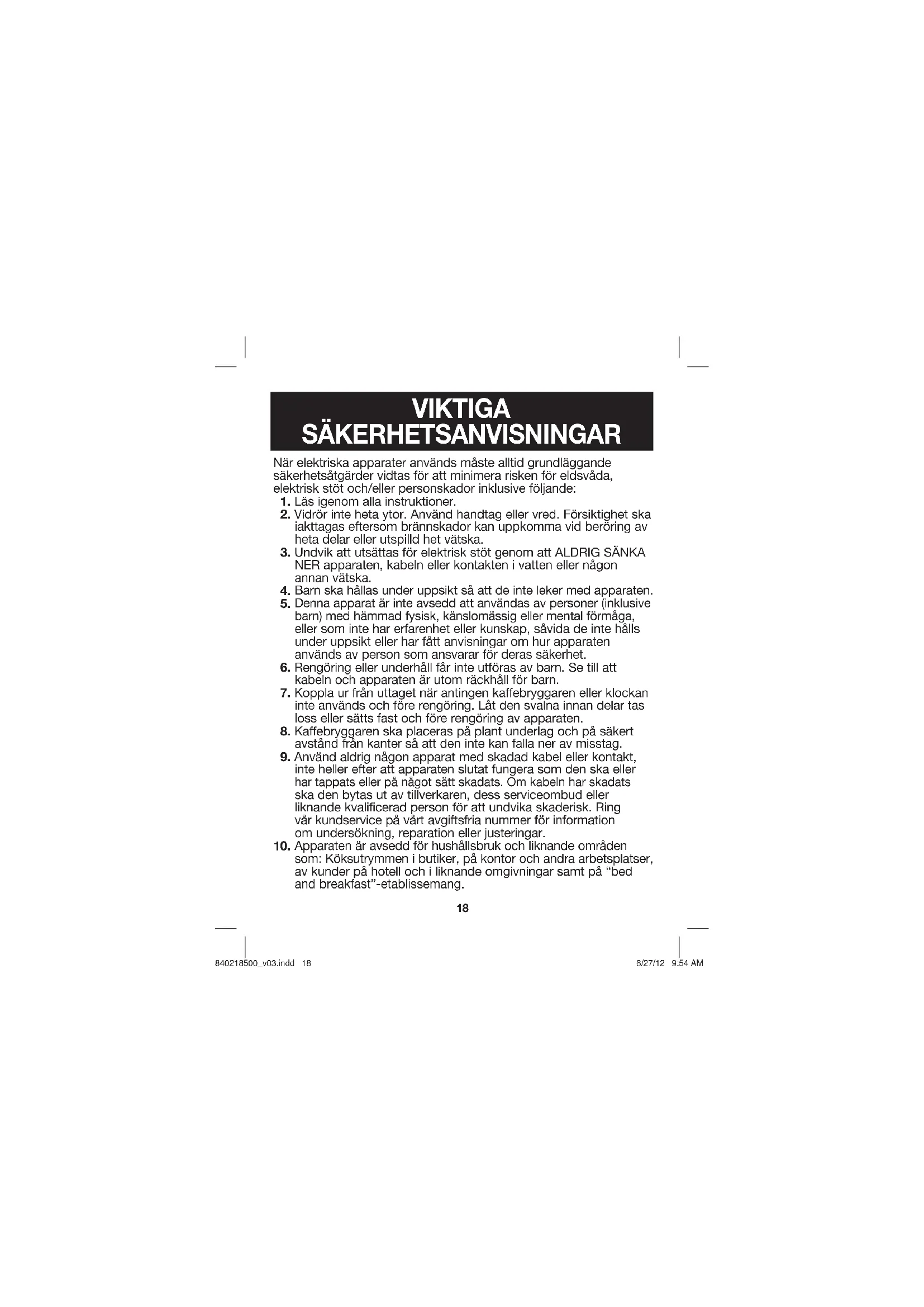Apparaten är avsedd för hushållsbruk och liknande områden som: Köksutrymmen i butiker, på kontor och andra arbetsplatser, av kunder på hotell och i liknande omgivningar samt på “bed and breakfast”-etablissemang. VIKTIGA SÄKERHETSANVISNINGAR 840218500_v03.indd 18840218500_v03.indd 18 6/27/12 9:54 AM6/27/12 9:54 AM19
